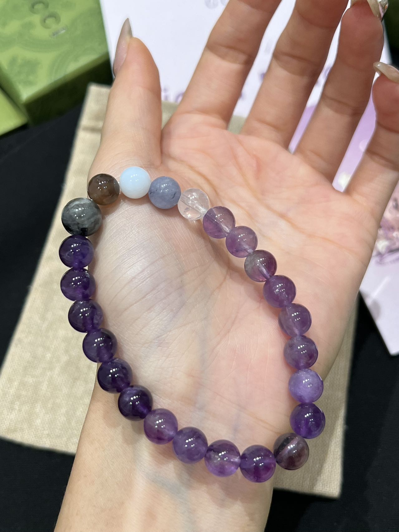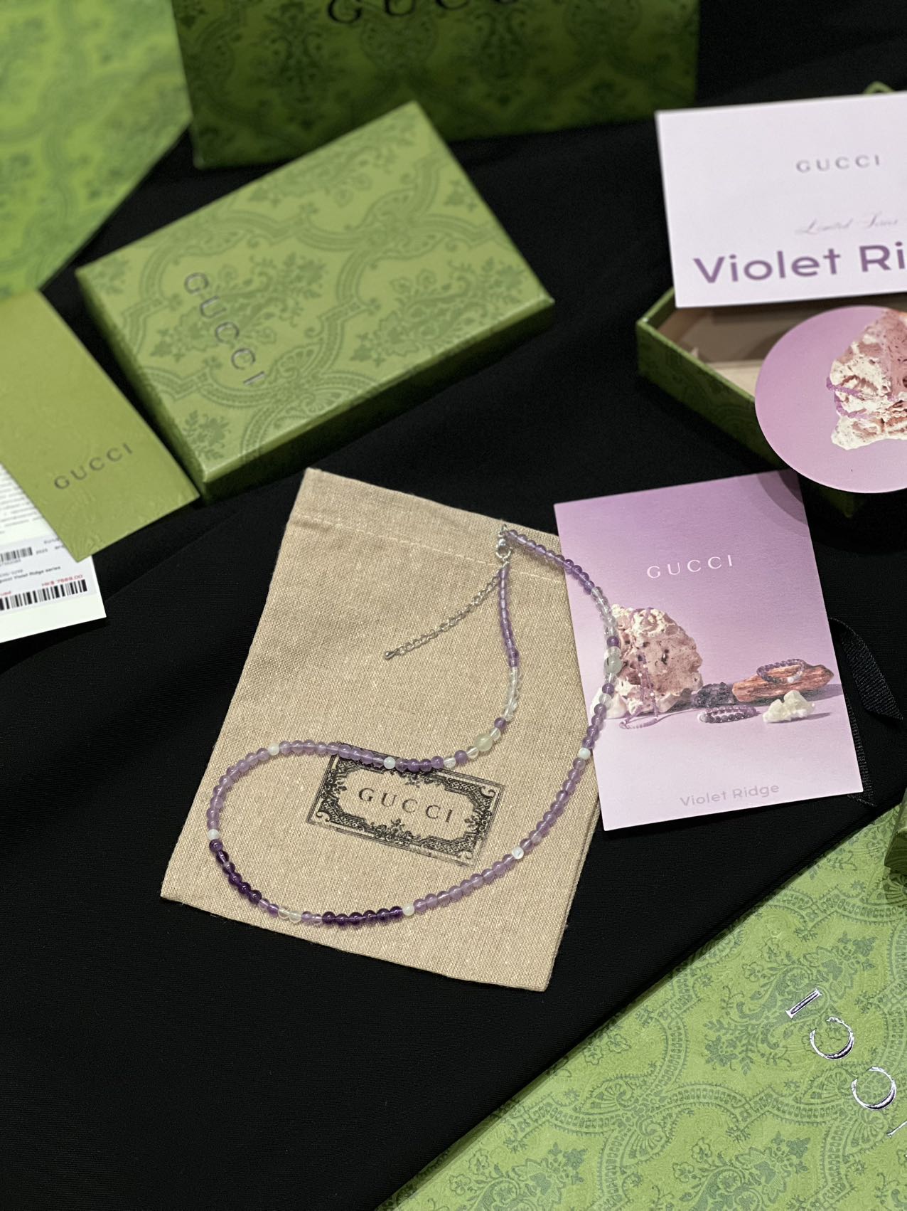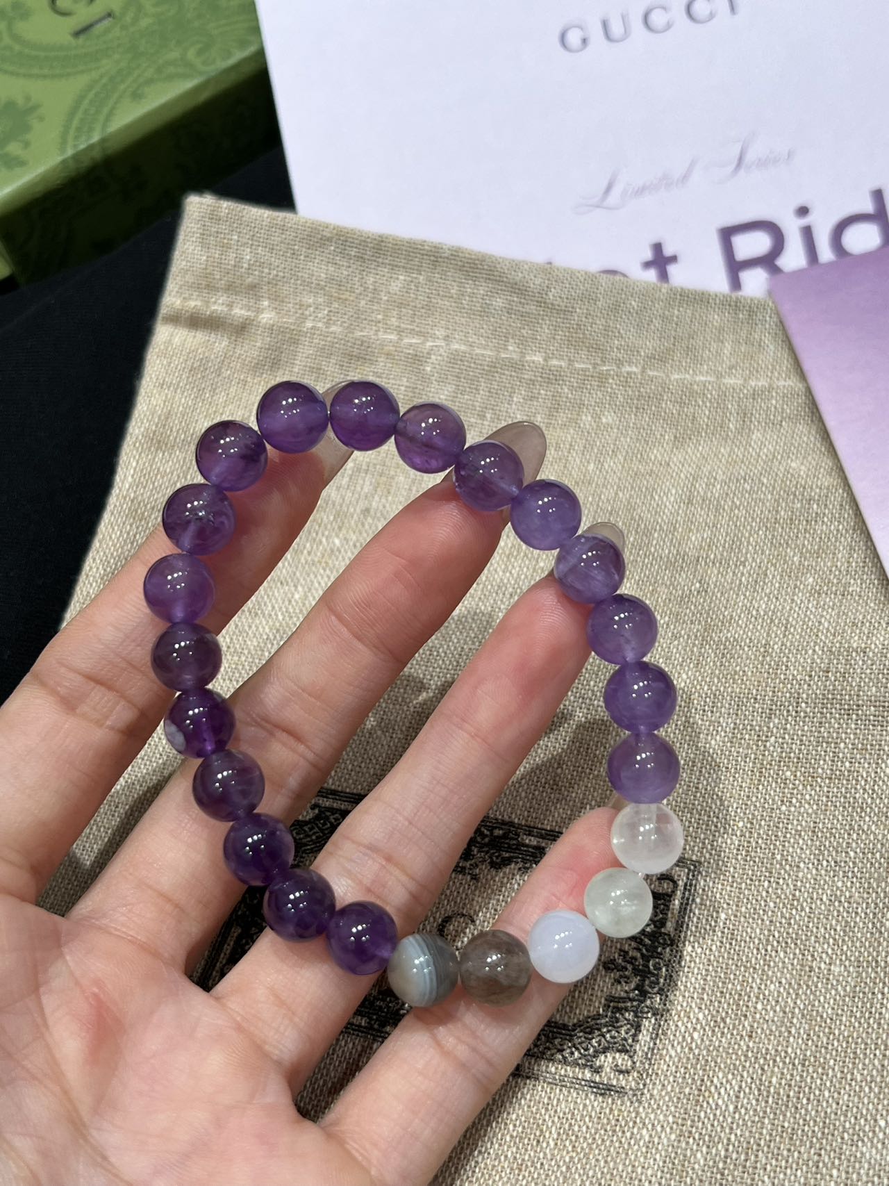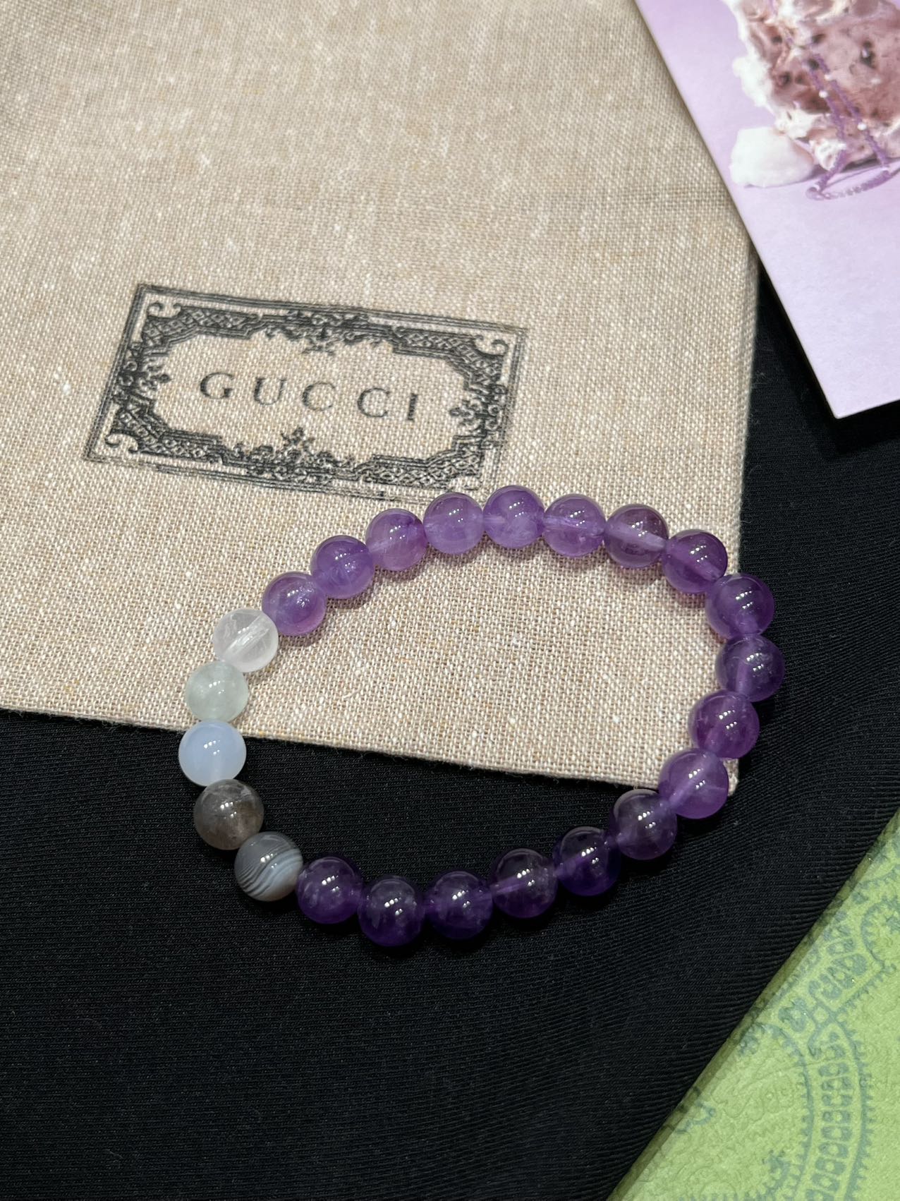古家高级珠宝VioletRidge系列九紫离火手串/项链…今年必入的首饰,优化你的运势,自然之诗,能量之脉!!九紫离火年,一定不能错过的紫色手串!!guc同款高能量紫水晶手串…来,姐妹们!各位大女主们!迅速来补财位,迎接大财入库!九紫离火运是求财和发展的好时机!这个阶段适合佩戴不同的紫色手串,以吸引正能量!是女性崛起转运的时刻!是属于女性的20年!紫色自古便是尊贵与吉祥的象征,它融合了白与蓝的温柔和冷静,既显贵气又不失优雅,散发着深沉的艺术魅力!!⚠️每一颗水晶均由日本京都百年工坊匠人手工甄选,溯源巴西紫晶洞、马达加斯加粉晶矿脉、印尼金曜石岩层,微镶技法串联,让晶石天然裂隙化为光轨,层叠如起伏山脊!整个系列有项链/手串,男女现货,全部原封带芯片!款式:女款手链、男款手链、项链