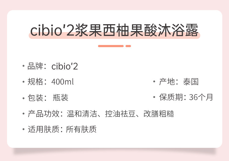 泰国CIBIO'2/希蓓欧 葡萄柚水杨酸沐浴露 控油去粉刺嫩肤美白去鸡皮 软化角质层 清洁锁水