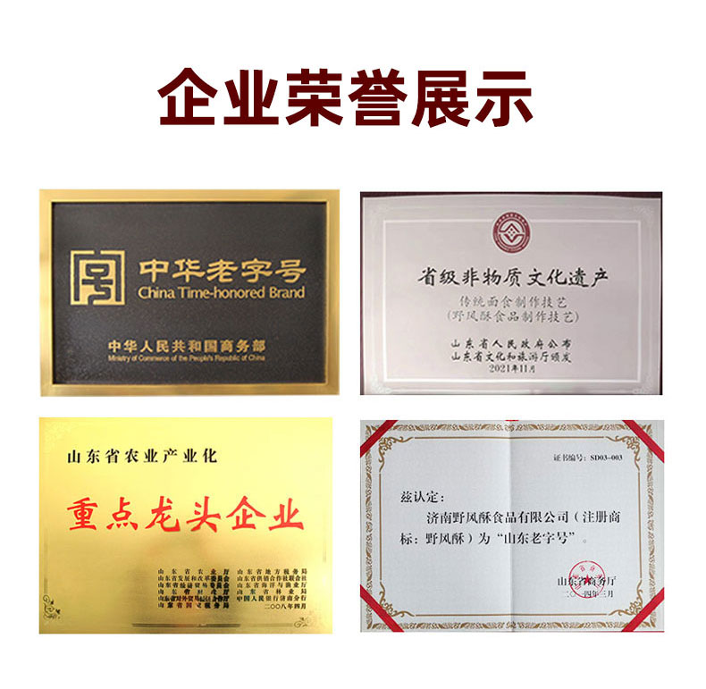 - 济南野风酥食品有限公司是一家从事绿色无公害农产品深加工,生产山东特产食品的企业。职工总人数586人,其中高中级技术人员56人。2007年济南野风酥食品有限公司被山东省人民政府授予省级农业产业化经营重点龙头企业。我公司生产的糖酥煎饼等系列产品曾连续获农业部、山东省优质产品奖,被人民大会堂定为国宴用品。“九顶塔”牌商标获得“省优”“部优”商标称号。全国著名的营养学家于若木曾来厂视察并亲笔题词,姜春云、苏毅然等国家、省级领导先后来厂视察。“野风酥”被中国食品协会评为“优秀民族食品”,获得“中华名吃”称号。产品连续获得国家级食品展销会的畅销产品奖,成为山东省的特色食品,省、市旅游局的十佳旅游商品。“山东煎饼”和“山东烧饼” 被认证为绿色食品。