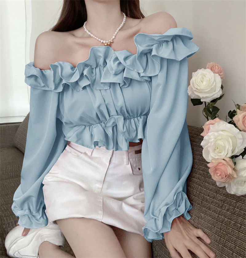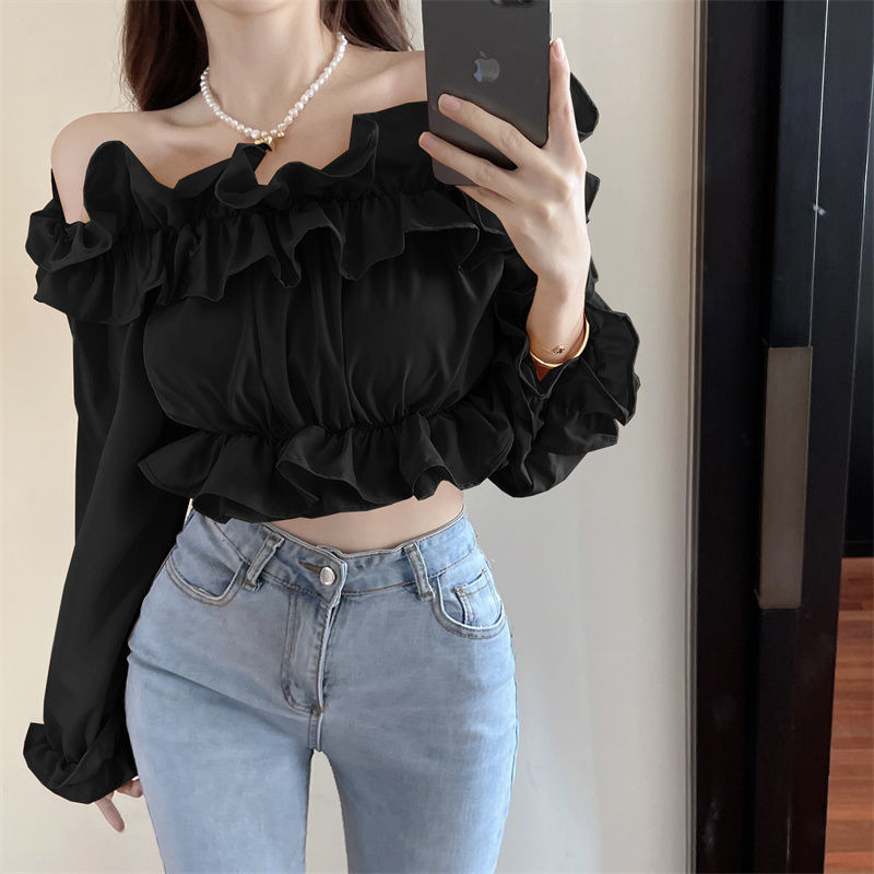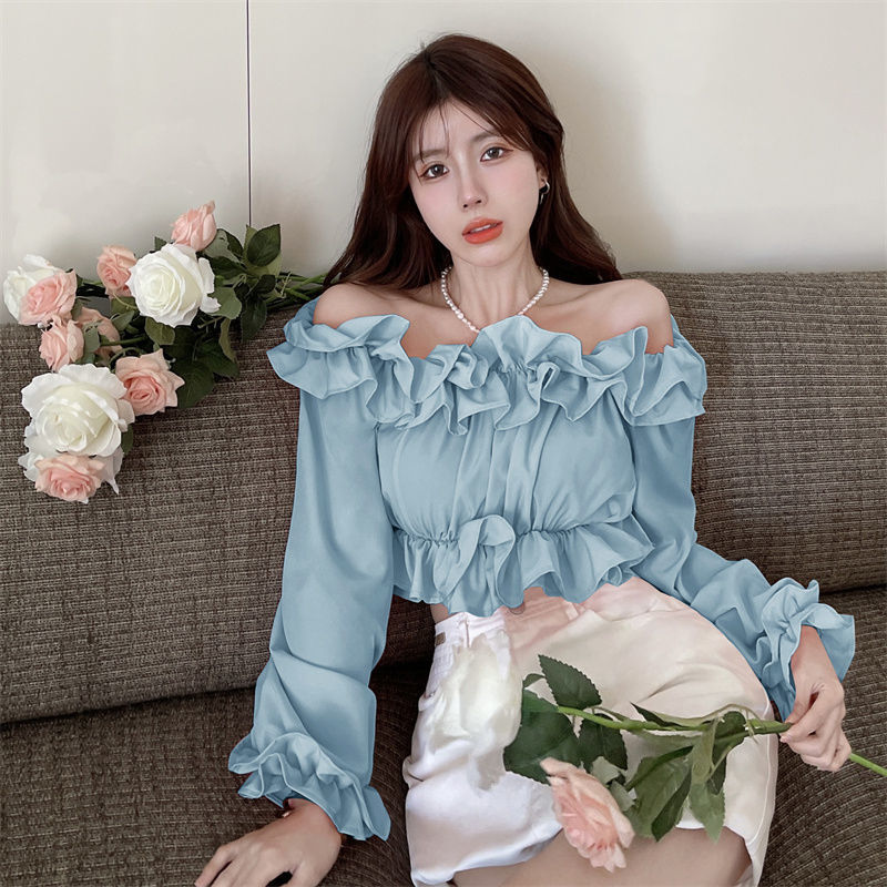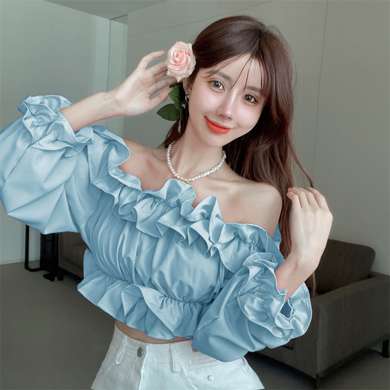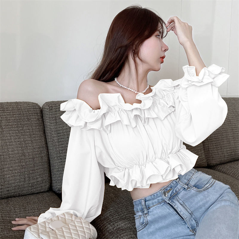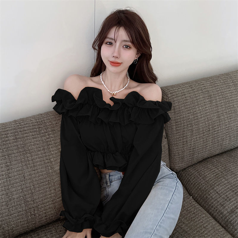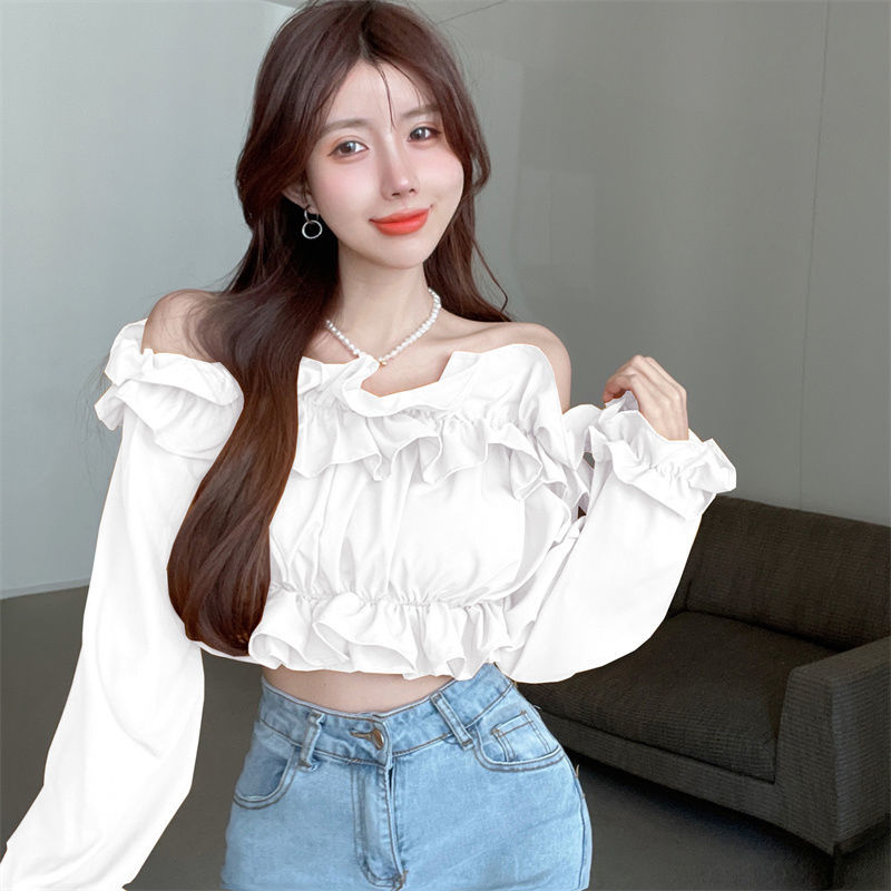 黛唯梵短款衬衫设计感小众2022夏新款纯欲荷叶边一字肩锁骨防晒上衣女潮国庆出游