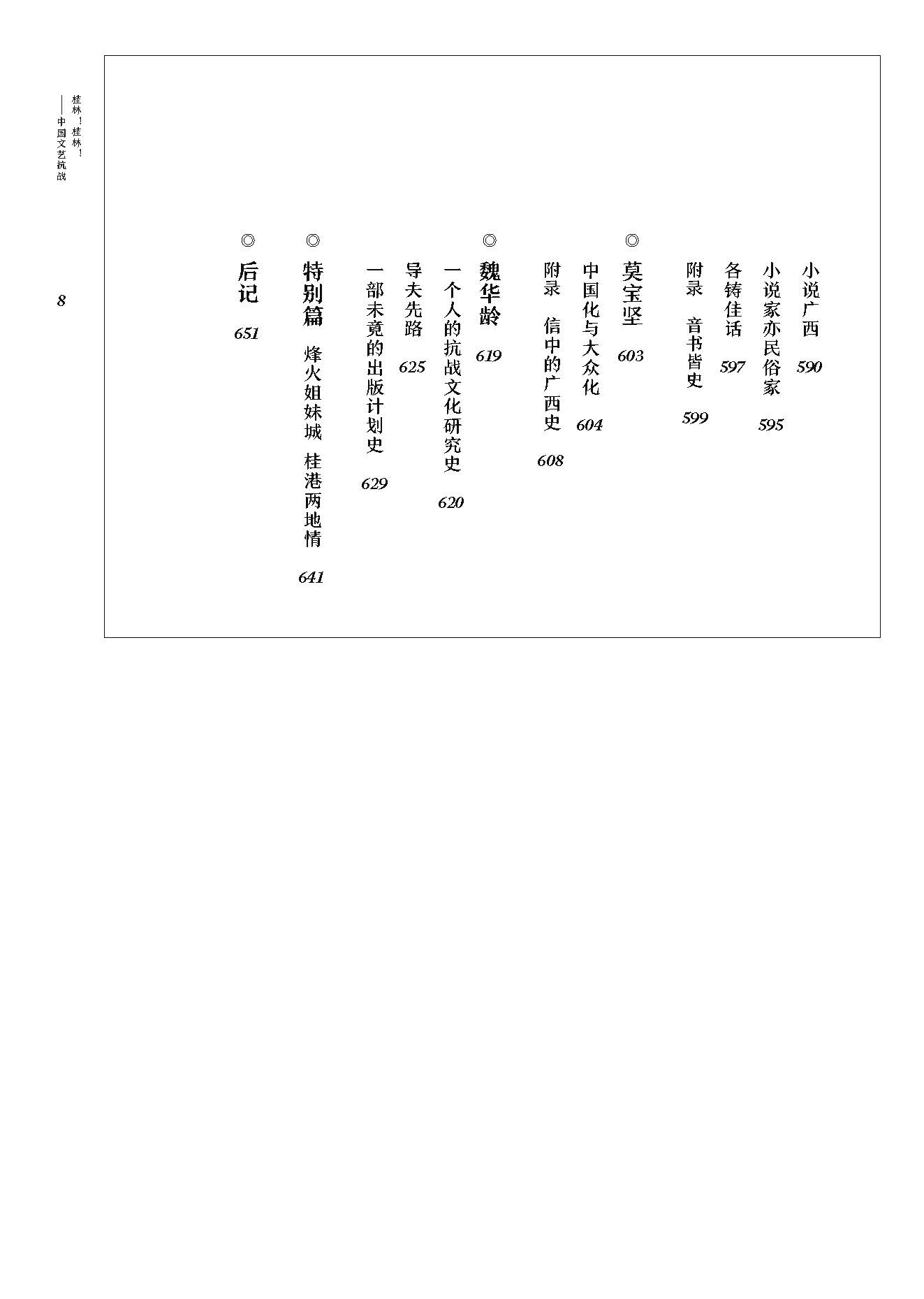 图书共60多万字,是作者40余年研究桂林抗战文化的成果。内容涉及中国抗战史、文化史、地方史等多重学科,并运用了社会学、风格学、传记学、图像学等艺术研究方法,以历史发展线索为经,以47位知识分子、文艺界人士在桂林的文艺抗战活动为纬,记叙了桂林文艺抗战这段特殊时期的历史。其中,所涉内容以桂林文艺抗战时期的美术活动为主,涵盖戏剧、音乐、舞蹈、出版等多个方面,涵盖各种文艺活动、大量艺术作品、历史照片等等。有史有论,史论结合,是一本可供系统、全面地进行抗战文艺研究且带有一定学术价值的图书。