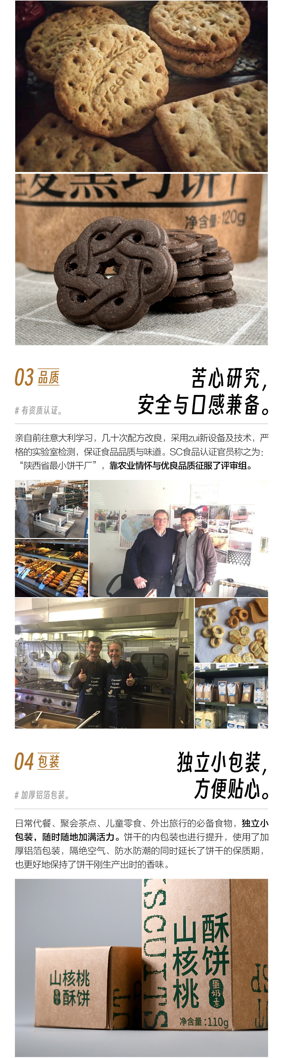 【规格】 枣儿全麦饼干(纯素):130g/盒 山核桃酥饼:110g/盒 全麦黑巧饼干:120g/袋 有机五黑酥:100g/盒 有机五白酥:100g/盒 【生产者】大黑刘宸宇 【产地】陕西咸阳市泾阳县中张镇新庄村 【配料】 枣儿全麦饼干:石磨小麦粉、石磨全麦粉、红枣、葵花籽油、蔗糖、碳酸氢钠(小苏打) 山核桃酥饼:石磨小麦粉、山核桃仁、黄油、鸡蛋、白芝麻、蔗糖、碳酸氢钠(小苏打) 全麦黑巧饼干:石磨小麦粉、葵花籽油、蔗糖、石磨全麦粉≥10%、可可粉≥4.6%、食用盐、碳酸氢钠(小苏打) 有机五黑酥:石磨小麦粉、葵花籽油、白砂糖、玉米淀粉、黑米粉≥3%、黑芝麻≥2%、黑桑葚≥1%、黑豆粉≥0.8%、黑枸杞≥0.4%、食用盐、碳酸氢钠(小苏打) 有机五白酥:石磨小麦粉、葵花籽油、白砂糖、玉米淀粉、山药粉≥1.5%、白芝麻≥1%、杏仁粉≥0.8%、百合粉≥0.8%、银耳粉≥0.8%、茯苓粉≥0.4%、食用盐、碳酸氢钠(小苏打) 【生产方式】热加工,原料生产不使用农药化肥、除草剂激素等化学物质,全程加工无添加,原料来源可溯,谷物低温石磨磨粉,每盒饼干独立四小包 【储存方式】置于阴凉干燥处,避光保存,开封后密封好,不要受潮 【保质期】180天 【温馨提示】本产品含有麸质的谷物制品,生产线加工有牛奶、鸡蛋、芝麻、坚果产品,对这些过敏者请慎拍。 【注意事项】 1、受天气或库存等原因影响快递可能偶有耽误,急单请发货前咨询客服,不接受没有提前沟通的拒收。 2、已发货后不接受没有沟通的退款申请。 3、快递抵达后请尽快取件。 【售后标准】 1、饼干属于易碎食品,偶尔出现几片碎裂的情况,不影响口感,不以此售后,介意请慎拍。 2、由于顾客电话关机、停机、不接电话联系不上收货人、收货信息有误等原因导致的快递延迟签收,不在售后范围。 3、每个人口味偏好不同,不保证口感完全满足您的喜好,不以口感售后。 4、运输过程中挤压碰撞造成的严重破损、腐烂变质、产品不符、数量不符、重量不足等请于签收后24小时内发照片或视频联系客服,超出时效不售后哦。 |
