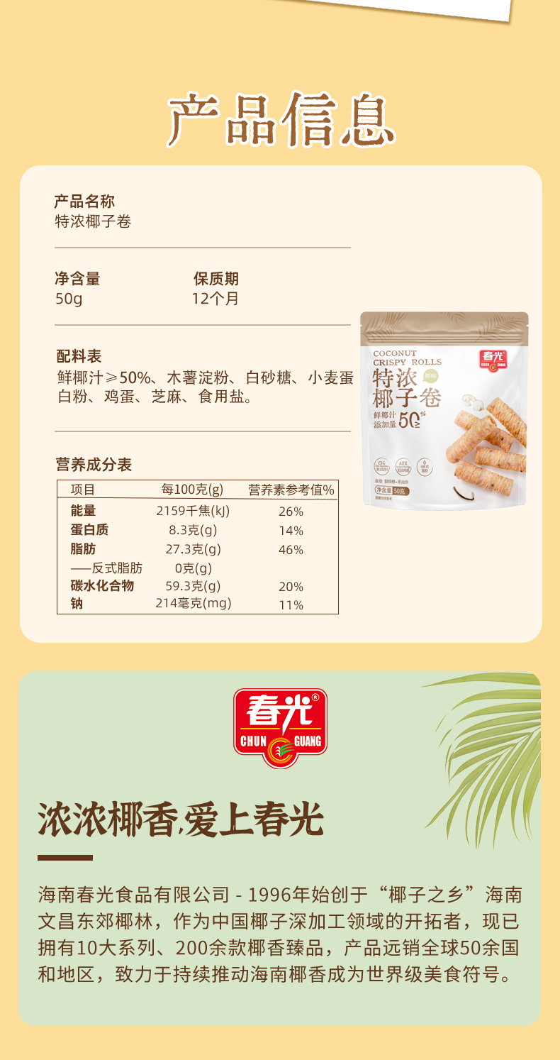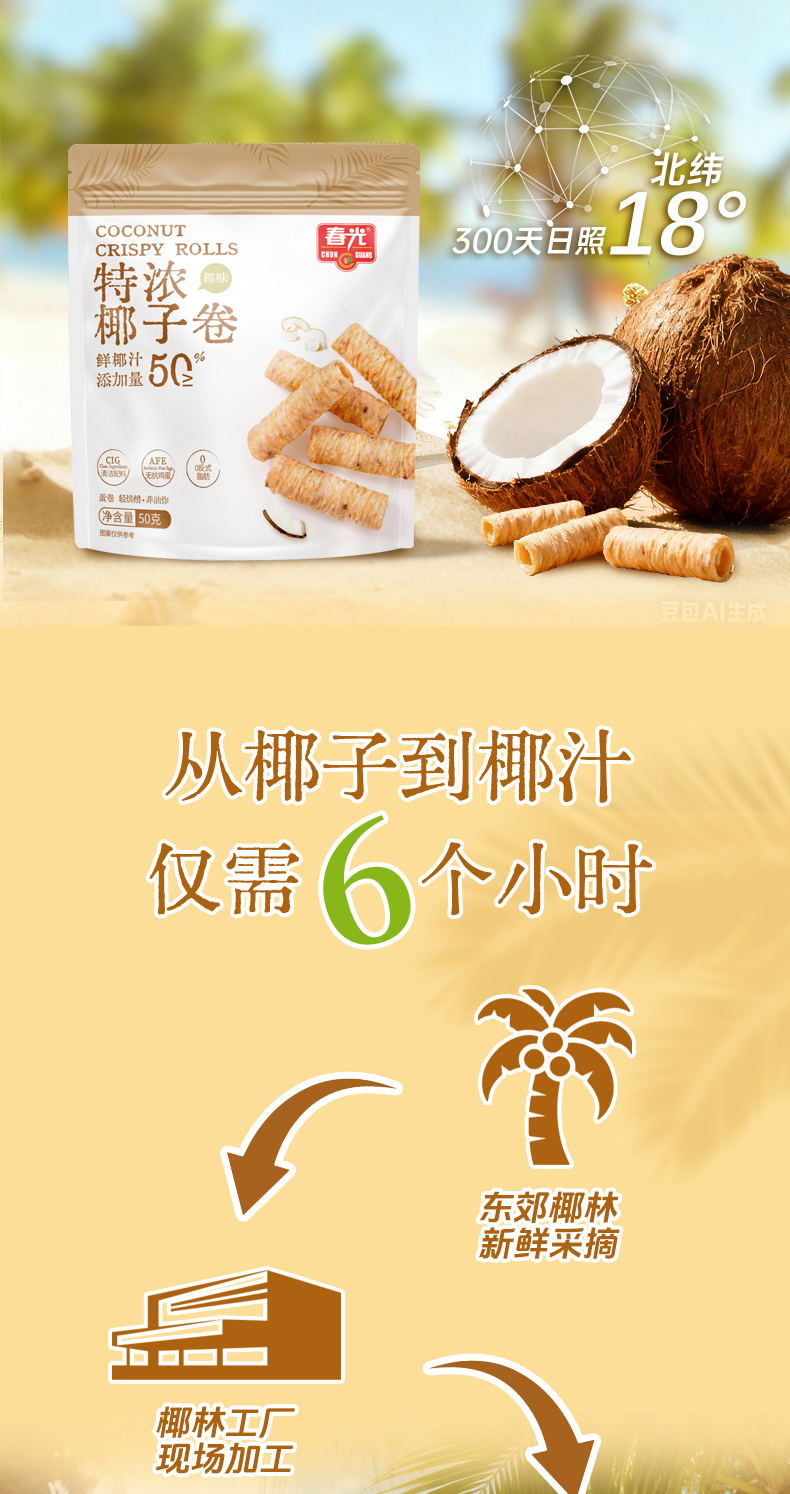 海南“著名手信品牌”春光食品,取材于海南椰子故乡,锁住北纬18°的新鲜美味。在这里,您能了解到春光食品旗舰店的最新优惠,享受优惠到不能说的价格。浓浓椰香,爱上春光!