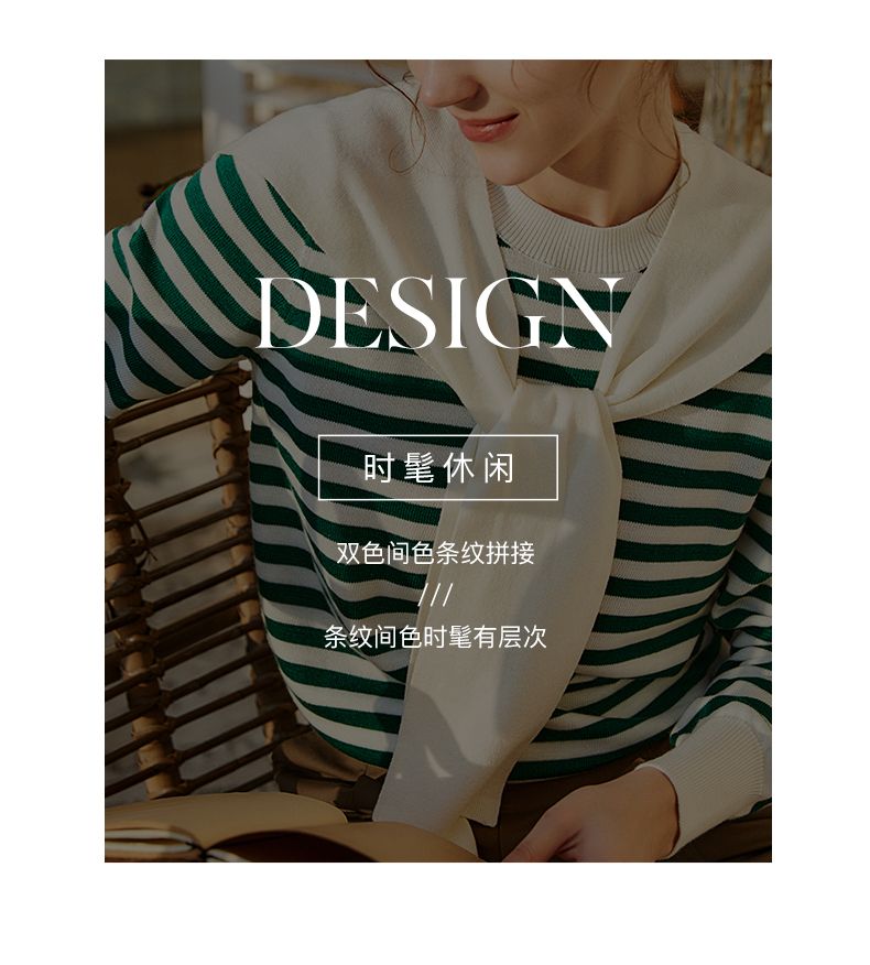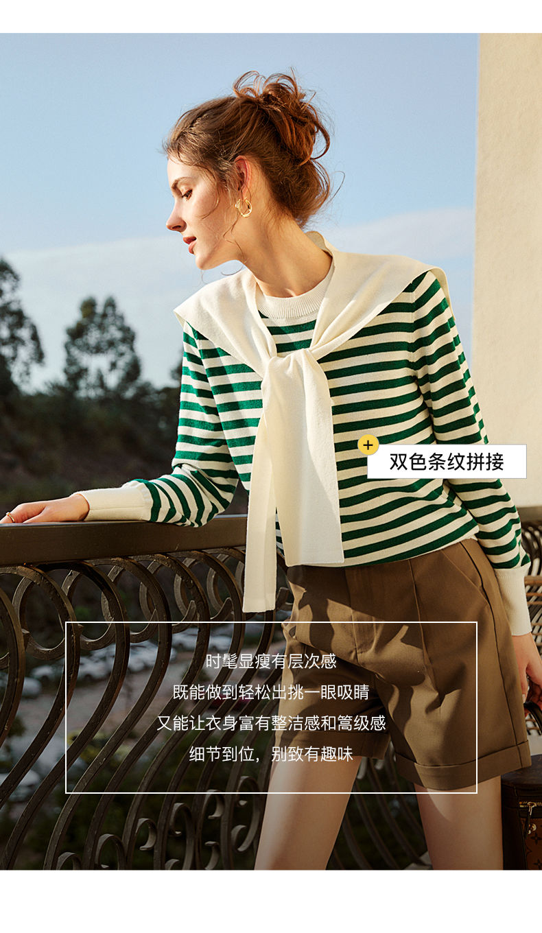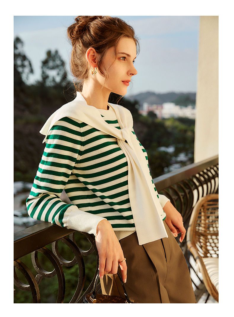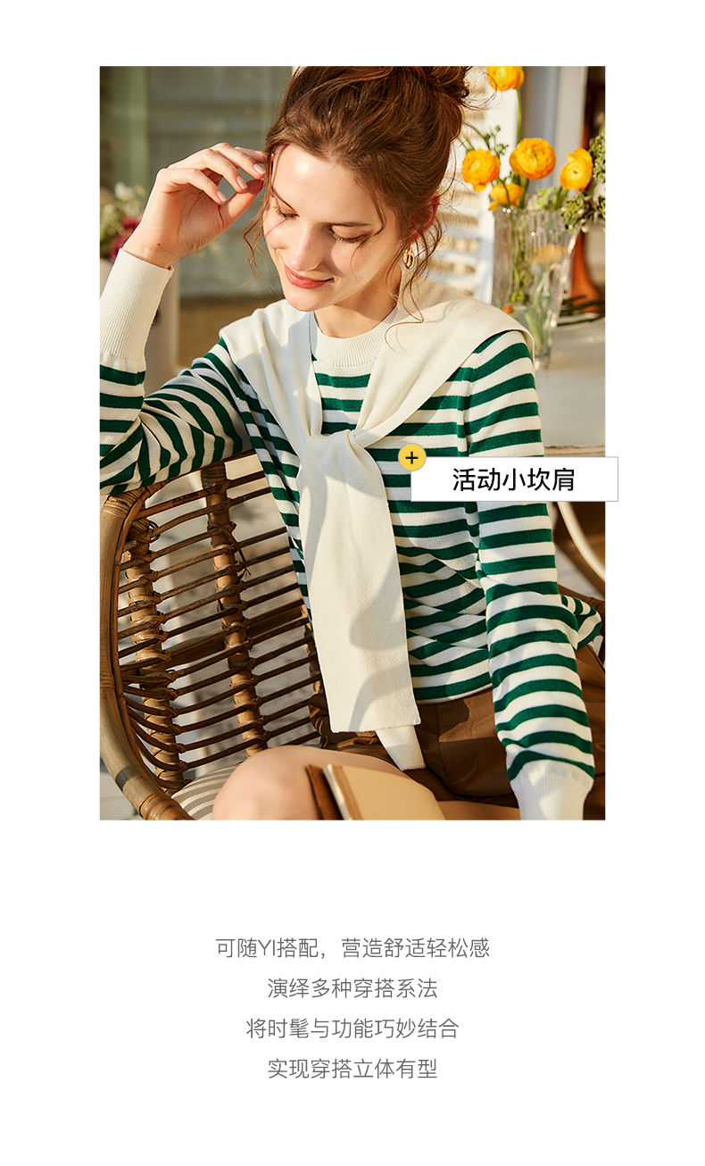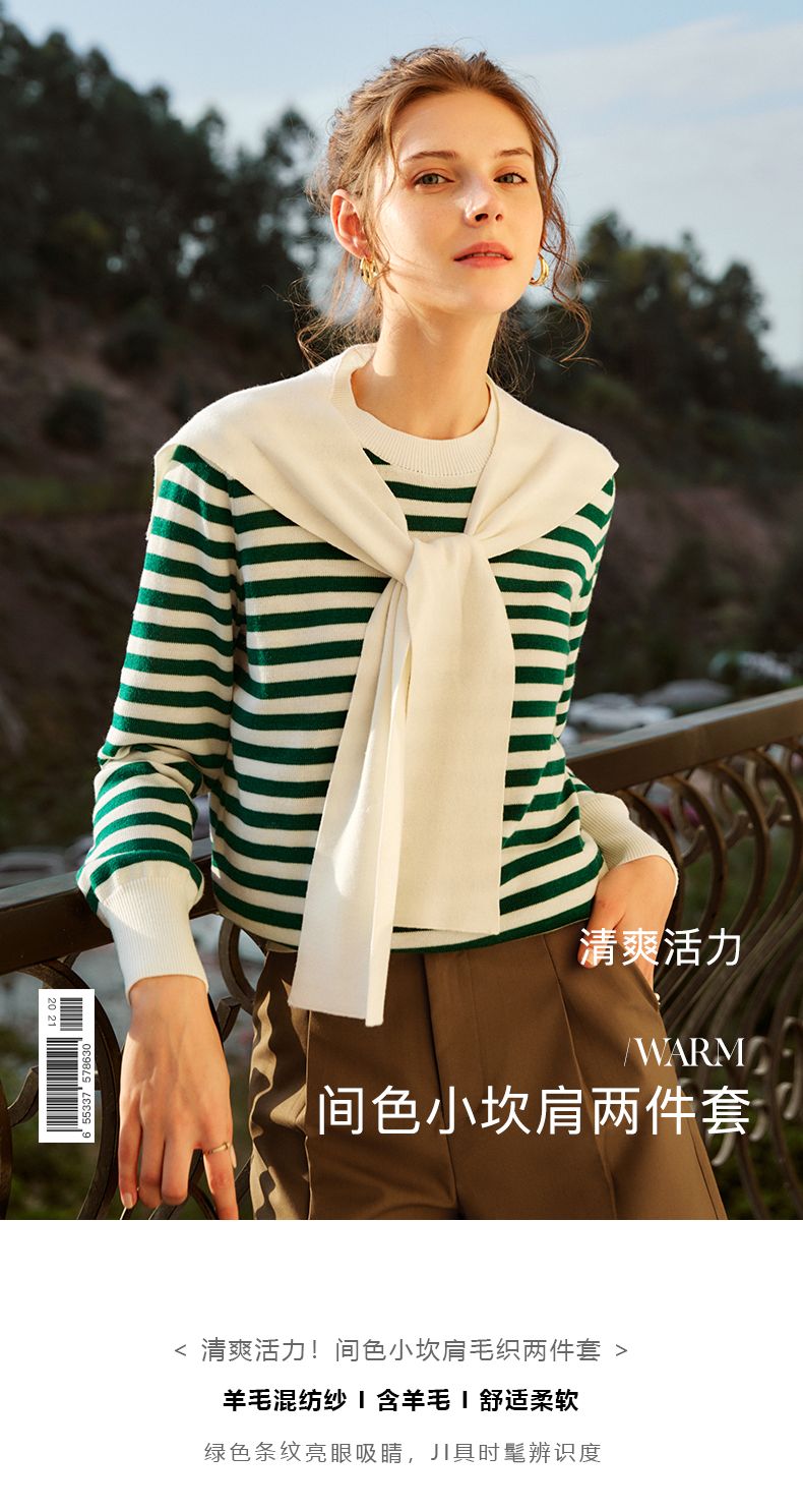 欧芮儿绿色条纹毛衣女2021秋冬新款圆领修身减龄披肩外搭两件套