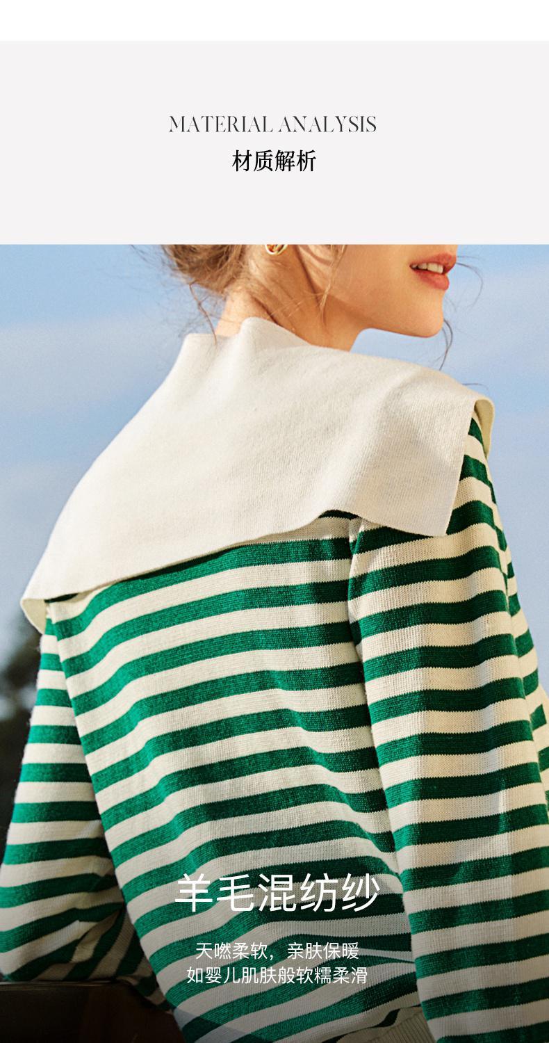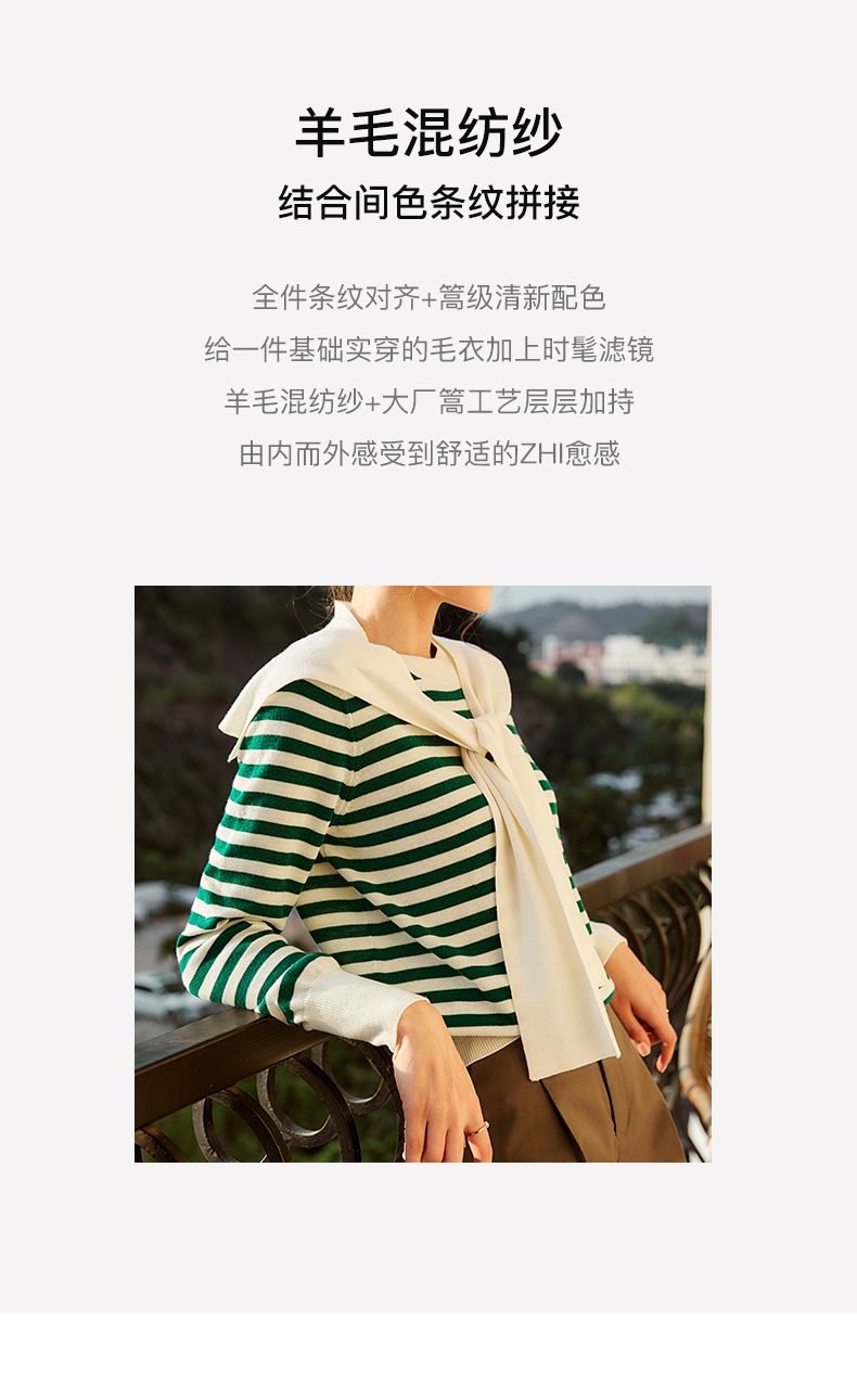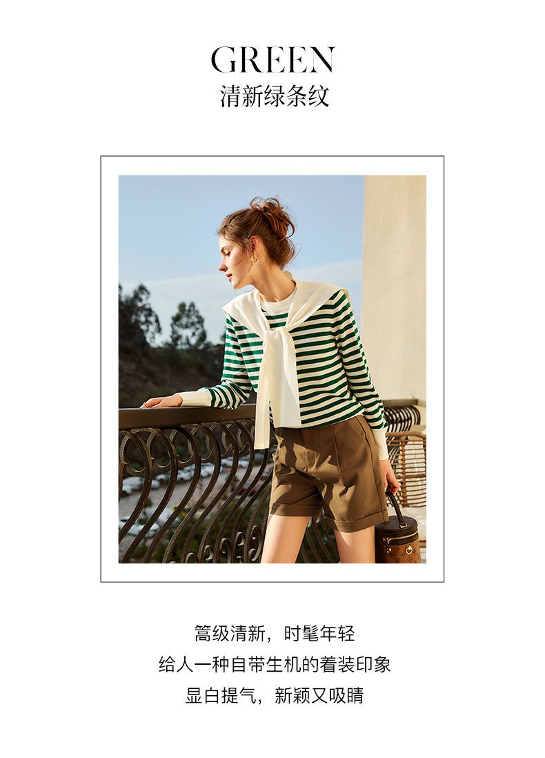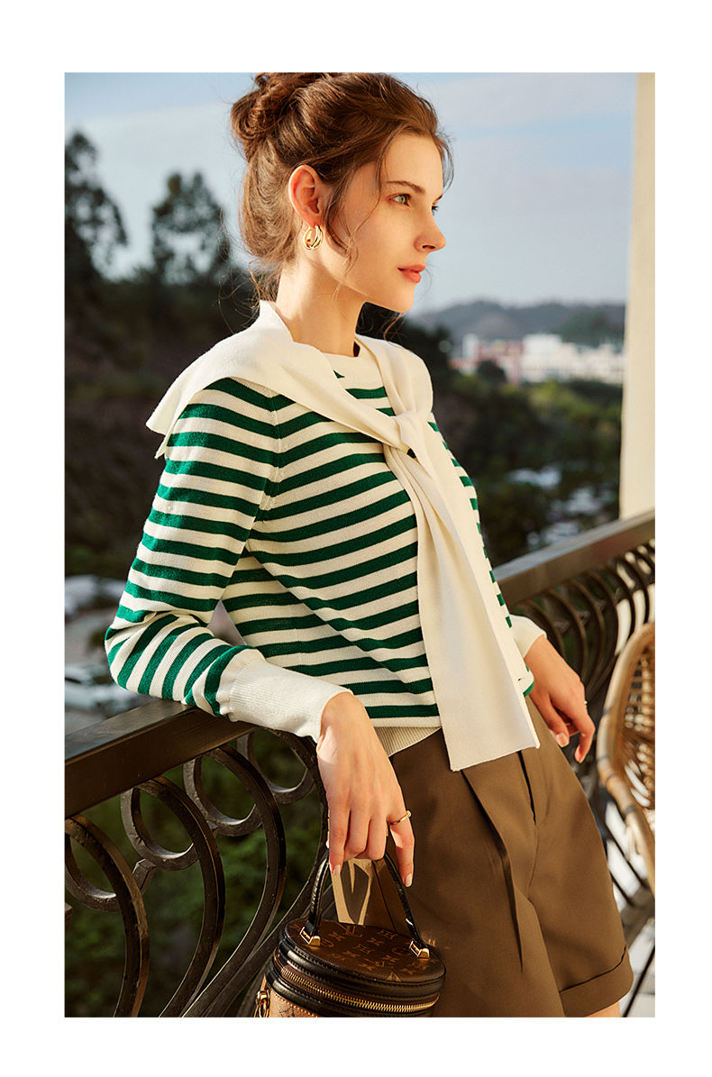 欧芮儿绿色条纹毛衣女2021秋冬新款圆领修身减龄披肩外搭两件套