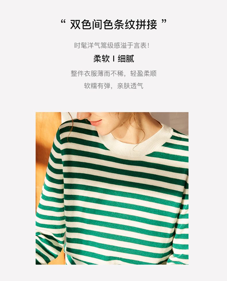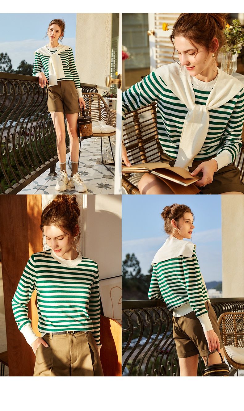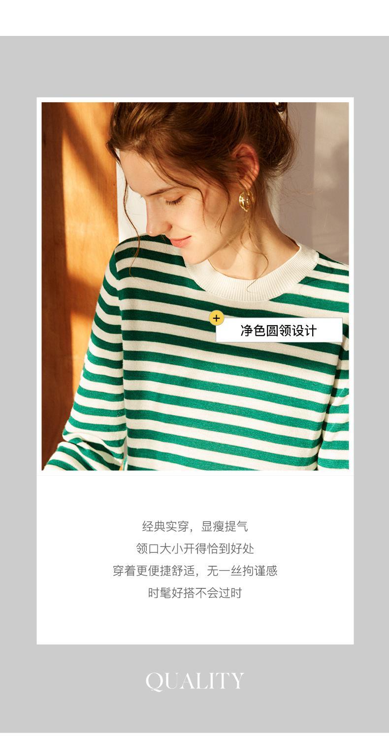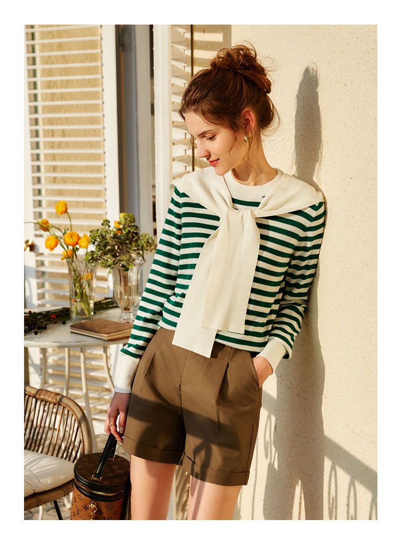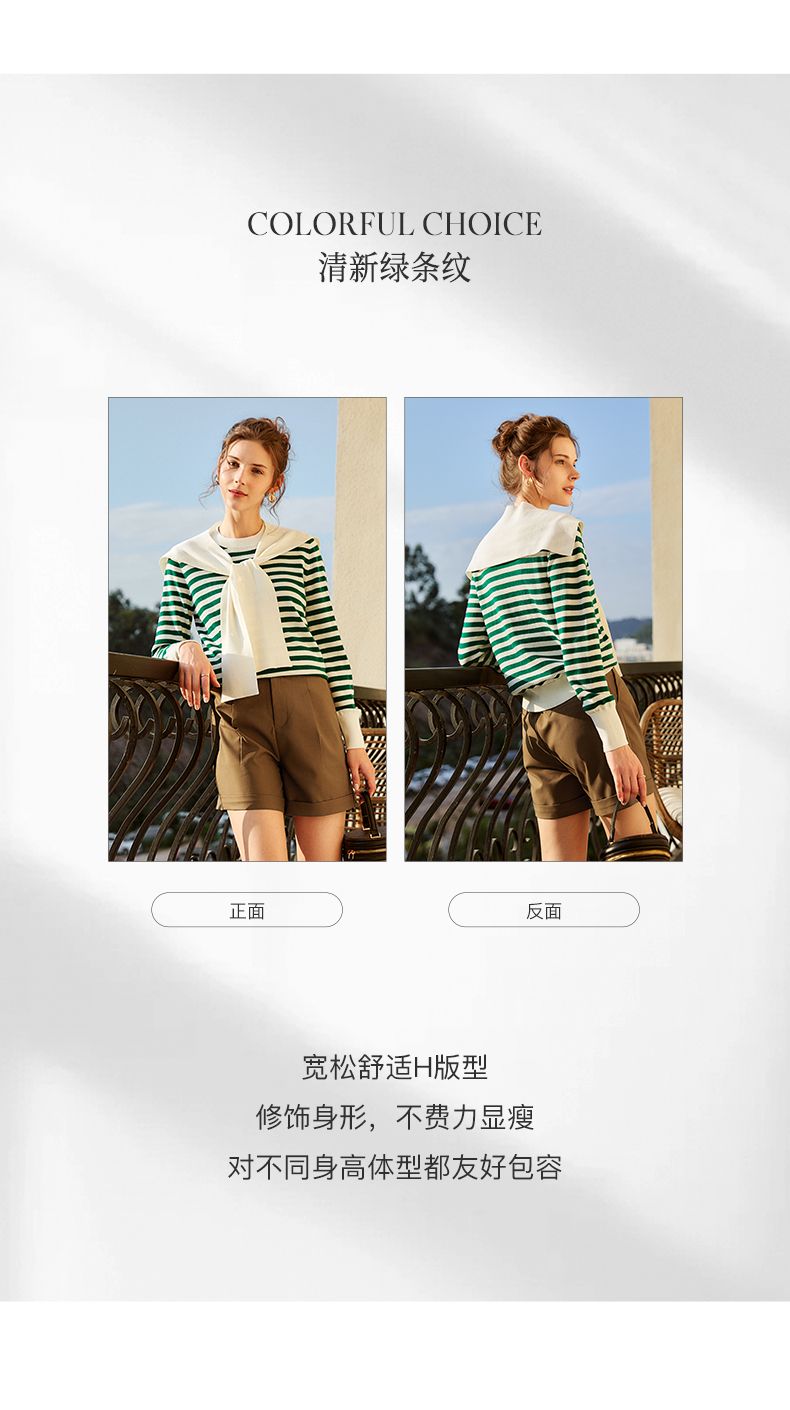 欧芮儿绿色条纹毛衣女2021秋冬新款圆领修身减龄披肩外搭两件套