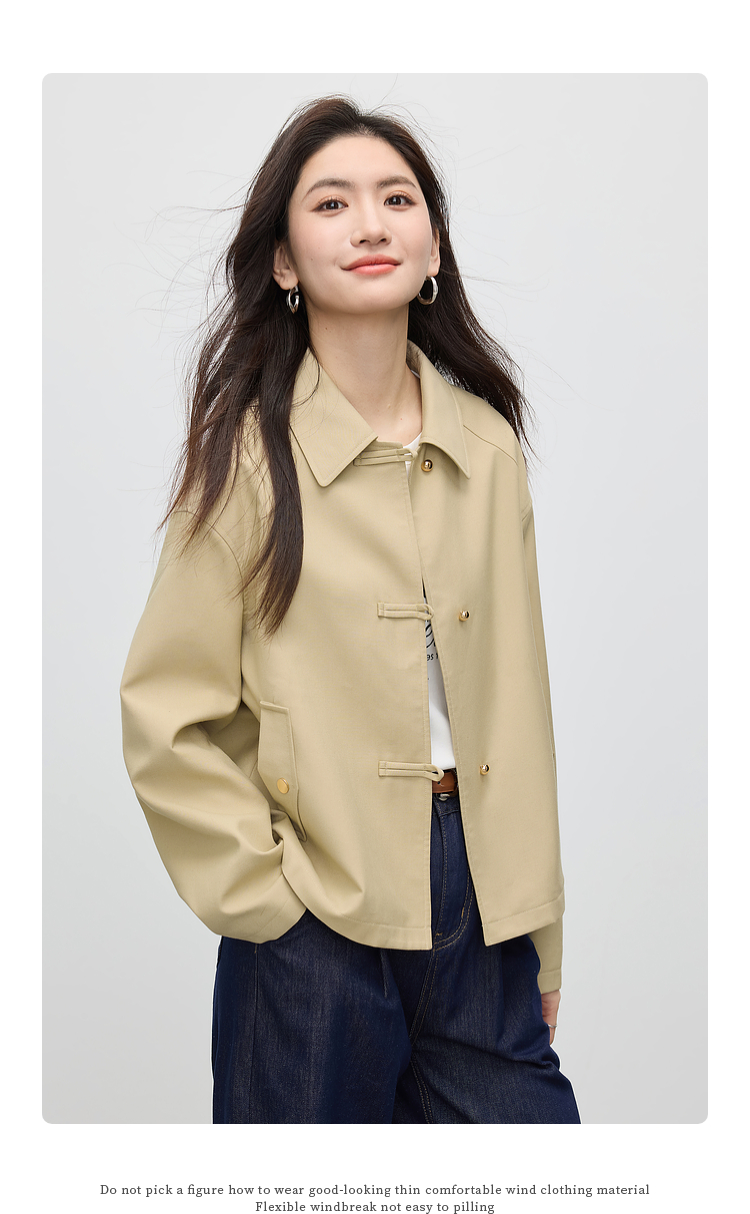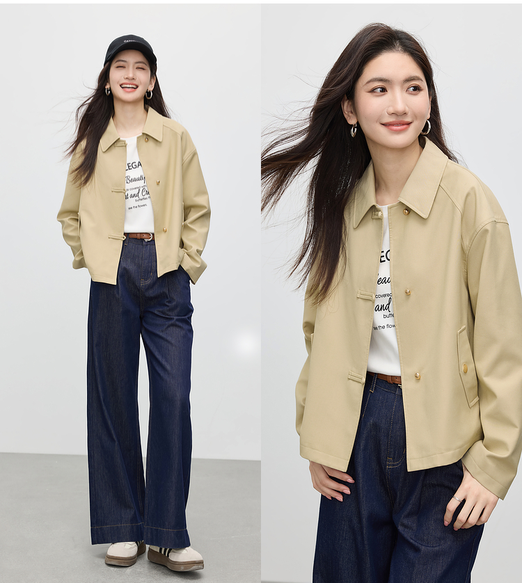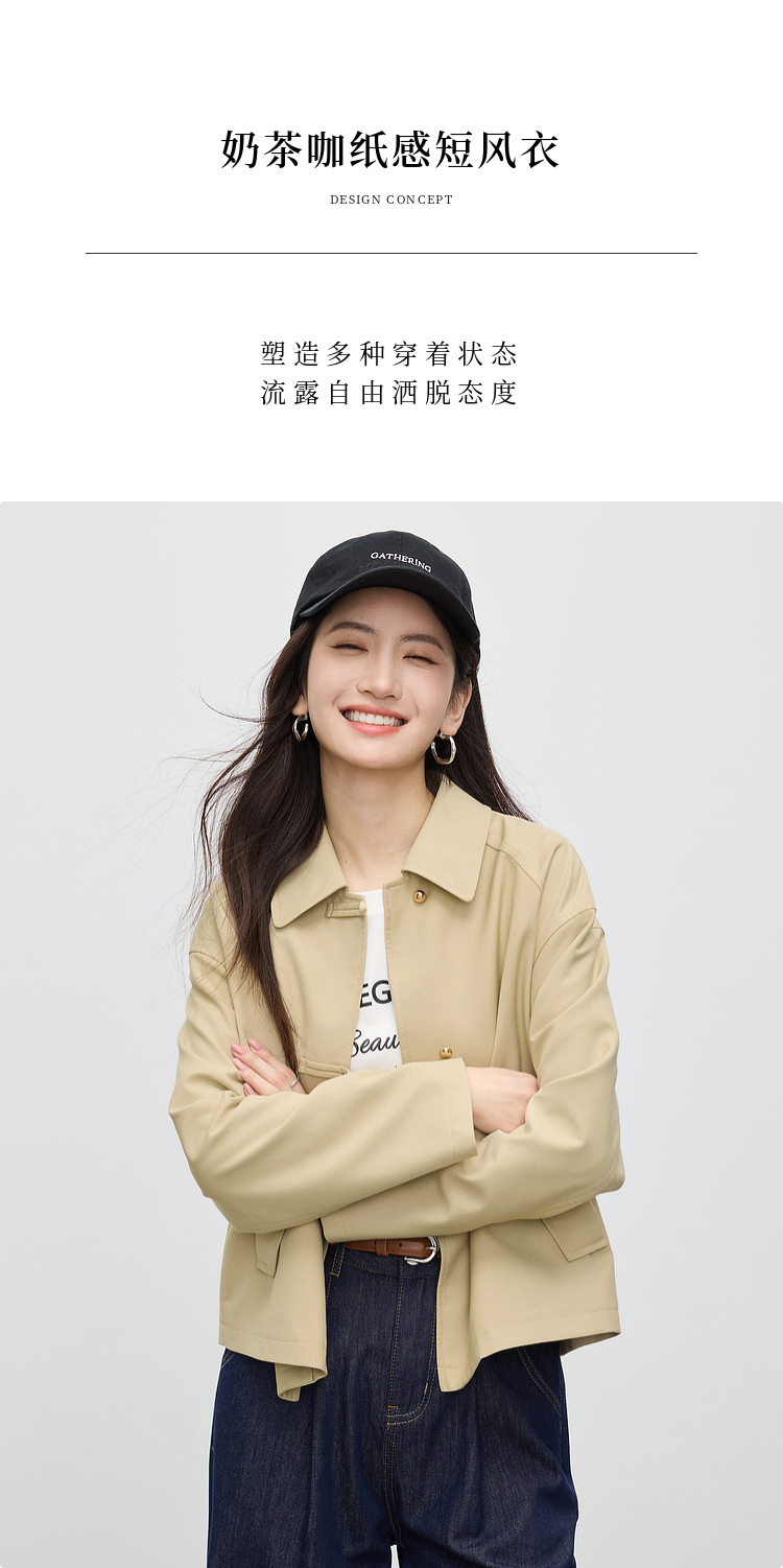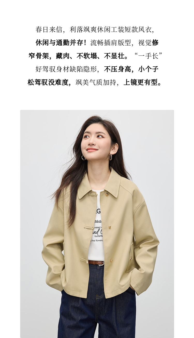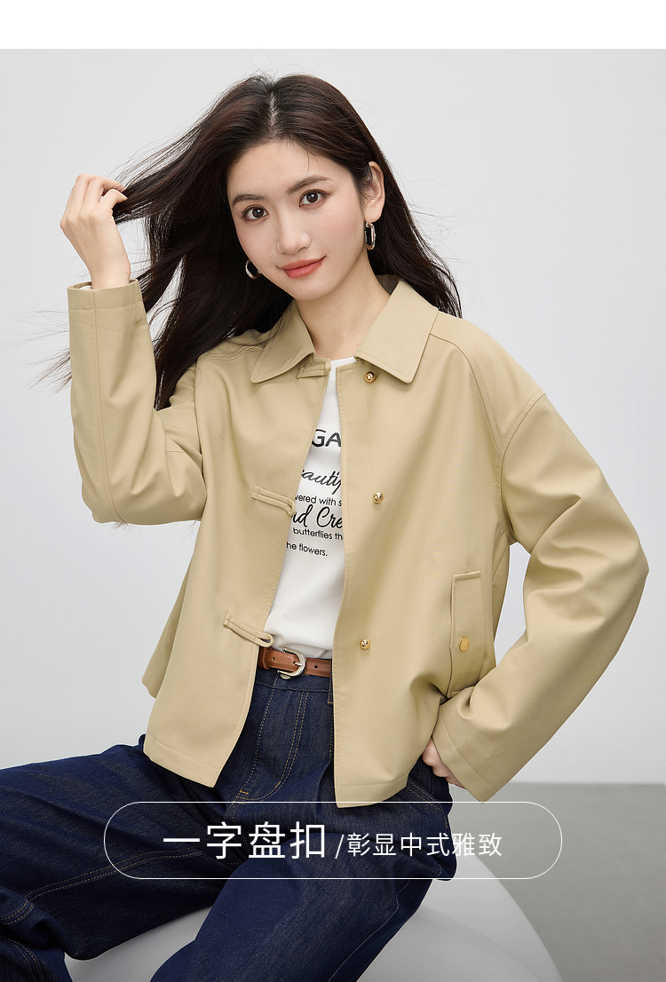 【专属特价】熙世界卡其色短款风衣女2025春秋新款气质英伦风翻领休闲夹克外套