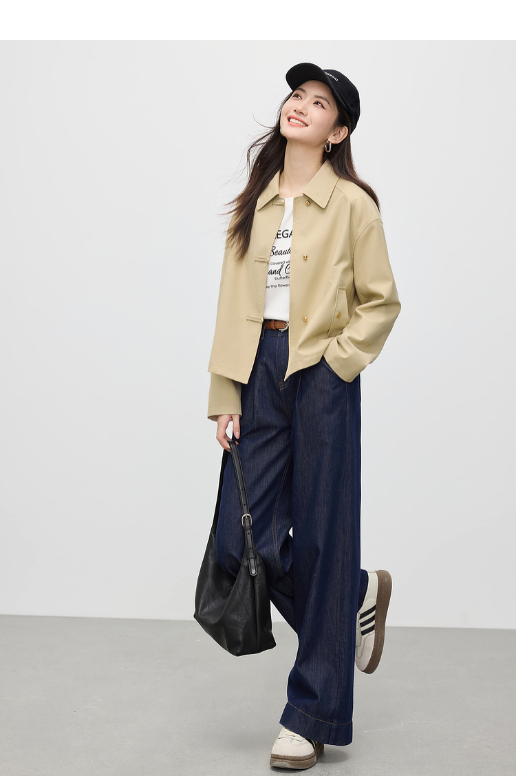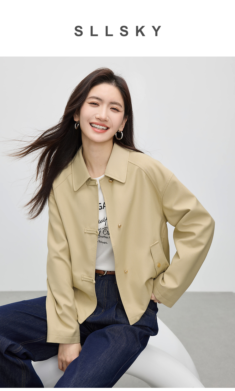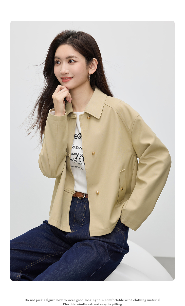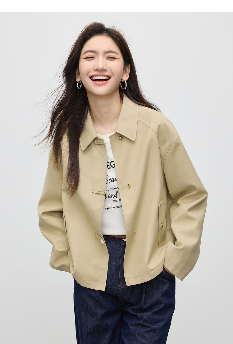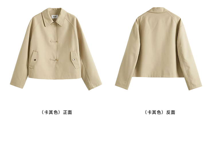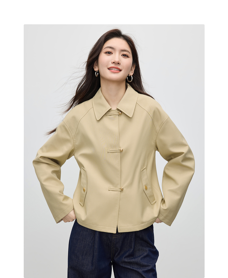 【专属特价】熙世界卡其色短款风衣女2025春秋新款气质英伦风翻领休闲夹克外套