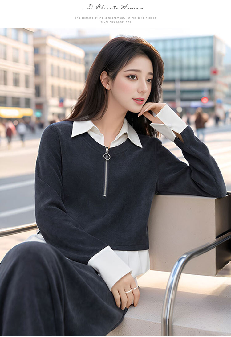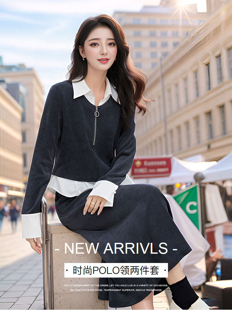 9/7奢姿大码女装2024秋季假两件上衣半身裙两件套胖妹妹POLO领套装9943991284