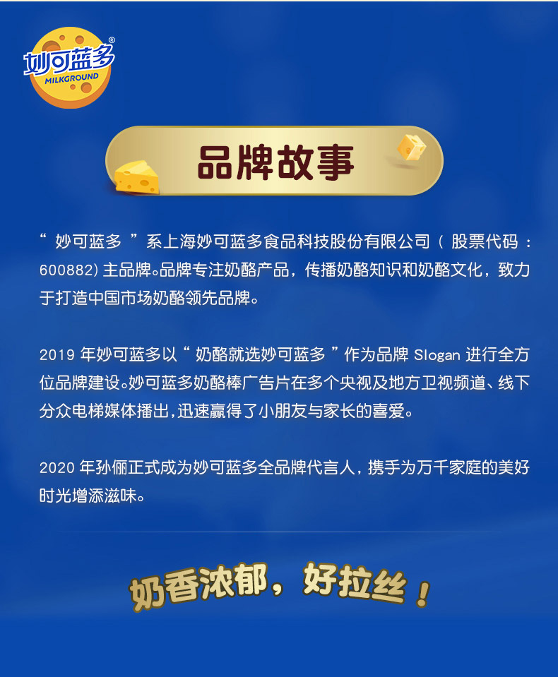 奶酪就选 妙可蓝多。 “妙可蓝多”系上海妙可蓝多食品科技股份有限公司(股票代码:600882)主品牌。妙可蓝多专注奶酪产品,传播奶酪知识和奶酪文化,致力于打造中国市场奶酪第一品牌。