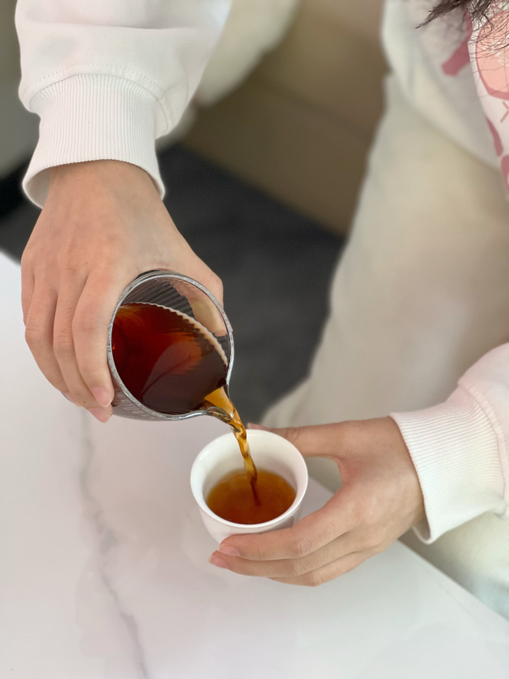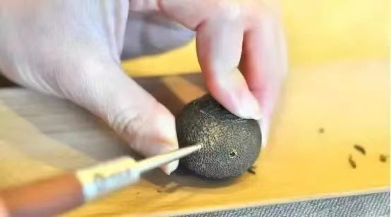 第3⃣种方法——九孔冲泡法: 1.用茶针或茶刀在柑果四周戳上九个孔,以不会漏茶为宜 2.按照整颗冲泡的方法进行冲泡,将钻孔后的小青柑放入壶中 3.加入沸水,洗茶两遍 4.茶慢慢浸出,与果皮的清香融合出汤时间根据个人口感调节 5.可以看到冲泡后的柑果保存已然完整,口感清甜舒适。 以上是柑普茶的冲泡方法,“十添一柑普茶”正是由于采摘的柑果与搭配的普洱熟茶都为新会天马村基地和云南,而被认可为“道地”柑普,好的茶才能泡出好的味道,午后跟柑普茶更配哦