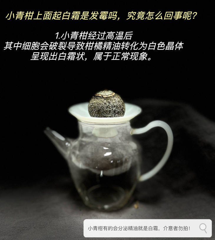 小常识 小青柑“发霉了” “白霜”≠“发霉”❗小青柑在陈华过程中会产生“柑油晶”,俗称“白霜”。 “白霜”并不是发霉所导致, 而是核心产区的小青柑 在经过日晒或低温长时间烘焙工艺后 所析出的柑油结晶而形成的白色粉末特质。 它的主要成分是柠檬烯,属单萜类化合物 有类似柠檬的香味,属于正常现象,起霜的小青柑可放心饮用哦!