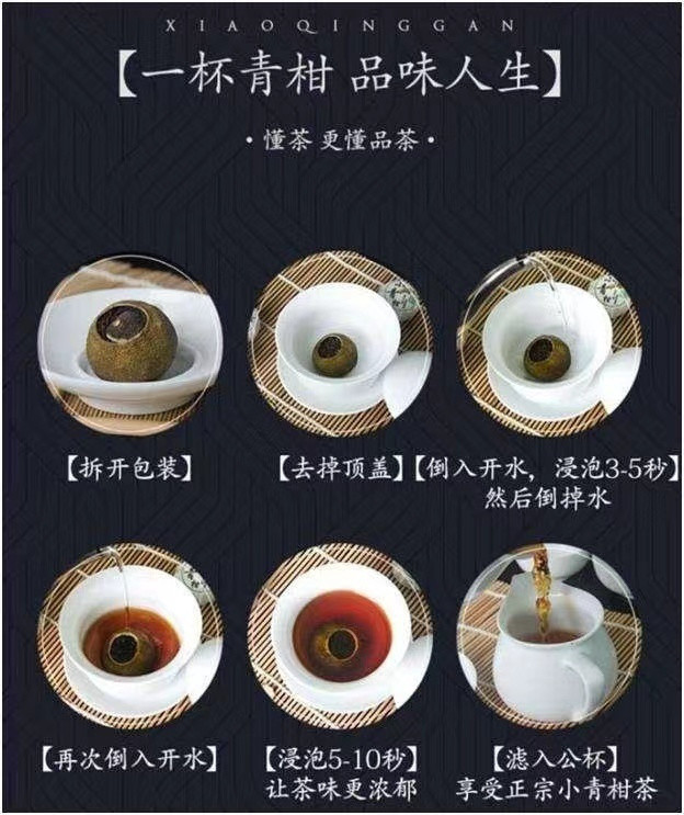 第2⃣种方法——碎皮冲泡法: 1.先将包装拆开,取出整颗完整的柑普茶; 2.将柑普茶顶端的小盖揭开(小盖可冲泡饮用); 3.倒出茶内的茶叶(约5克),掰下一些果皮; 4.第一次冲入滚开水,约3秒左右即可倒出; 5.再次倒入开水; 6.浸泡开水6秒即可倒出茶汤品饮。依据个人口味酌情调整茶叶与陈皮的比例。