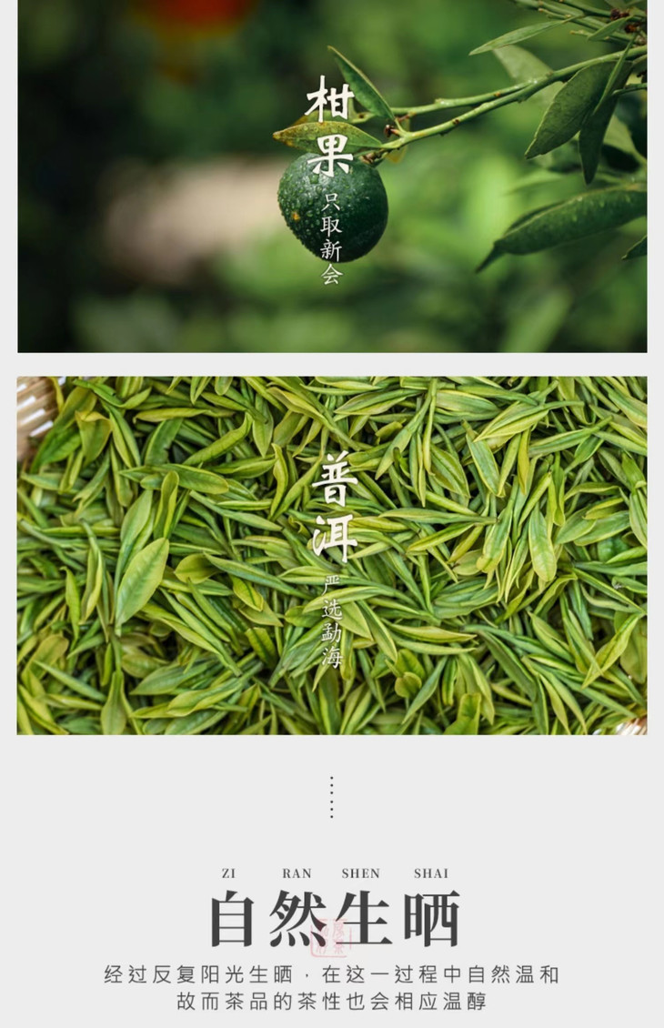 ✅正宗新会老树头茬小青柑 ✅只取4~5cm将熟未熟小青柑 ✅内料为云南勐海高山普洱 ✅从采摘到制作,历经48道工艺手工制作 ✅青柑性温甘润降燥,普洱消食化痰解油腻