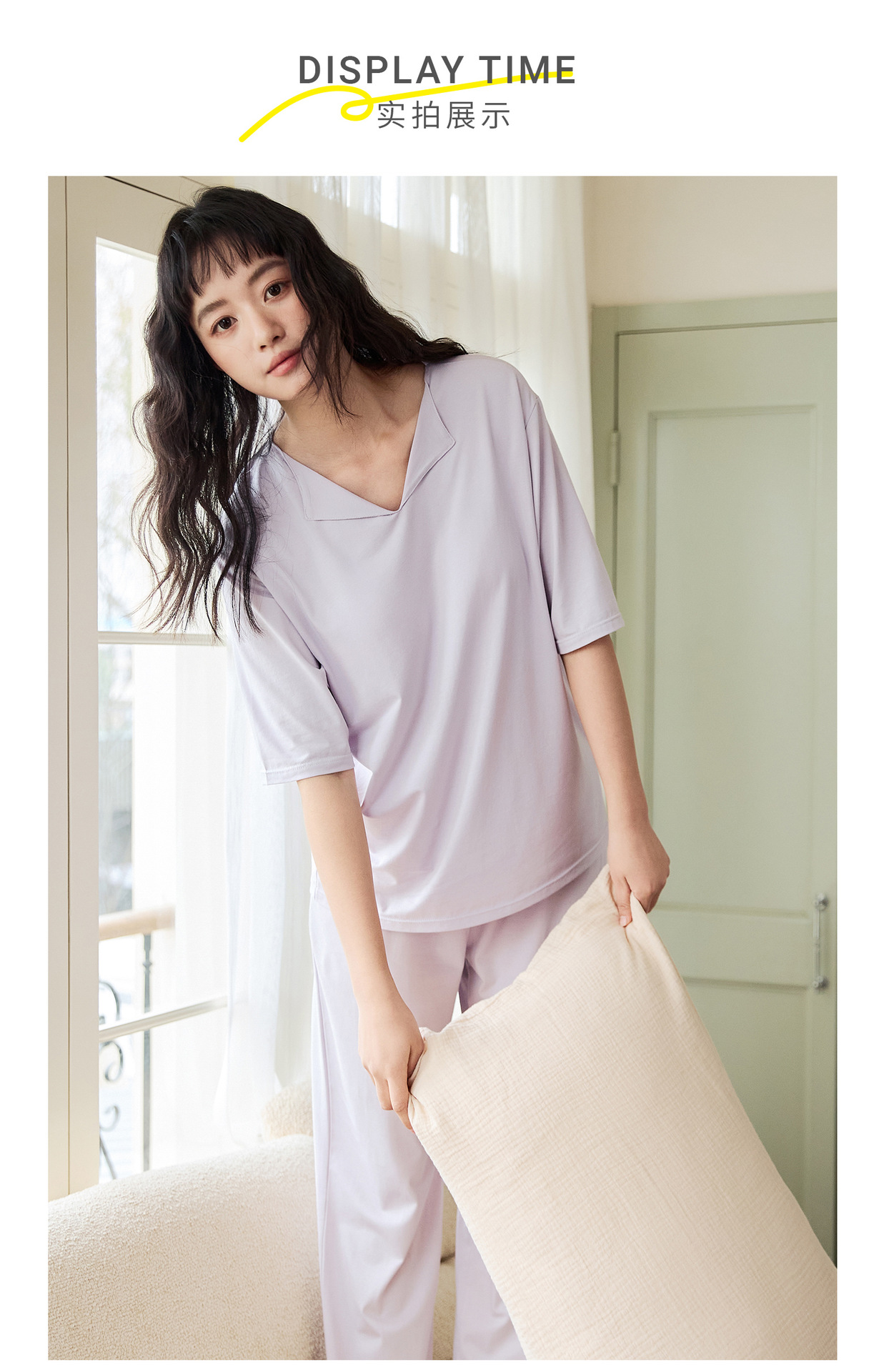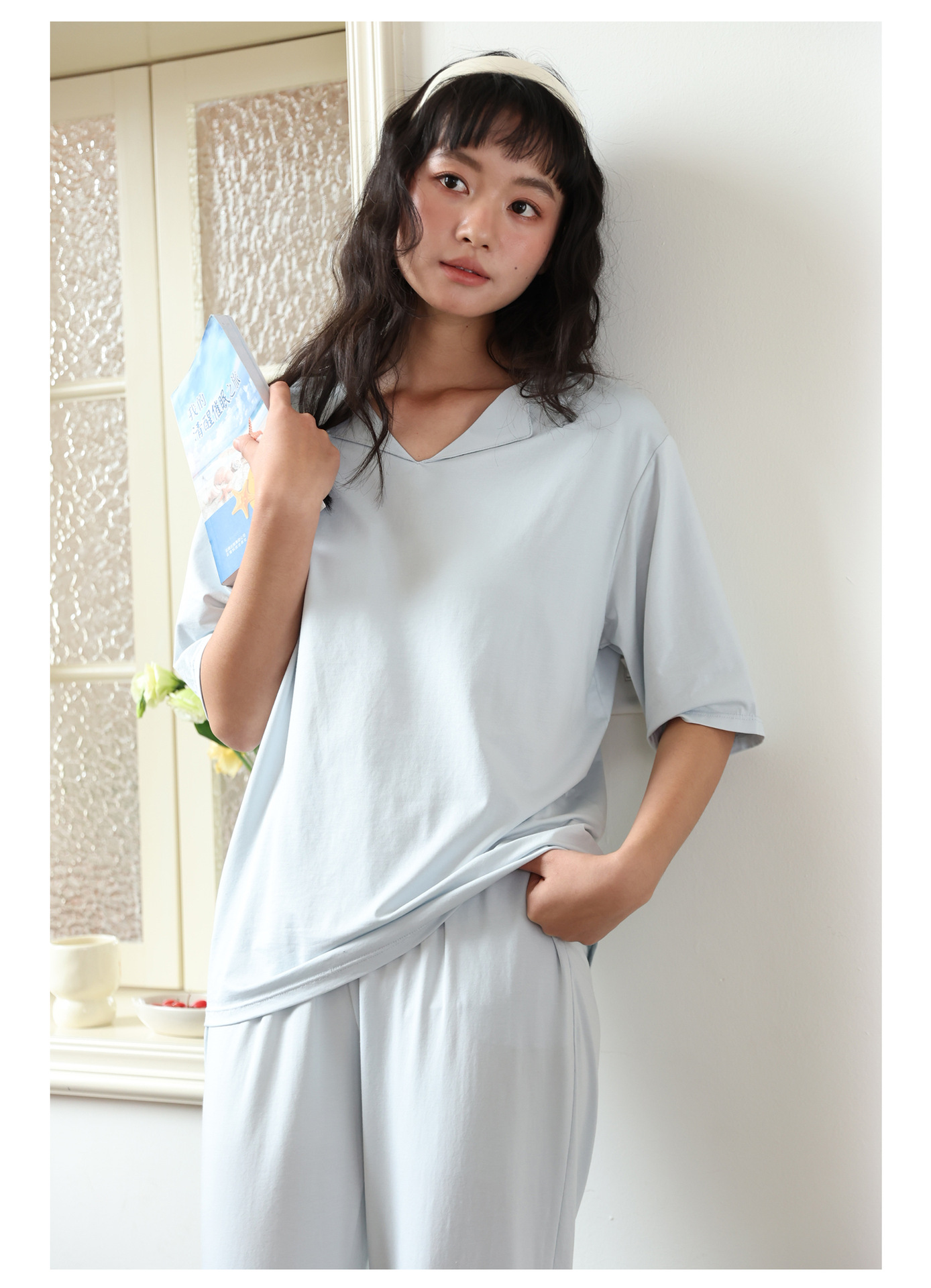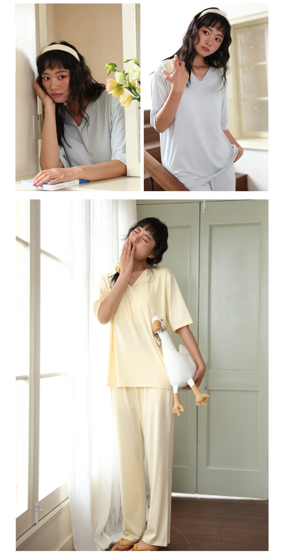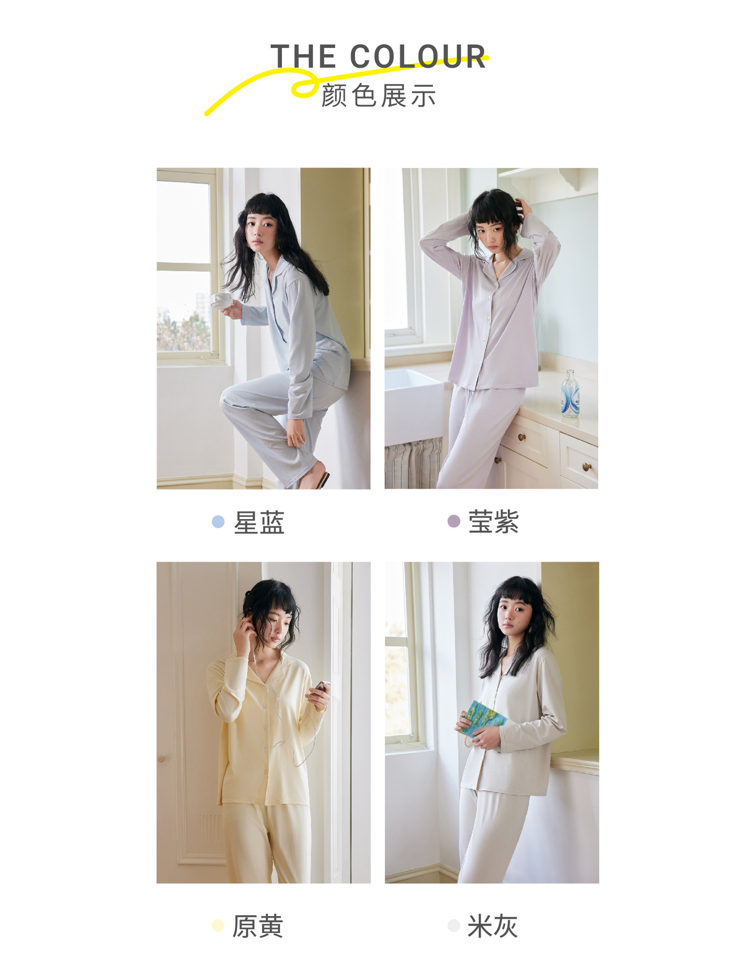 春夏天丝棉桑蚕丝家居服 软糯透气纯色可外穿翻领睡衣套装