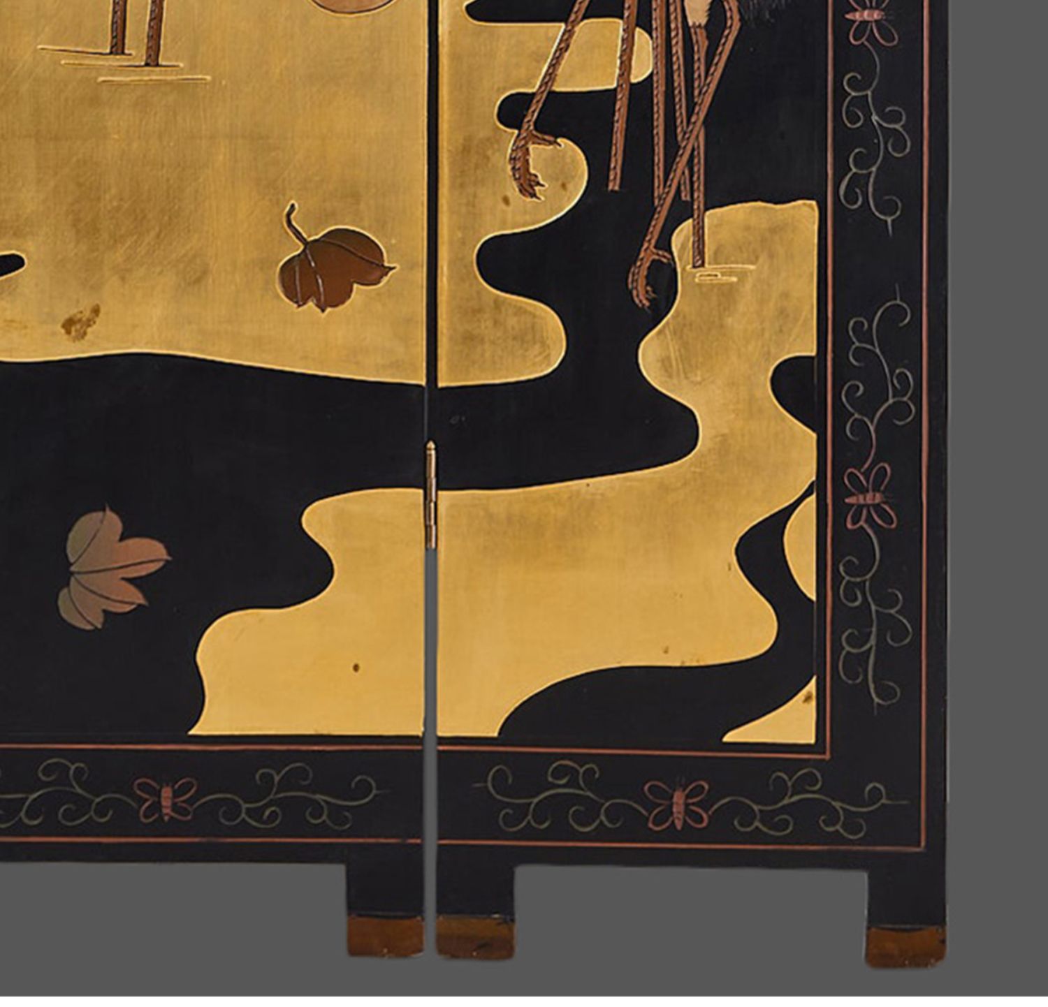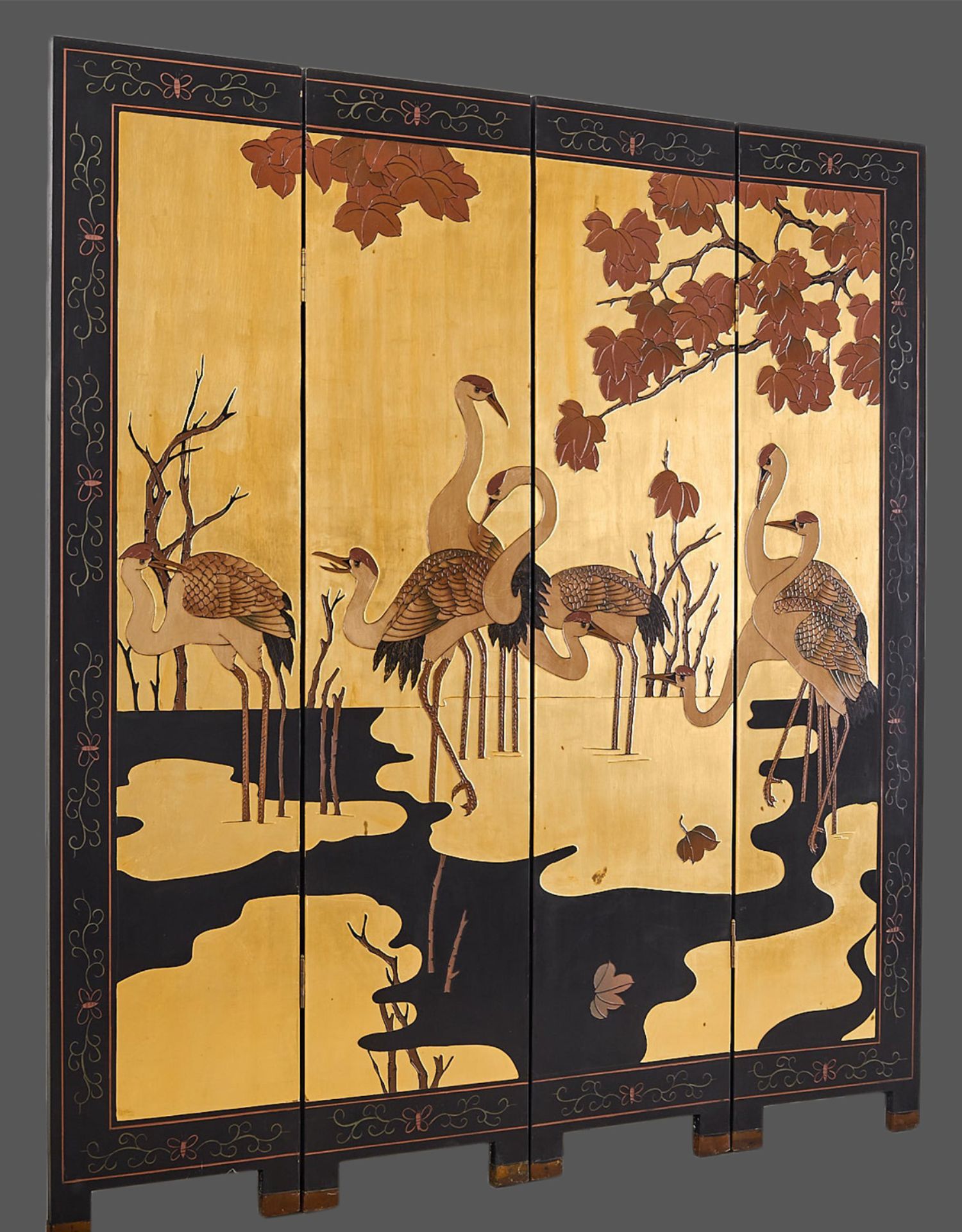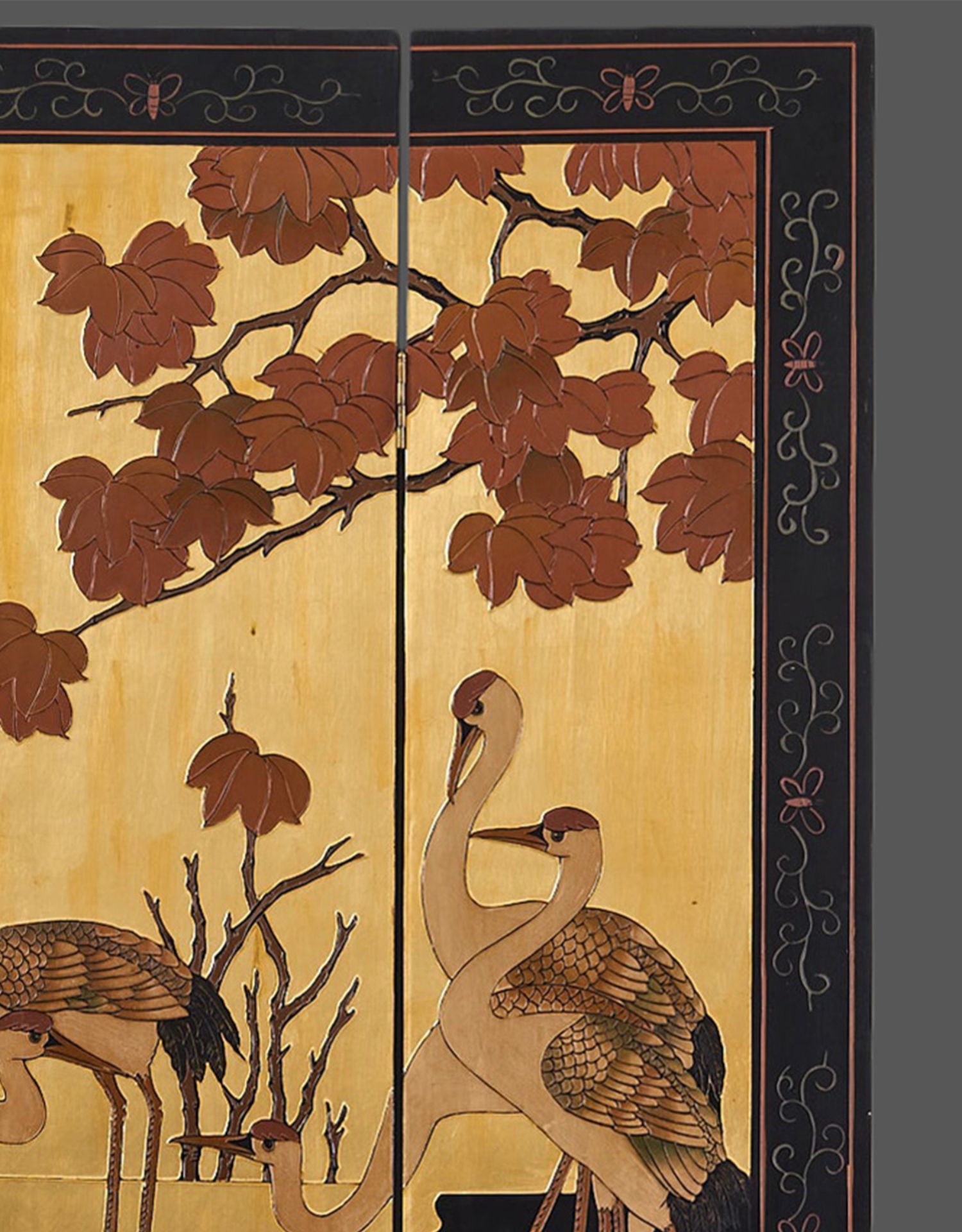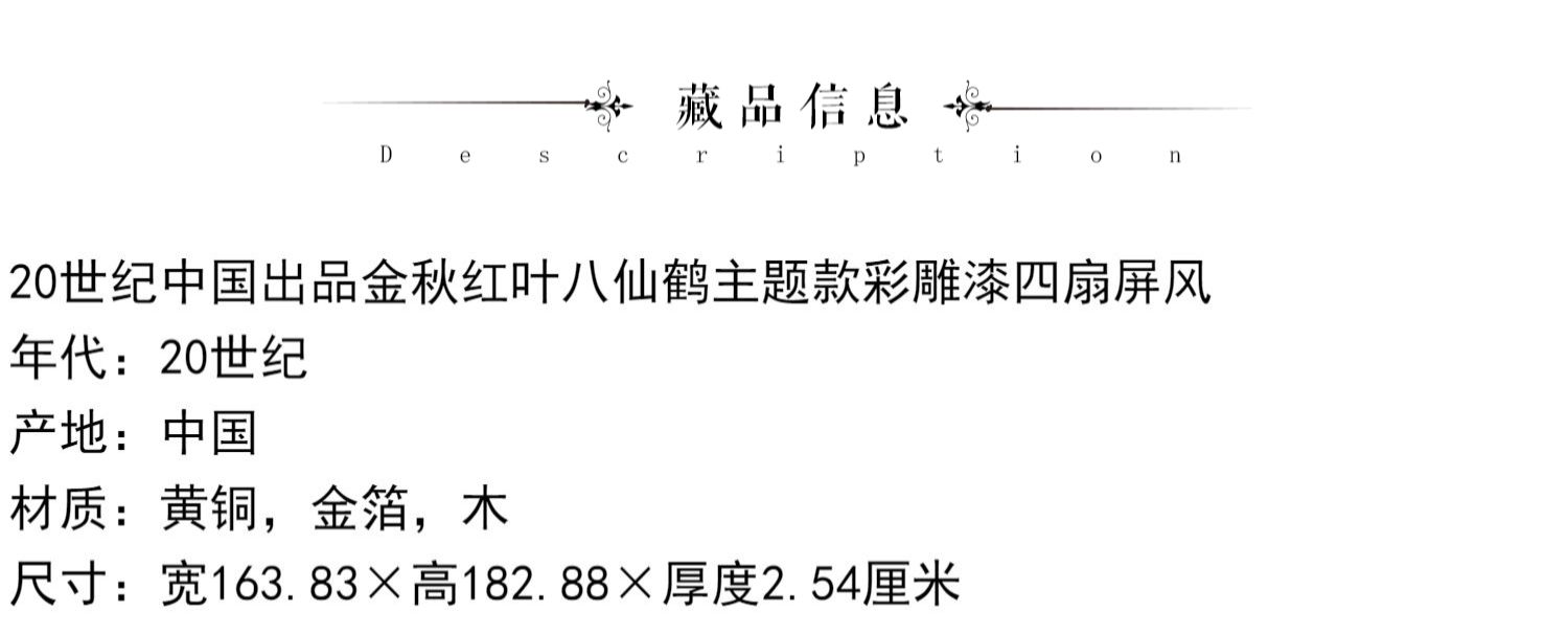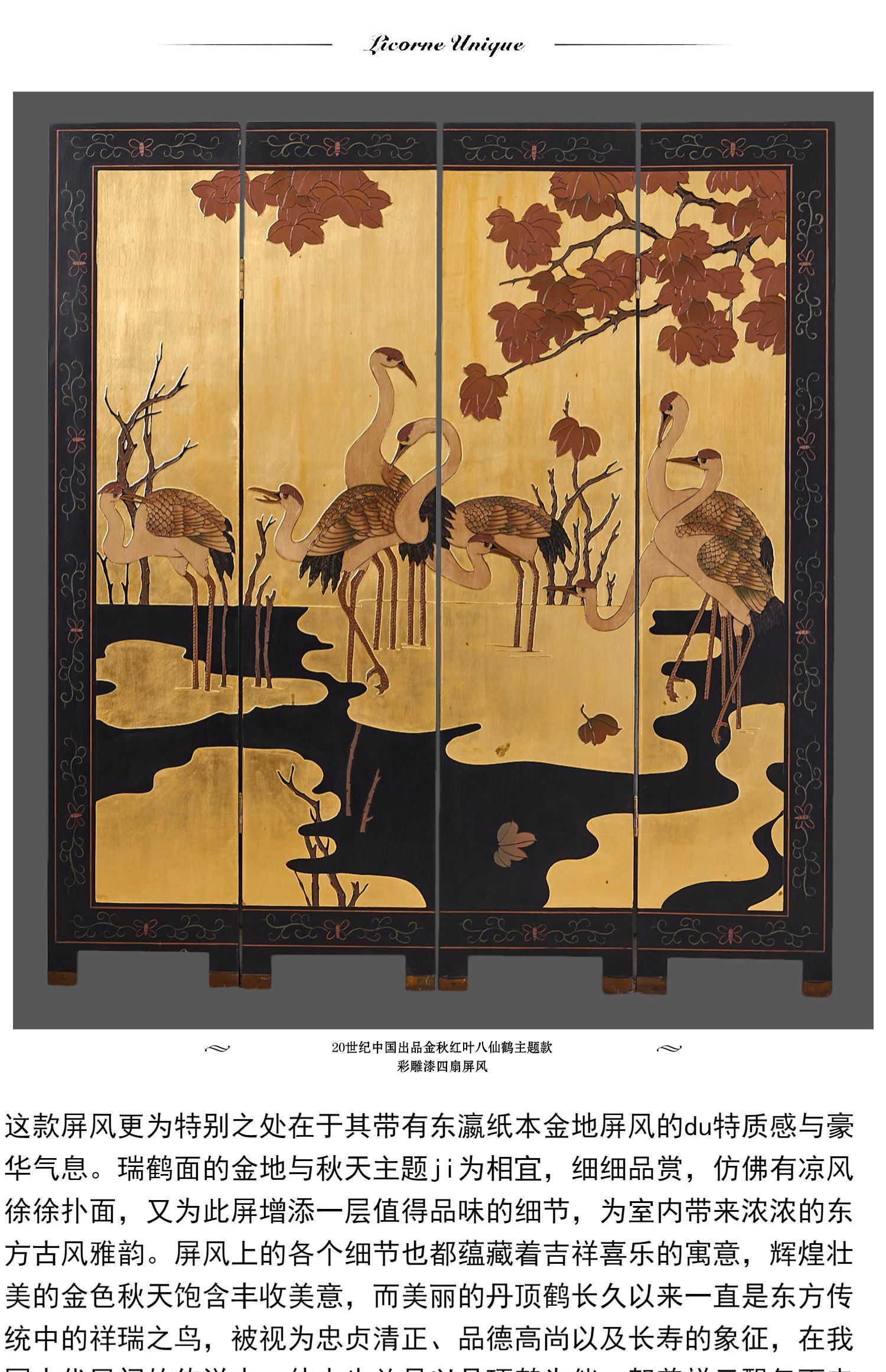 独角鹿西洋古董中国金秋红叶八仙鹤主题款彩雕漆四扇屏风