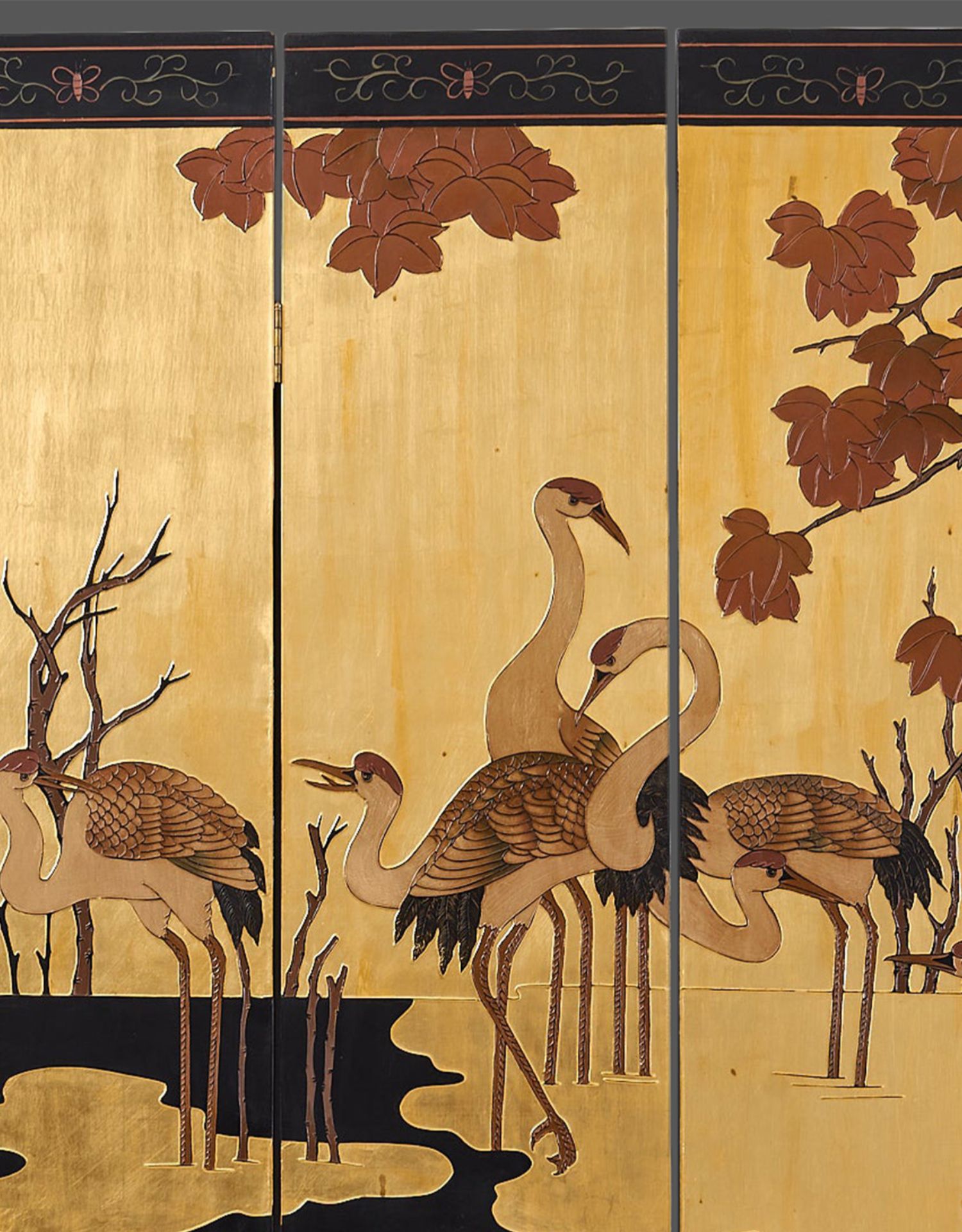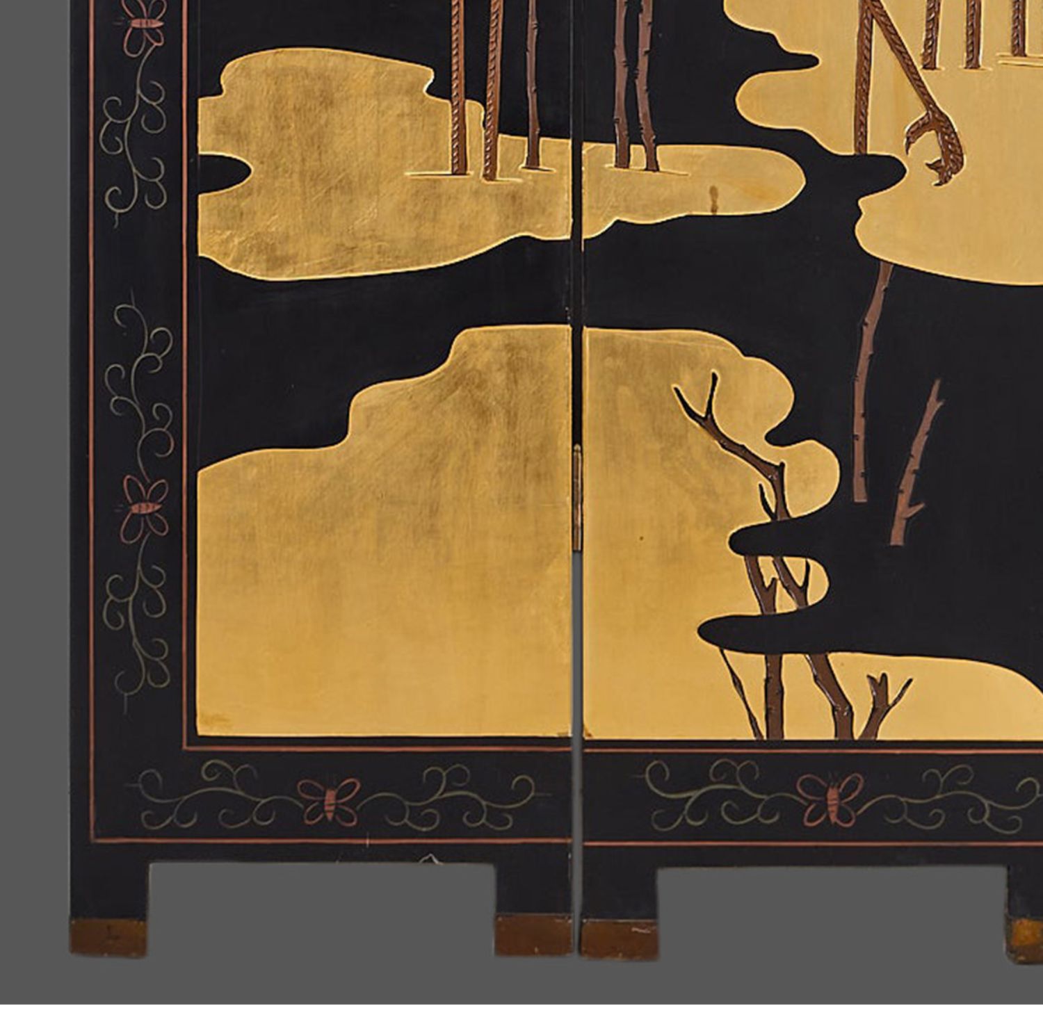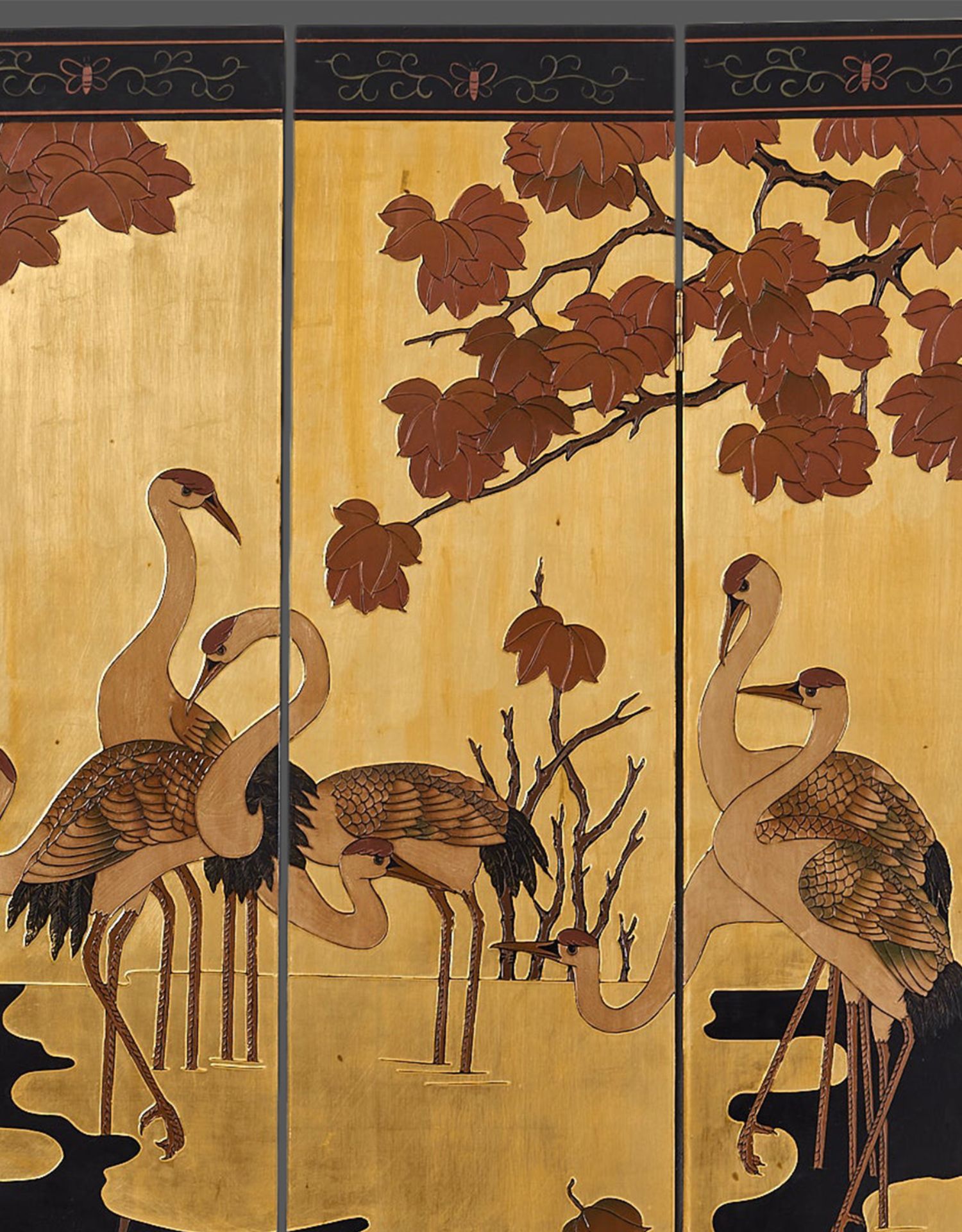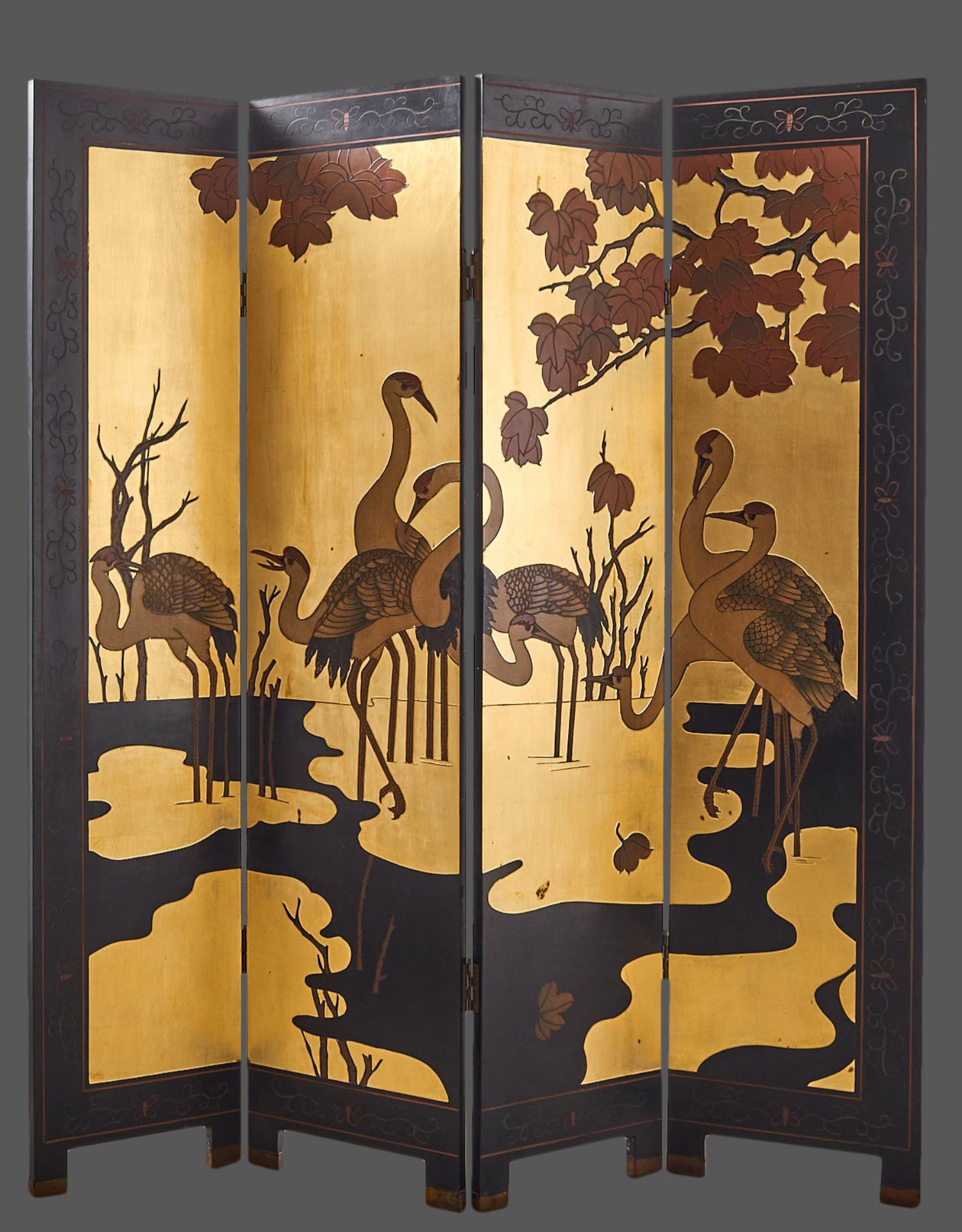 独角鹿西洋古董中国金秋红叶八仙鹤主题款彩雕漆四扇屏风