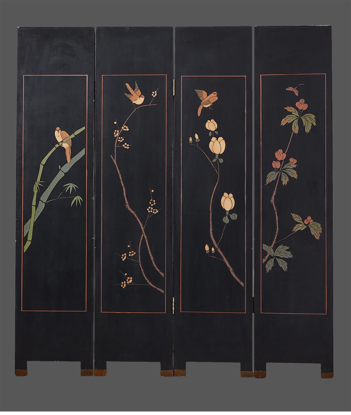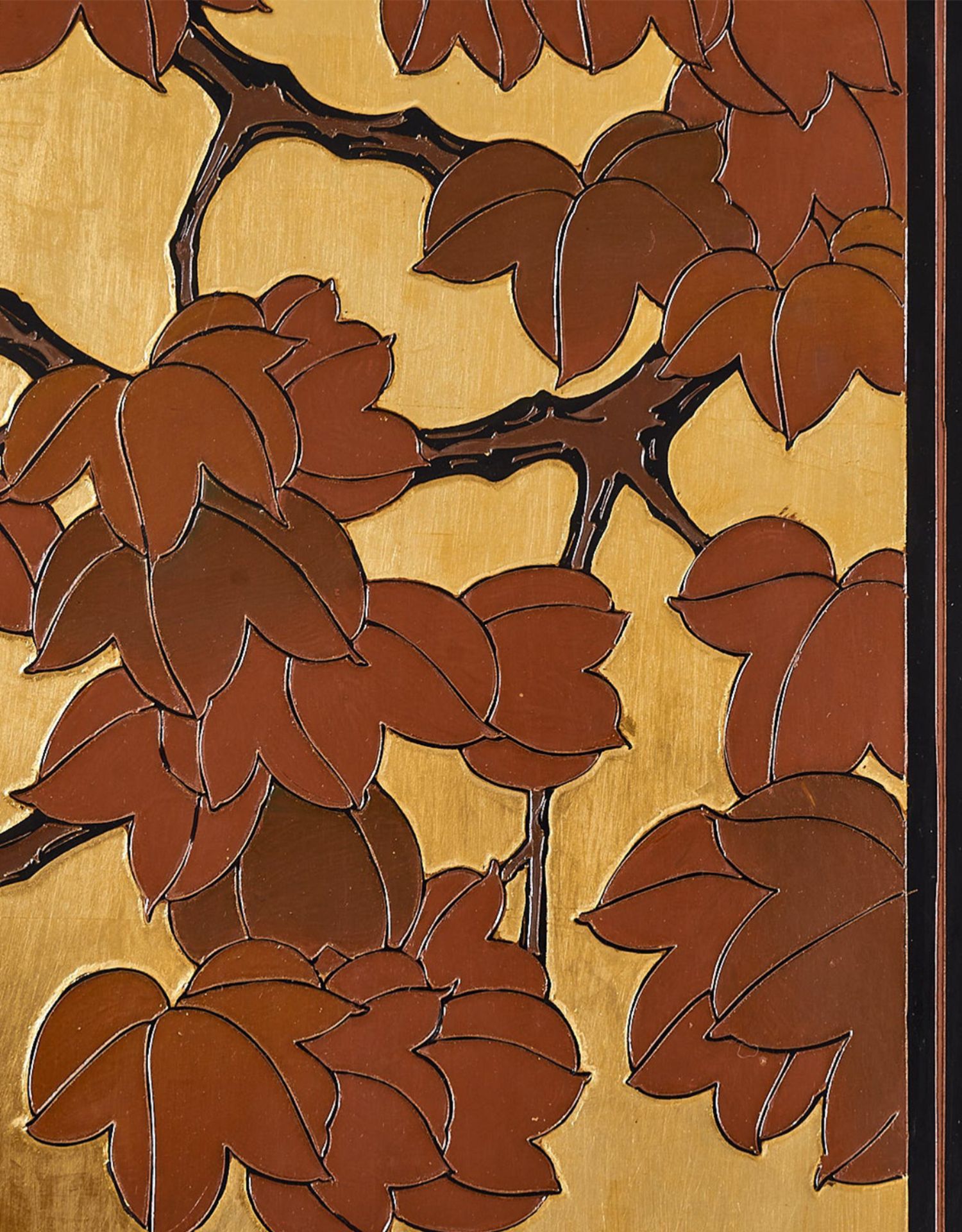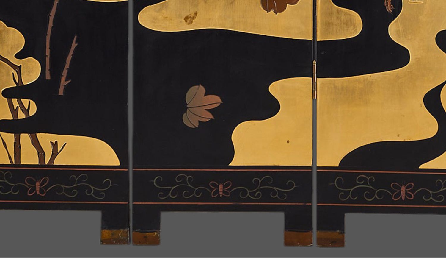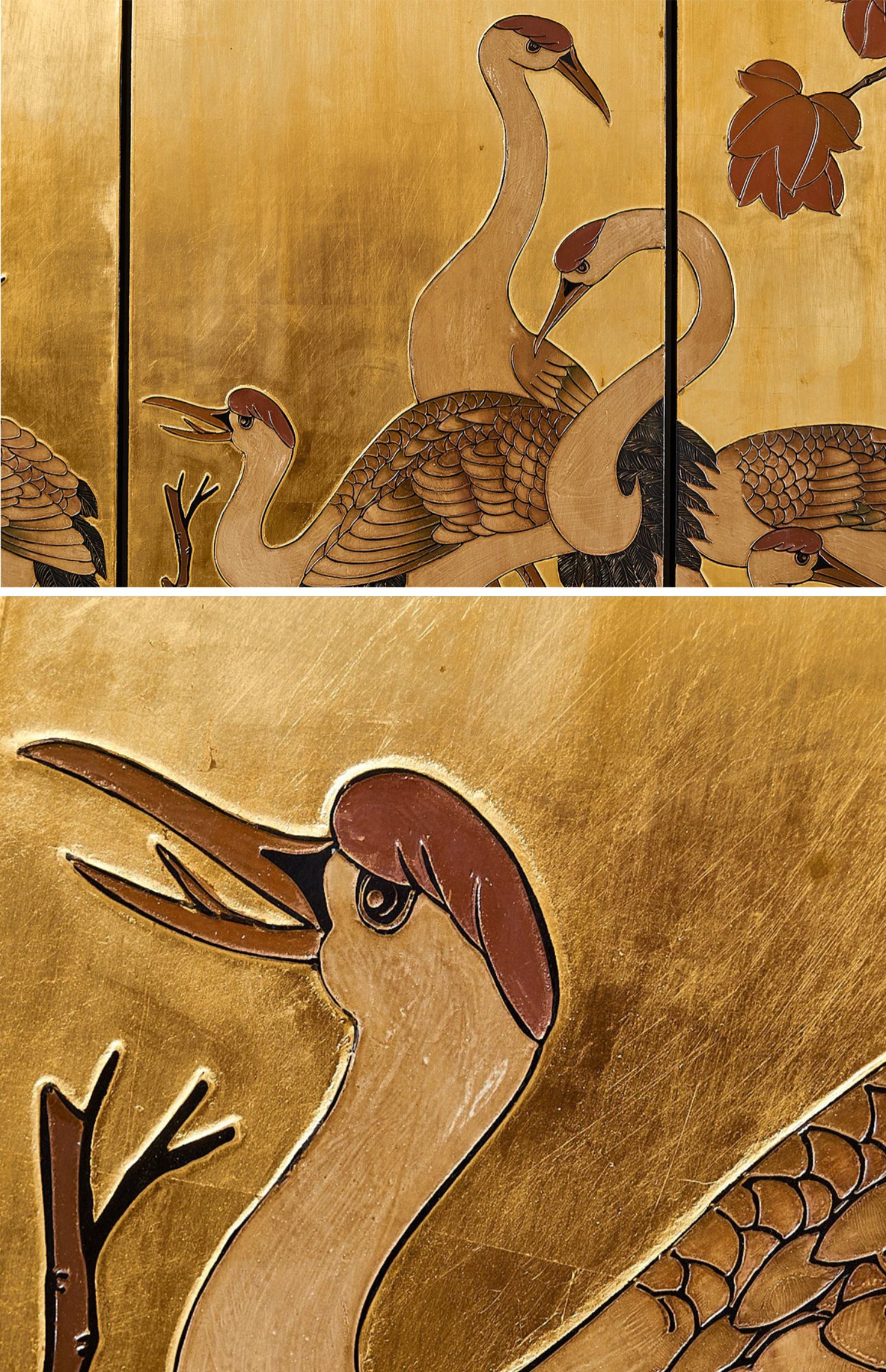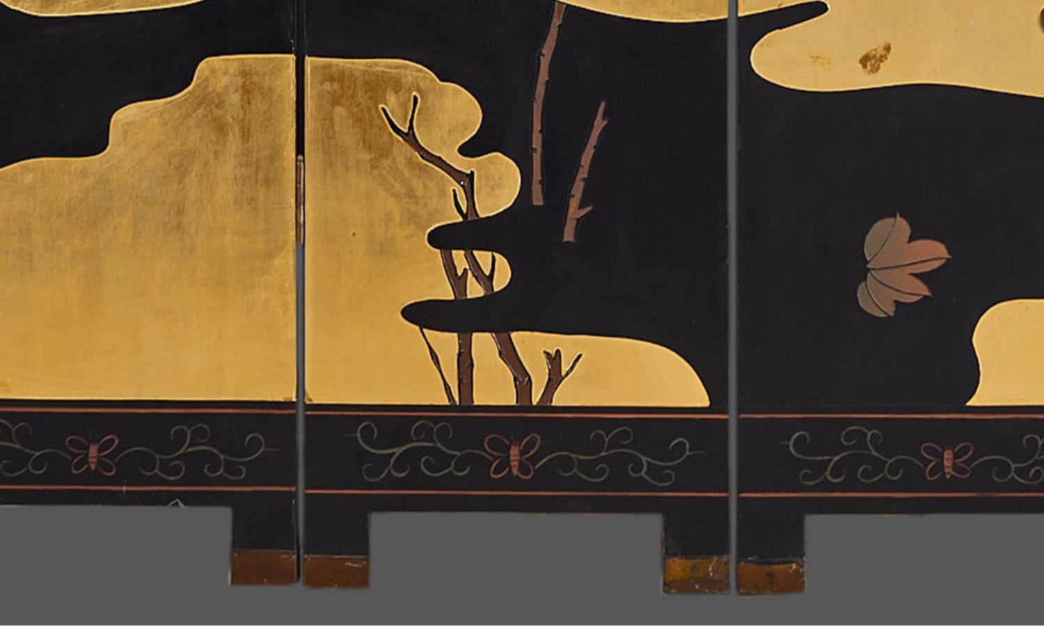 独角鹿西洋古董中国金秋红叶八仙鹤主题款彩雕漆四扇屏风