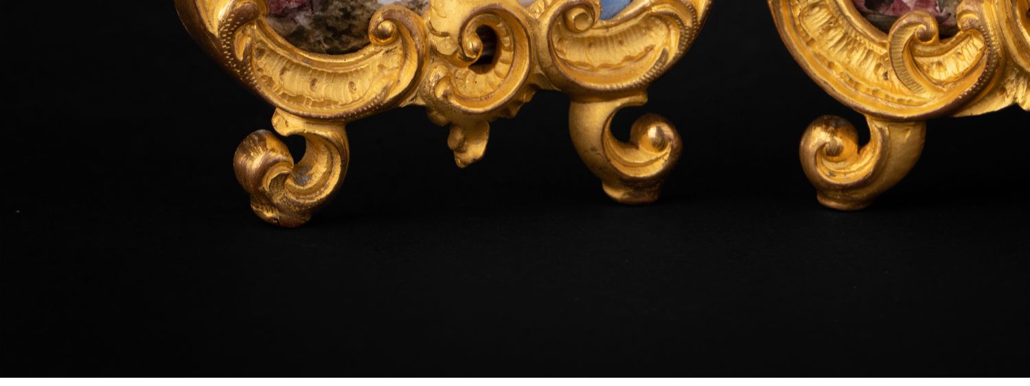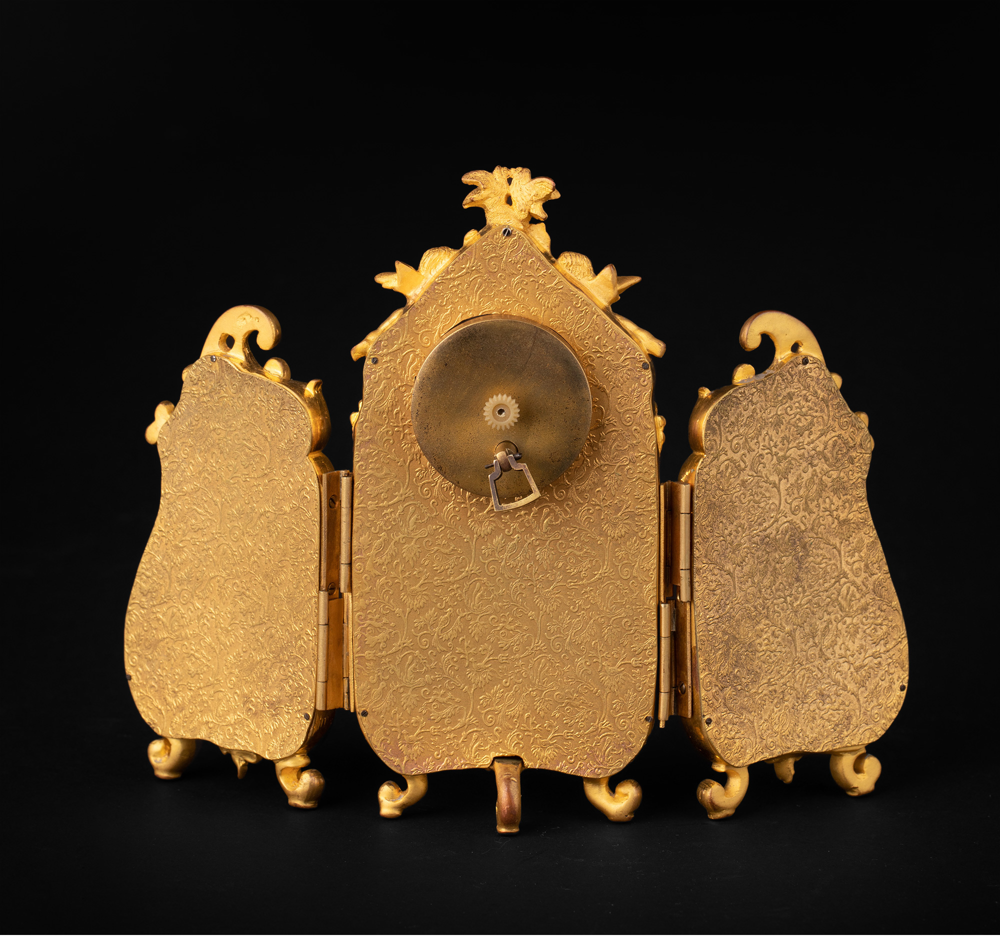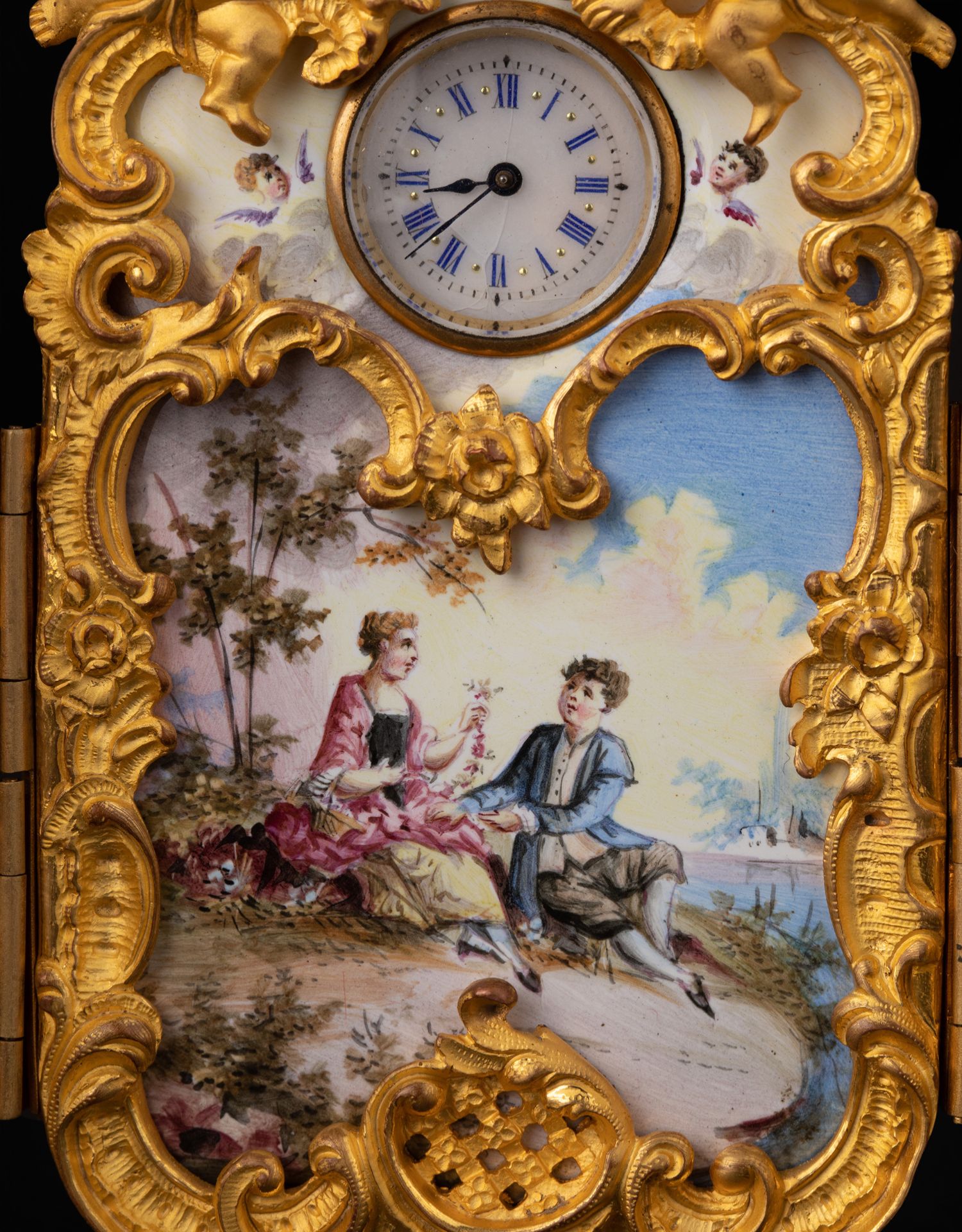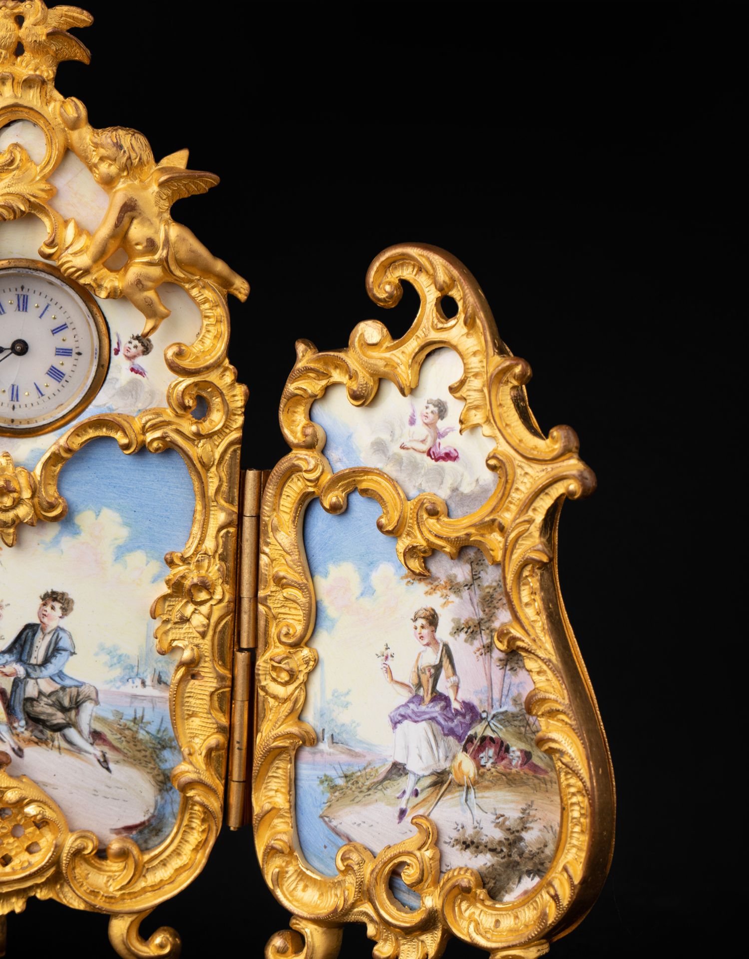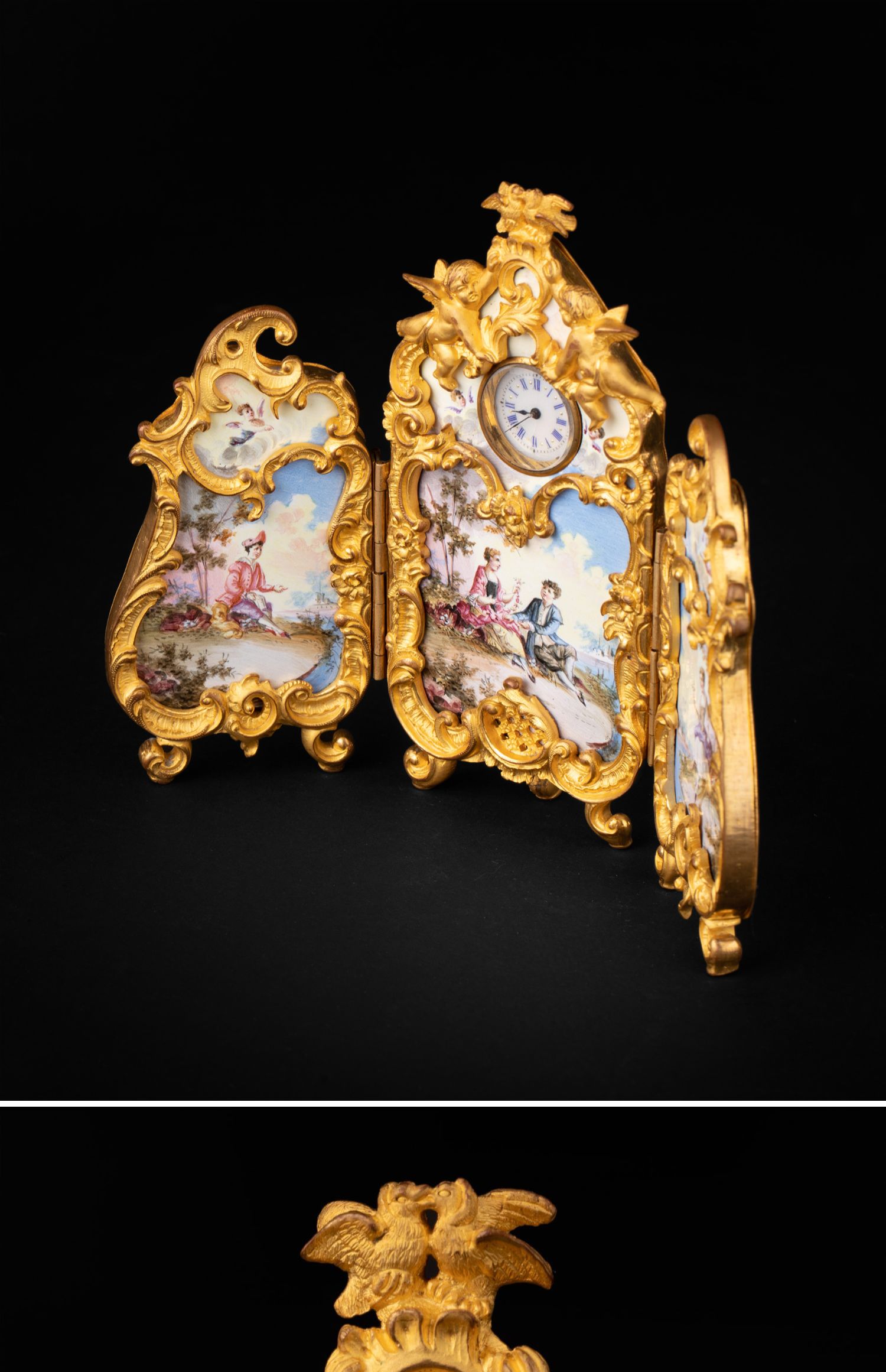 独角鹿西洋古董奥地利洛可可风铜鎏金彩色珐琅屏风式微缩座钟摆件