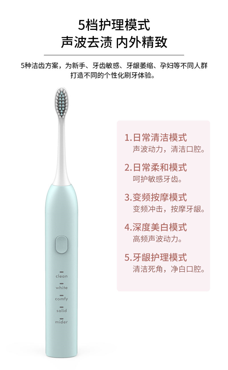 【轻松刷出小白牙 送刷头】 5档调节 USB充电 超长续航 细软刷毛不伤牙龈 居家日用情侣电动牙刷