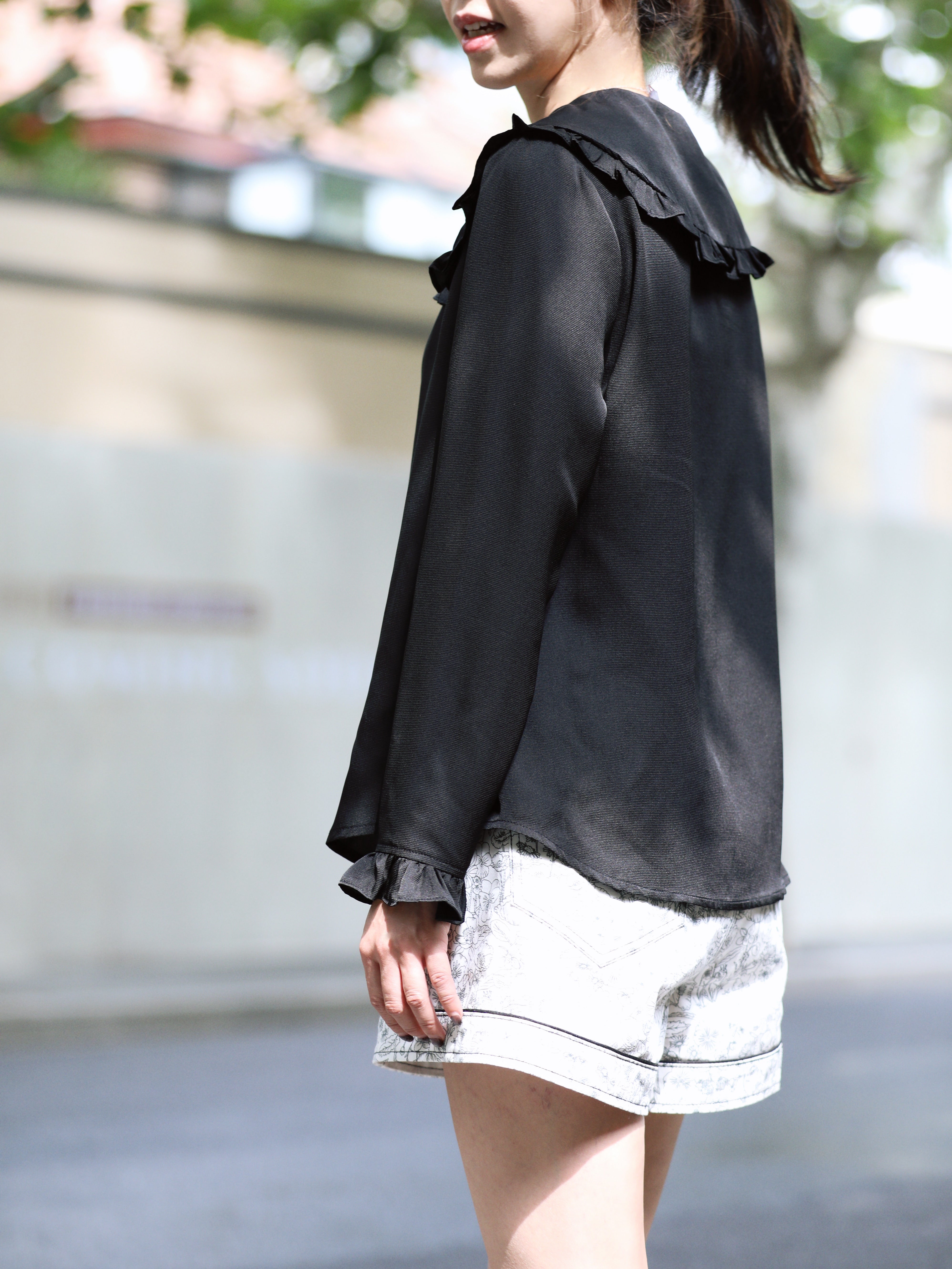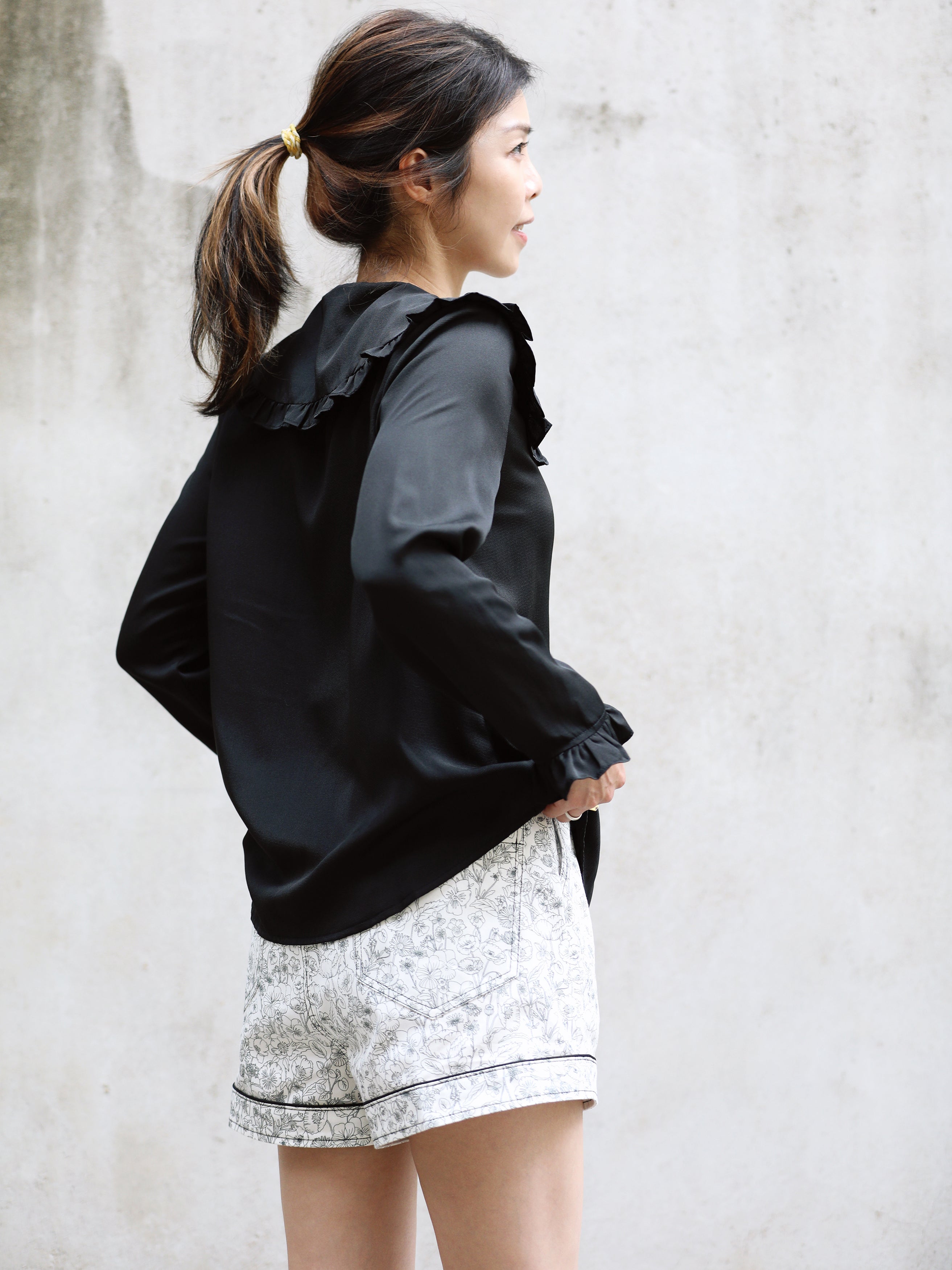 TYNVIE 黑色荷叶边领长袖丝质衬衫
