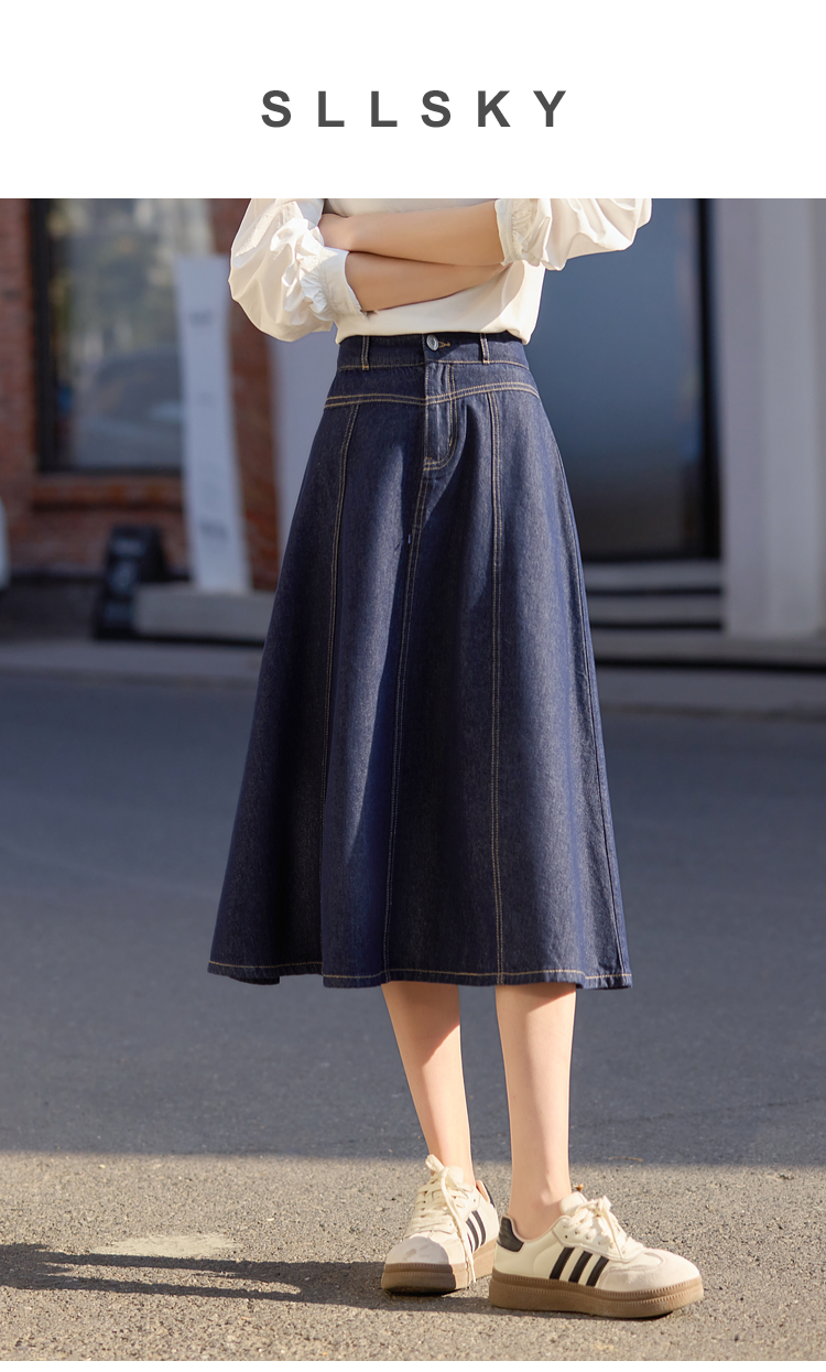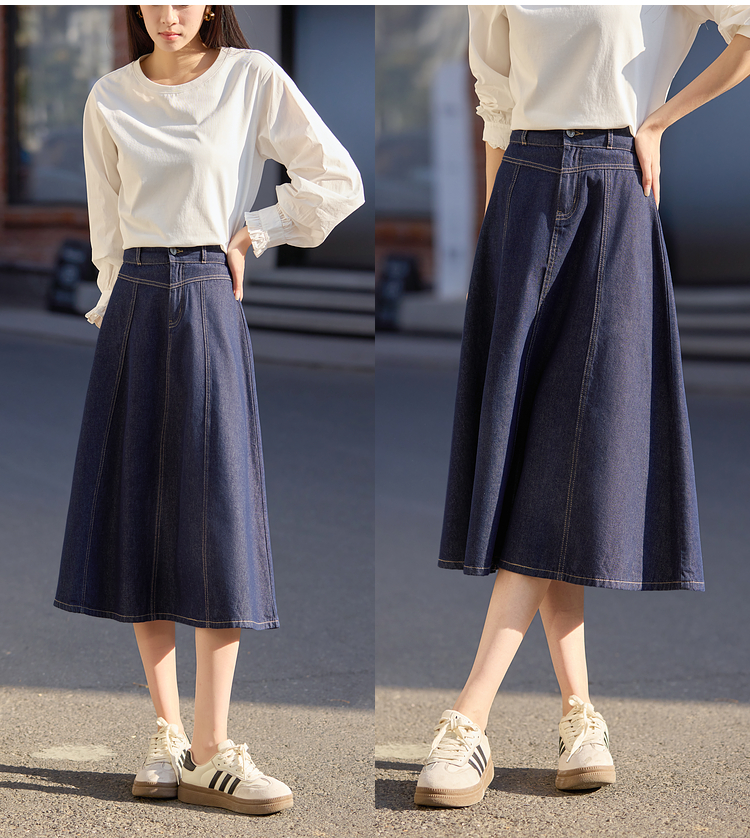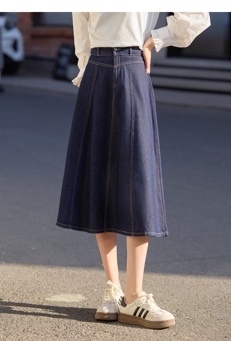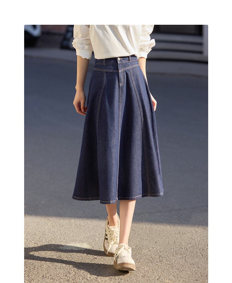 【专属特价】熙世界法式原色牛仔半身裙女2025春秋新款高腰显瘦中长裙A字伞裙
