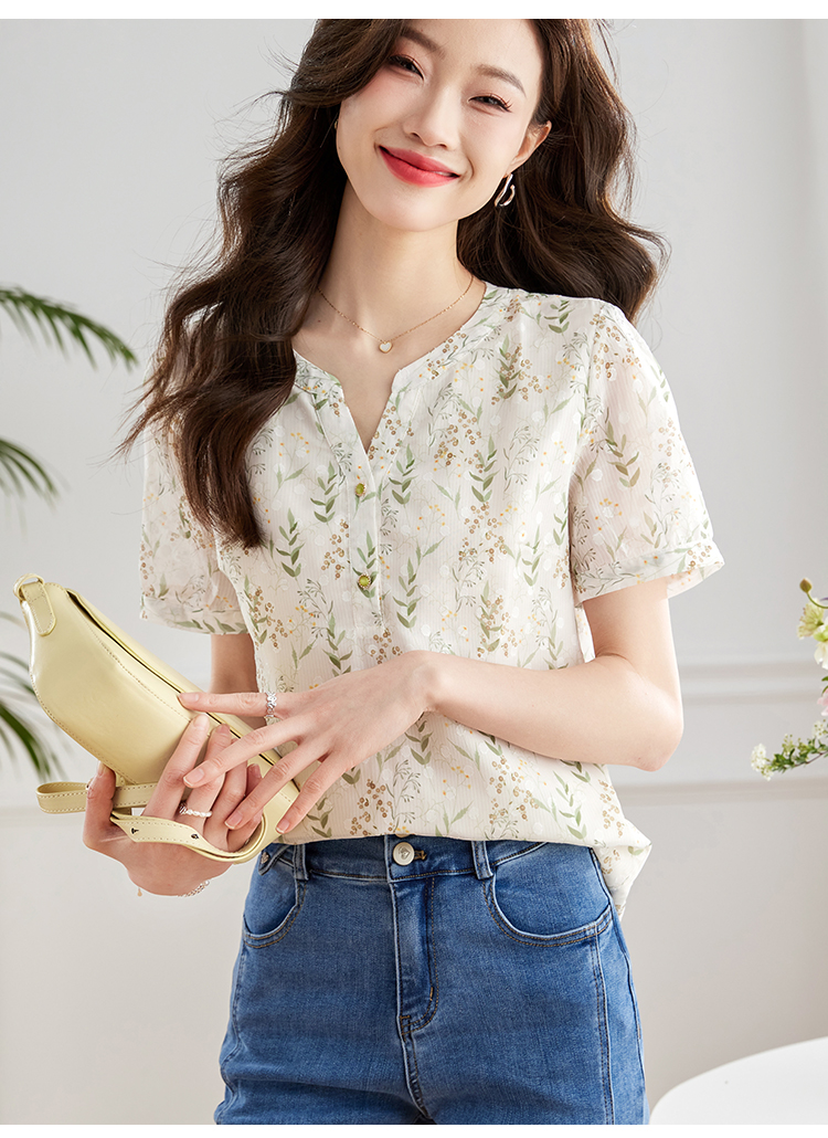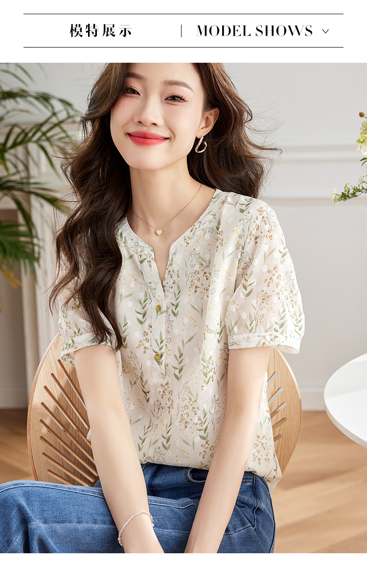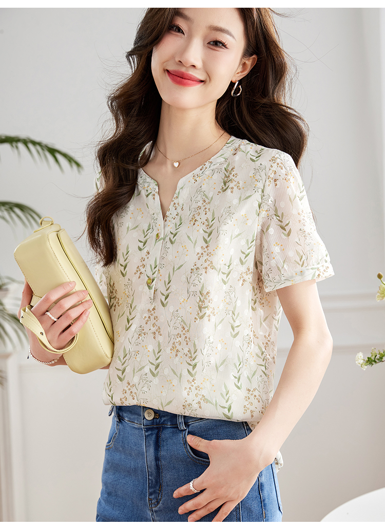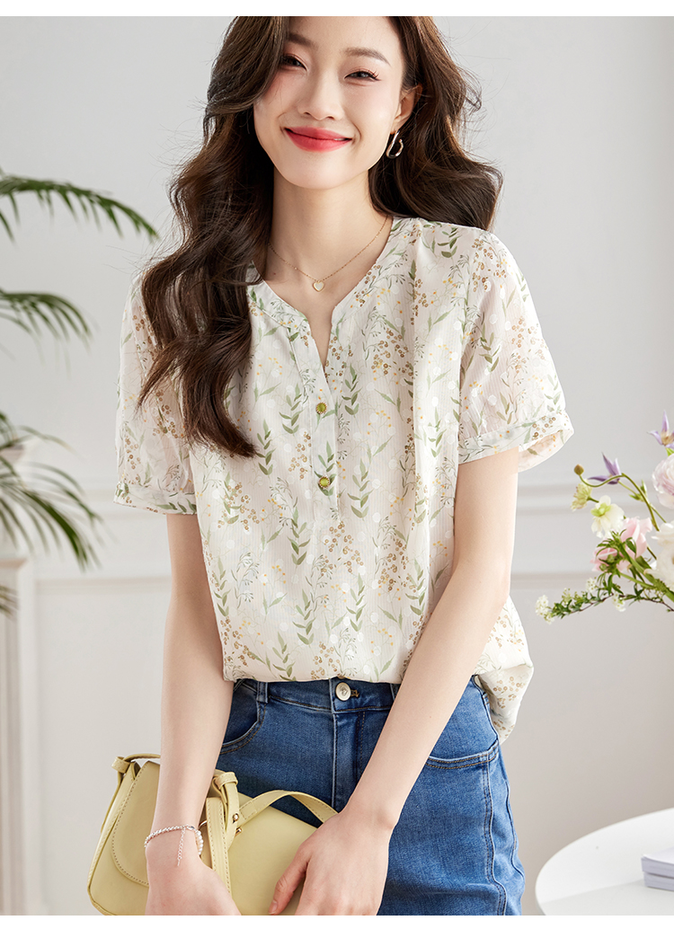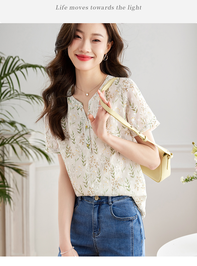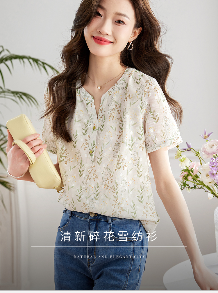 【专属特价】熙世界2025夏季新款法式碎花雪纺衫上衣时尚女装时髦洋气短袖小衫
