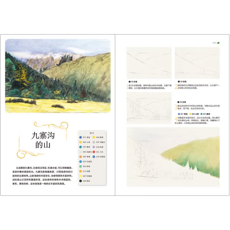 这本书中所画的风景,是我在2017 年6 月对南丝绸之路沿线神树信仰做田野调查的过程中,路遇的美景。应陈晓杰主编写一本以彩铅风景为主题的图书之邀,我突然灵机一动,干脆以这次路遇之景为题材。既与读者分享了美景,又“现身说法”,跟读者交流如何把身边的风景变成彩铅画。地处川、藏、滇边境的横断山脉下,分布有岷江、大渡河、雅砻江、澜沧江、怒江等主要江河及支系河流,呈由北向南的流向。这一区域从石器时代到今天,众多民族迁徙、生活于此,费孝通先生将这一地区称为“民族走廊”。这条路也是古蜀通往印度的古代文化和贸易之路,《史记•西南夷列传》中将它称为“蜀身毒道”,现在大家称它为南丝绸之路。这次考察,向北到达茂县、汶川藏族和羌族地区,向南经由西昌、布拖、喜德、大关、威宁、石林、昭通、盘县、云南、保山等地,最后到达中缅边界瑞丽市。除了收集彝族、苗族神树信仰习俗和服饰资料外,同时进行写生、摄影,静静地用眼睛和心灵触摸身边的风景。置身于自然之中,时间似乎变慢了,渐渐体会到了王羲之《兰亭集序》中所说的“仰观宇宙之大,俯察品类之盛,所以游目骋怀,足以极视听之娱”的感受。这里有五彩斑斓的瑶池玉盆的九寨溪水、云霄佛光的峨眉山、青翠晶莹的泸沽湖、秀峰延绵的石林、神秘清净的色达、世外桃源的普者黑、异域风情的瑞丽傣寨……画风景时,绘画对象的选择十分重要,西南地区高原气候的风景色光变化丰富、色彩浓郁,这本身就很适合绘画,对初学者辨识颜色和调和颜色来说,是一个美丽的开始!