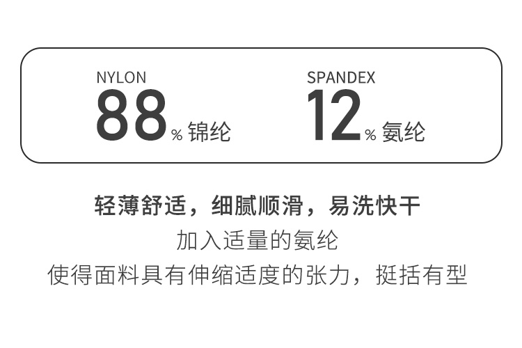 | 安全等级: B类 | 材质成分: 聚酰胺纤维(锦纶)88% 聚氨酯弹性纤维(氨纶)12% |