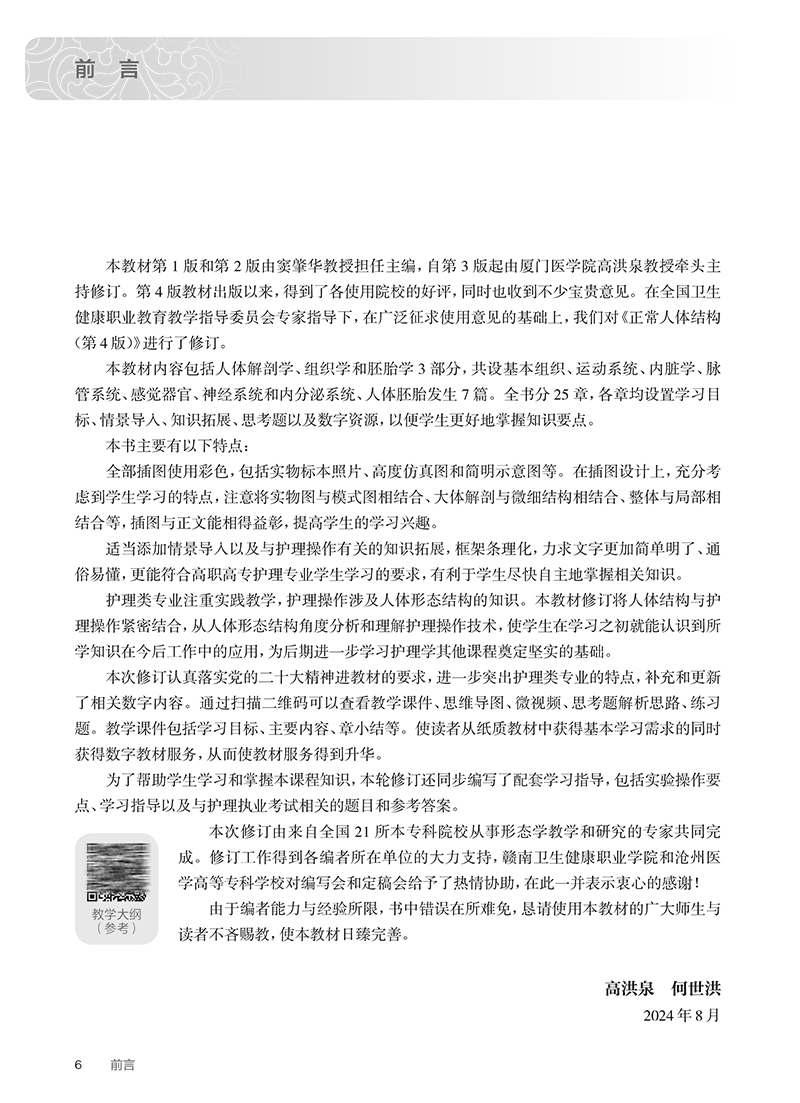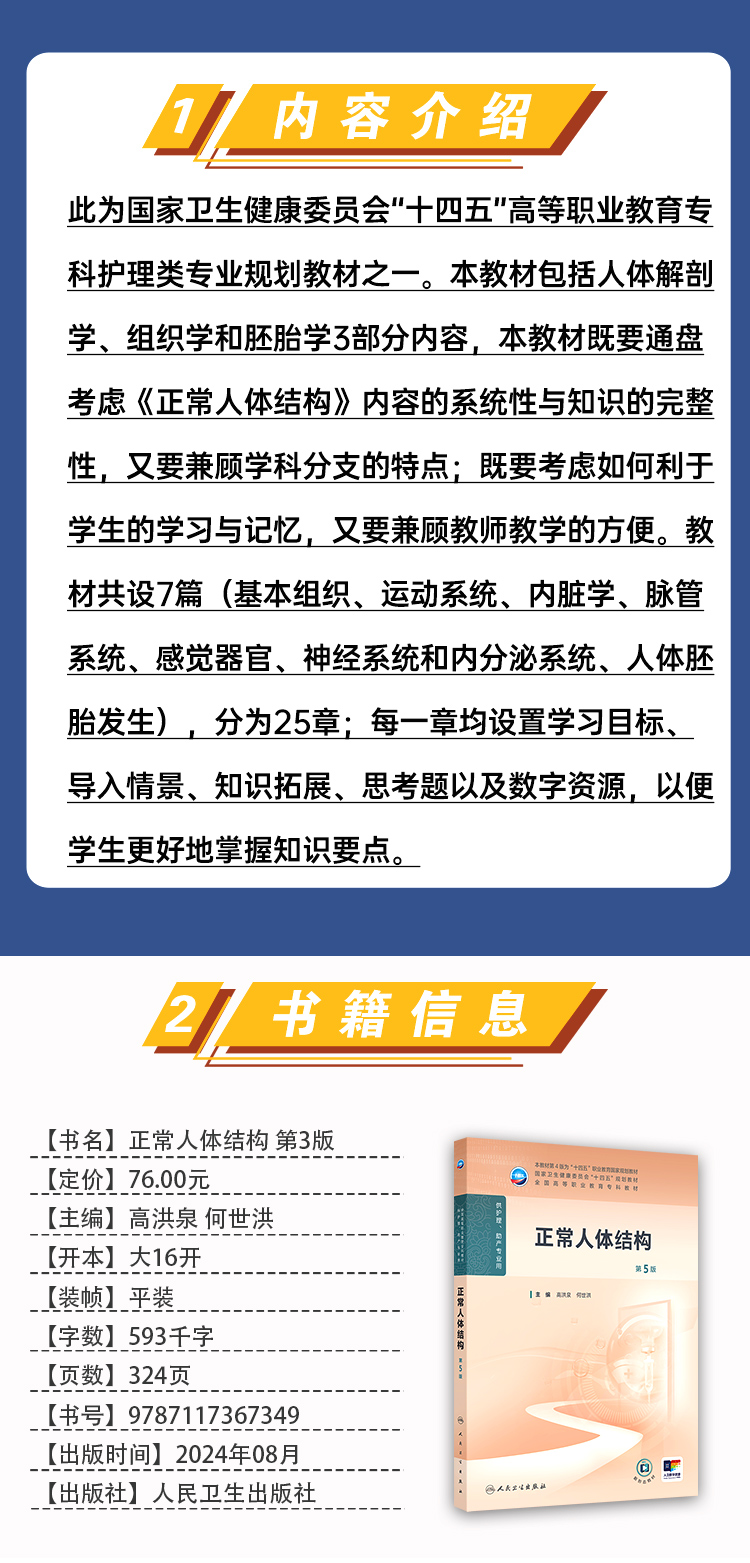 正常人体结构 第5版 十四五规划教材 全国高等职业教育专科教材 供护理助产专业用 高洪泉 何世洪编 人民卫生出版社9787117367349