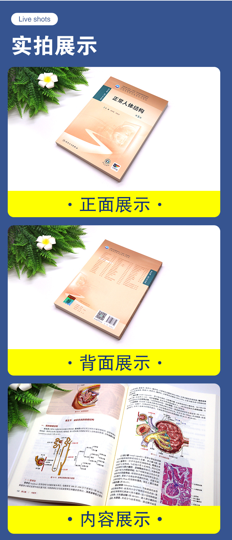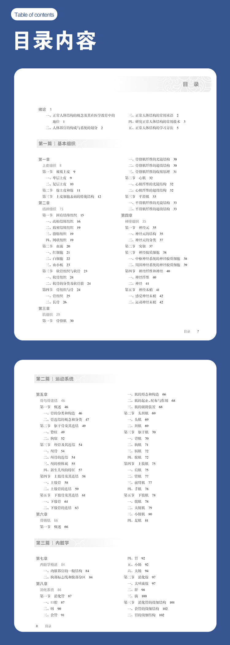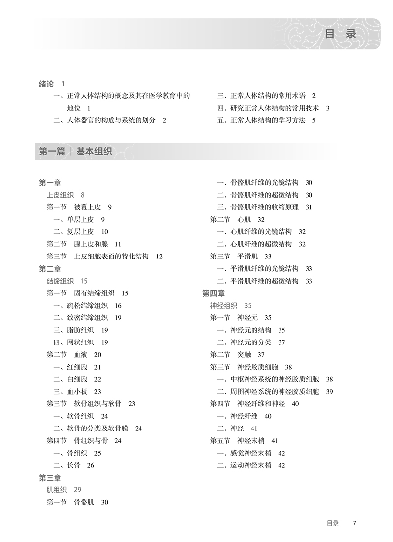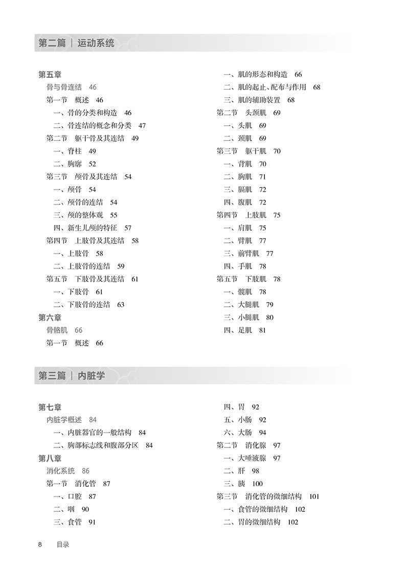绪论/1 一、正常人体结构的概念及其在医学教育中的地位/1 二、人体器官的构成与系统的划分/2 三、正常人体结构的常用术语/2 四、研究正常人体结构的常用技术/3 五、正常人体结构的学习方法/5 第一篇|基本组织 第一章上皮组织/8 第一节被覆上皮/9 一、单层上皮/9 二、复层上皮/10 第二节腺上皮和腺/11 第三节上皮细胞表面的特化结构/12 第二章结缔组织/15 第一节固有结缔组织/15 一、疏松结缔组织/16 二、致密结缔组织/19 三、脂肪组织/19 四、网状组织/19 第二节血液/20 一、红细胞/21 二、白细胞/22 三、血小板/23 第三节软骨组织与软骨/23 一、软骨组织/24 二、软骨的分类及软骨膜/24 第四节骨组织与骨/24 一、骨组织/25 二、长骨/26 第三章肌组织/29 第一节骨骼肌/30 一、骨骼肌纤维的光镜结构/30 二、骨骼肌纤维的超微结构/30 三、骨骼肌纤维的收缩原理/31 第二节心肌/32 一、心肌纤维的光镜结构/32 二、心肌纤维的超微结构/32 第三节平滑肌/33 一、平滑肌纤维的光镜结构/33 二、平滑肌纤维的超微结构/33 第四章神经组织/35 第一节神经元/35 一、神经元的结构/35 二、神经元的分类/37 第二节突触/37 第三节神经胶质细胞/38 一、中枢神经系统的神经胶质细胞/38 二、周围神经系统的神经胶质细胞/39 第四节神经纤维和神经/40 一、神经纤维/40 二、神经/41 第五节神经末梢/41 一、感觉神经末梢/42 二、运动神经末梢/42 第五章骨与骨连结/46 第一节概述/46 一、骨的分类和构造/46 二、骨连结的概念和分类/47 第二节躯干骨及其连结/49 一、脊柱/49 二、胸廓/52 第三节颅骨及其连结/54 一、颅骨/54 二、颅骨的连结/54 三、颅的整体观/55 四、新生儿颅的特征/57 第四节上肢骨及其连结/58 一、上肢骨/58 二、上肢骨的连结/59 第五节下肢骨及其连结/61 一、下肢骨/61 二、下肢骨的连结/63 第六章骨骼肌/66 第一节概述/66 一、肌的形态和构造/66 二、肌的起止、配布与作用/68 三、肌的辅助装置/68 第二节头颈肌/69 一、头肌/69 二、颈肌/69 第三节躯干肌/70 一、背肌/70 二、胸肌/71 三、膈肌/72 四、腹肌/72 第四节上肢肌/75 一、肩肌/75 二、臂肌/77 三、前臂肌/77 四、手肌/78 第五节下肢肌/78 一、髋肌/78 二、大腿肌/79 三、小腿肌/80 四、足肌/81 第二篇|运动系统 第三篇|内脏学 第七章内脏学概述/84 一、内脏器官的一般结构/84 二、胸部标志线和腹部分区/84 第八章消化系统/86 第一节消化管/87 一、口腔/87 二、咽/90 三、食管/91 四、胃/92 五、小肠/92 六、大肠/94 第二节消化腺/97 一、大唾液腺/97 二、肝/98 三、胰/100 第三节消化管的微细结构/101 一、食管的微细结构/102 二、胃的微细结构/102 三、小肠的微细结构/104 四、大肠的微细结构/105 第四节消化腺的微细结构/105 一、肝的微细结构/105 二、胰的微细结构/107 第九章呼吸系统/110 第一节呼吸道/111 一、鼻/111 二、咽/112 三、喉/112 四、气管与主支气管/115 第二节肺/117 一、肺的位置和形态/117 二、肺内支气管及支气管肺段/118 第三节胸膜/118 一、胸膜的分部/118 二、胸膜腔/118 三、胸膜与肺的体表投影/119 第四节纵隔/120 一、上纵隔/120 二、下纵隔/120 第五节呼吸系统的微细结构/120 一、气管的微细结构/120 二、肺的微细结构/122 第十章泌尿系统/125 第一节肾/126 一、肾的形态/126 二、肾的位置与毗邻/126 三、肾的被膜/127 四、肾的结构/128 第二节输尿管/128 一、输尿管的位置和分部/128 二、输尿管的狭窄/129 第三节膀胱/129 一、膀胱的形态/130 二、膀胱的内部结构/130 三、膀胱的位置和毗邻/130 第四节尿道/131 第五节泌尿系统的微细结构/132 一、肾的微细结构/132 二、膀胱的微细结构/137 第十一章男性生殖系统/139 第一节男性内生殖器/140 一、睾丸/140 二、附睾/140 三、输精管和射精管/141 四、附属腺/141 第二节男性外生殖器/142 一、阴囊/142 二、阴茎/143 第三节男性尿道/143 第四节男性生殖系统的微细结构/145 一、睾丸的微细结构/145 二、附睾的微细结构/147 第十二章女性生殖系统/148 第一节女性内生殖器/149 一、卵巢/149 二、输卵管/149 三、子宫/150 四、阴道/151 五、前庭大腺/151 第二节女性外生殖器/152 第三节女性生殖系统的微细结构/152 一、卵巢的微细结构/152 二、子宫的微细结构/155 【附】乳房/156 【附】会阴/158 一、尿生殖区的肌和尿生殖膈/158 二、肛区的肌和盆膈/158 第十三章腹膜/160 一、腹膜与腹、盆腔脏器的关系/161 二、腹膜形成的结构/161 第十四章心血管系统/166 第一节概述/166 一、心血管系统的组成/166 二、血液循环/167 第二节心/168 一、心的位置、毗邻与外形/168 二、心腔结构/169 三、心的构造/171 四、心传导系/173 五、心的血管/174 六、心包/175 七、心的体表投影/176 第三节动脉/176 一、肺循环的动脉/176 二、体循环的动脉/177 第四节静脉/185 一、肺循环的静脉/186 二、体循环的静脉/186 第五节心血管的微细结构/193 一、心壁的微细结构/193 二、血管的微细结构/193 三、微循环/196 第十五章淋巴系统/197 第一节淋巴管道/198 一、毛细淋巴管/198 二、淋巴管/198 三、淋巴干/199 四、淋巴导管/199 第二节全身主要部位的淋巴结/200 一、头颈部淋巴结/200 二、上肢淋巴结/201 三、躯干部淋巴结/201 四、下肢淋巴结/203 第三节淋巴组织/203 一、弥散淋巴组织/204 二、淋巴小结/204 第四节淋巴器官/204 一、胸腺/205 二、淋巴结/206 三