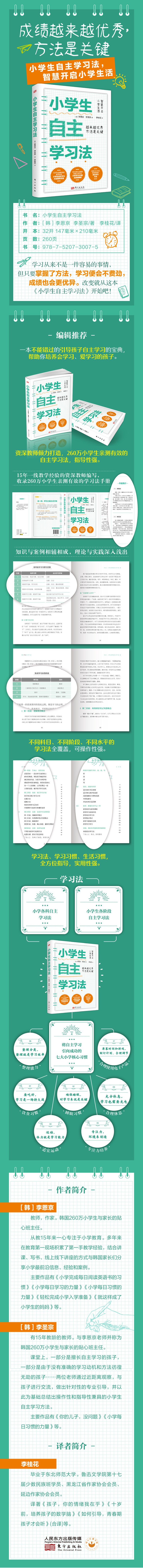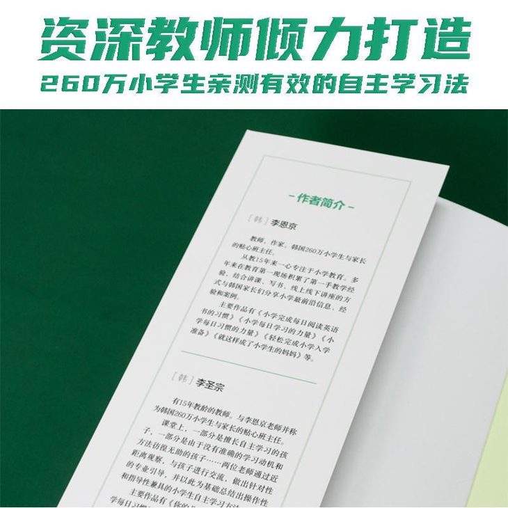这本书的作者是来自韩国的李恩京和李圣宗。两位老师15年来一直奋战在小学教育的一线,同时因为家有两个小学生,也深谙家庭辅导之道。《小学生自主学习法》正是两位老师根据多年的教学经验和家庭辅导的经验总结出来的小学生自主学习法的宝典,其里面的学习法经过260万韩国小学生亲测有效。所以这本书的指导性有多强,显而易见。