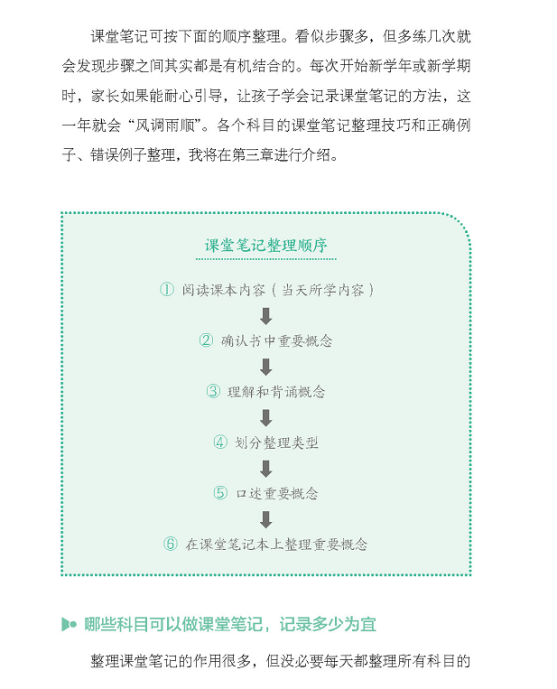 再比如下面展示的,怎样给各科制订长期学习计划以及整理课堂笔记的顺序,都可以直接套用到自己孩子的身上,不用家长费心琢磨。