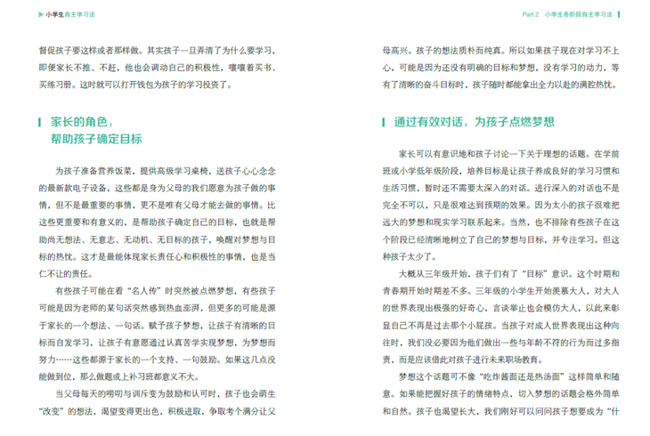 比如,作为家长,应该如何帮助孩子树立人生目标,通过什么样的语言帮助孩子点燃梦想,让孩子能“自奋蹄”。可能每个家长都有不一样的方法,但是我认为这本书中提供的方法是最实用、最不费爹妈、孩子最易接受的方法。