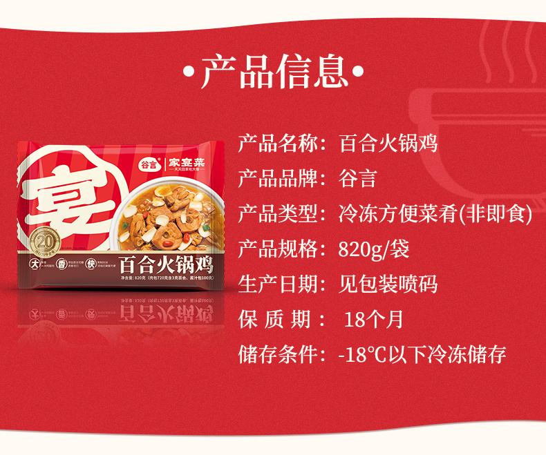 谷言家宴菜-百合火锅鸡820g*2袋-不支持7天无理由退换货