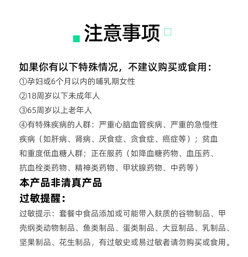 本商城提供的定制产品仅并非适用于所有人群。如用户患有疾病,长期服用药物或其他可能影响方案执行的个体,应根据自身的健康状况进行适当的评估。在必要时,建议在医生或其他医疗专业人员的指导下进行使用。以下人群不适用本定制方案:备孕期女性、孕妇、哺乳期女性、未成年人以及老年人。