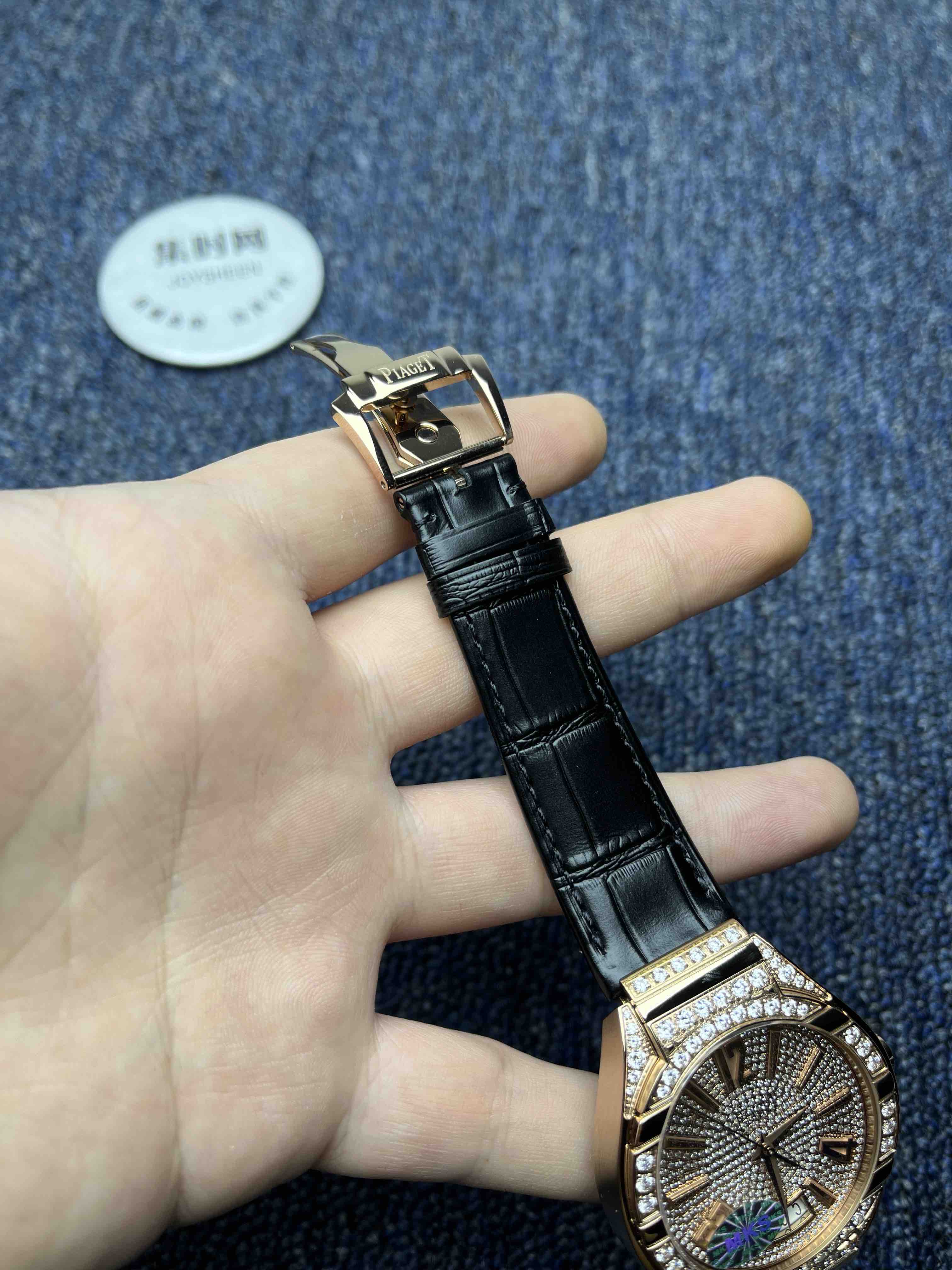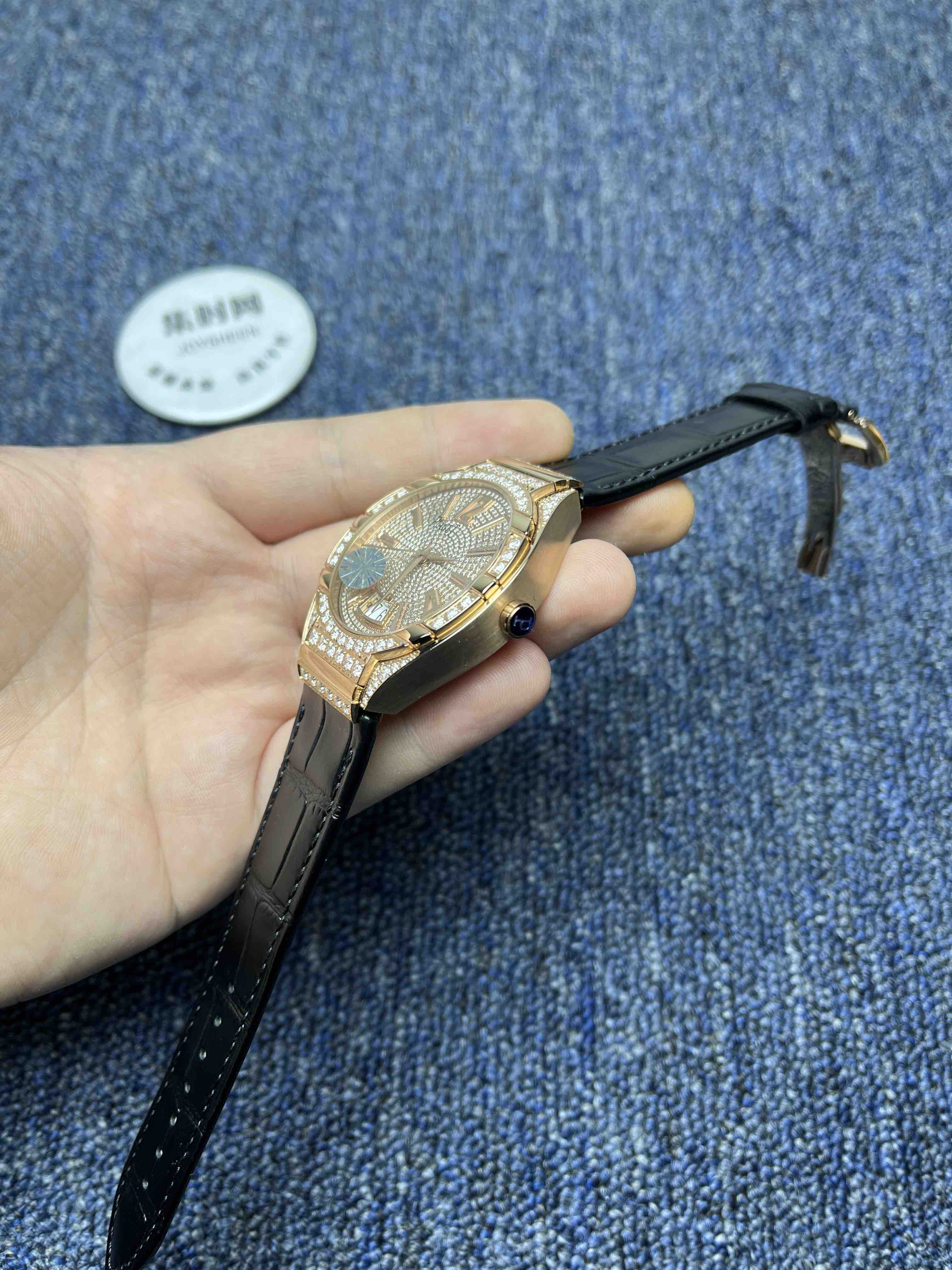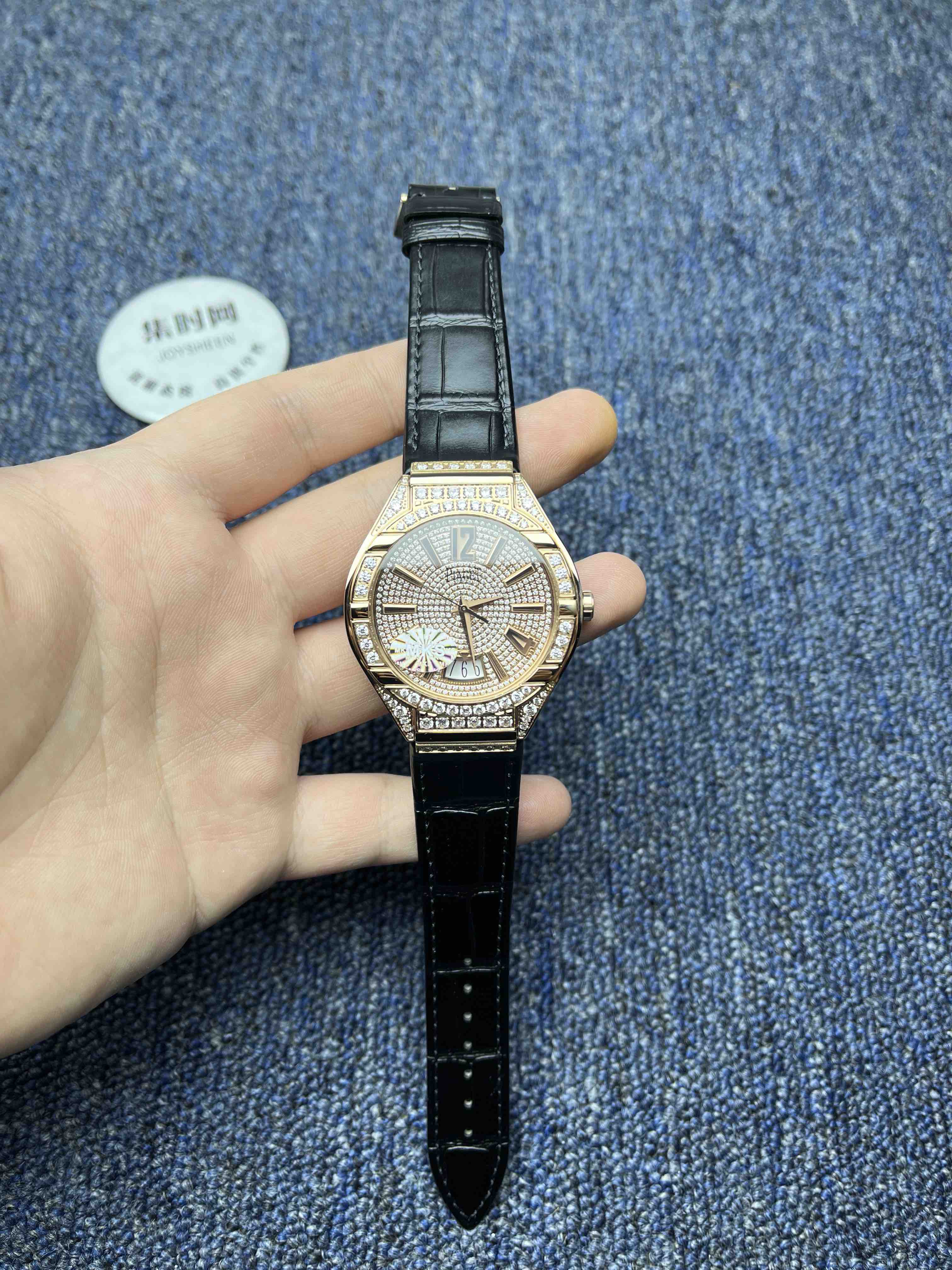 【表盘】价值不菲的盘面共拥有486颗ding级施华洛世奇。宝石的大小,切工和火彩都经过严格筛选,确保一致。12个精品刻度标识,采用CNC切削成型,在由制表师耐心修润,最后镶贴而上。