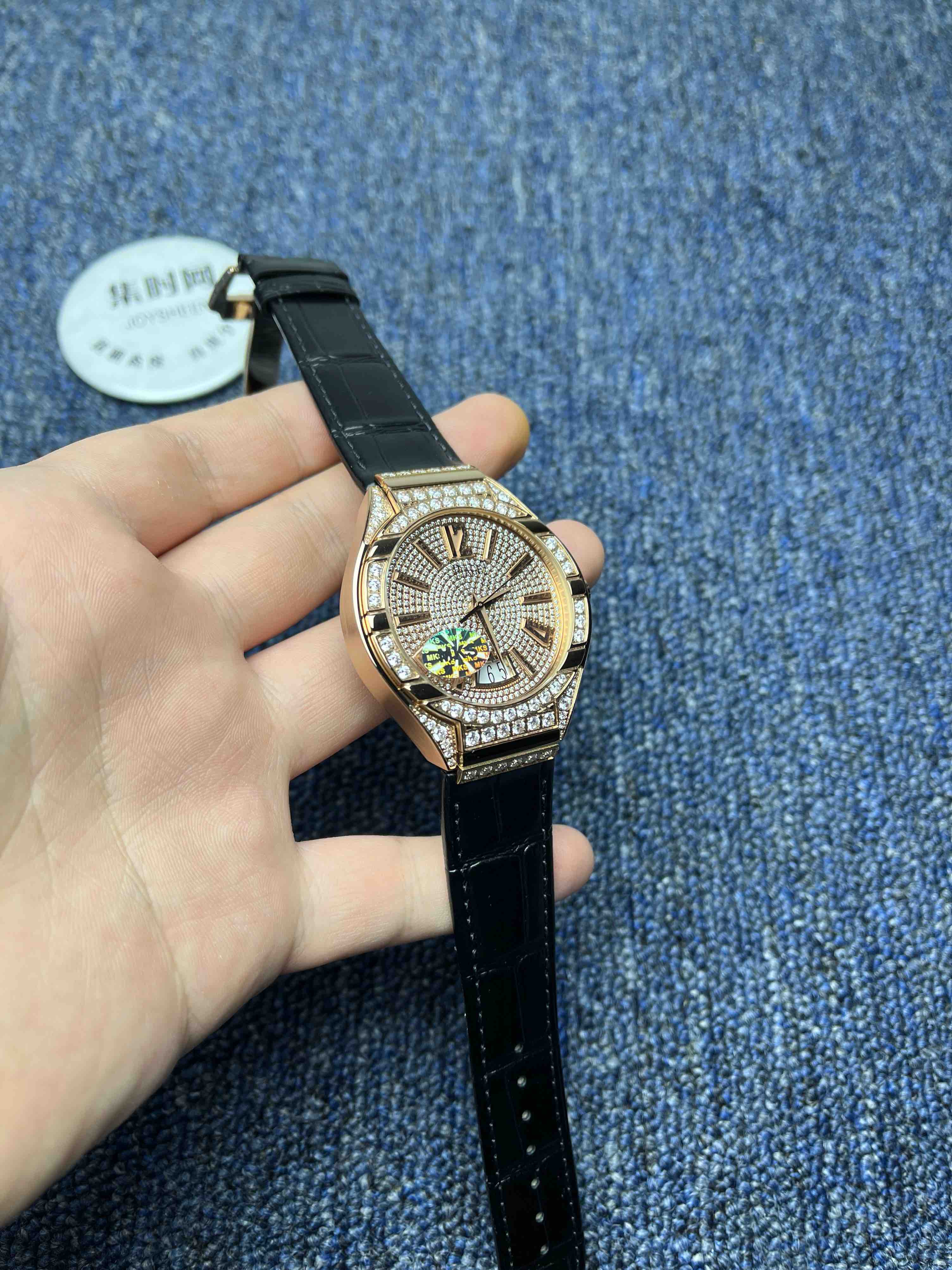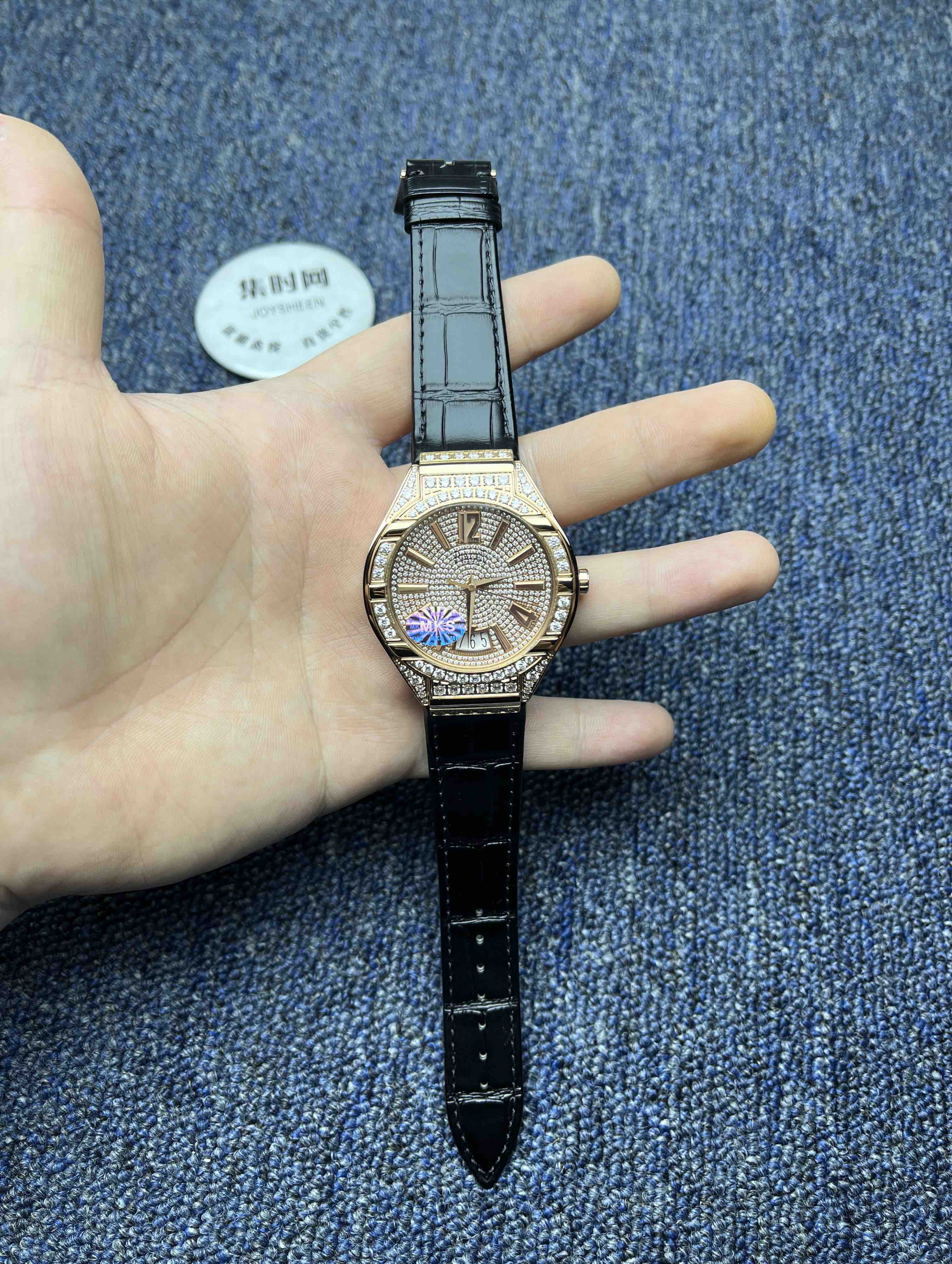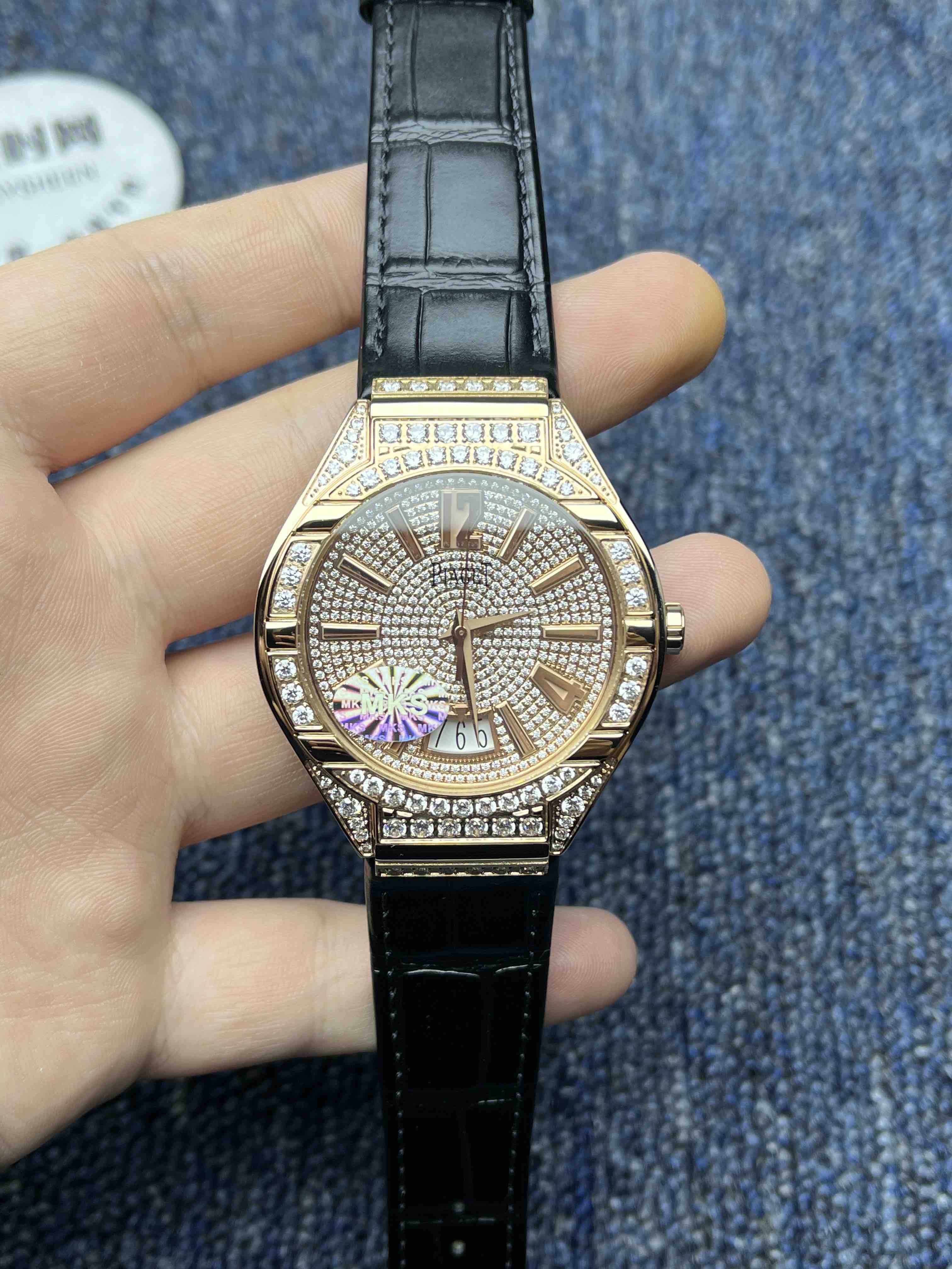 【表壳】枕形表壳,搭配微弧式表肩,每一个成品壳套都经过MK质检员精挑细选,在进行珠宝镶嵌加工。为了达到原装的效果(整齐,镶嵌风格统一)。表壳上78颗ding级人工美钻,必须由一位珠宝镶嵌师一气呵成。