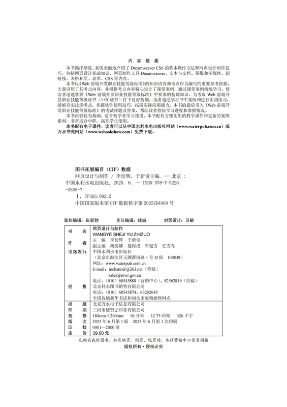 本书循序渐进、系统全面地介绍了Dreamweaver CS6的基本操作方法和网页设计制作技巧,包括网页设计基础知识、网页制作工具Dreamweaver、文本与文档、图像和多媒体、超链接、表格和层、表单、CSS等内容。 本书以《Web前端开发职业技能等级标准》的知识内容和考点为编写的重要参考依据,大量引用了其考点内容,并根据考点内容精心设计了课堂案例,通过课堂案例演练学习,使读者迅速掌握《Web前端开发职业技能等级标准》中要求的基础知识,为考取Web前端开发职业技能等级证书(1X证书)打下良好基础。读者通过学习书中案例和进行实战练习,能够夯实技能考点,掌握软件使用技巧,拓展实际应用能力。本书的最后引入《Web前端开发职业技能等级标准》的考试样题及答案,帮助读者检验学习进度和掌握情况。 本书内容较为基础,适合初学者学习使用。本书配有方便实用的教学课件和完备的案例素材,非常适合中职、高职学生使用。