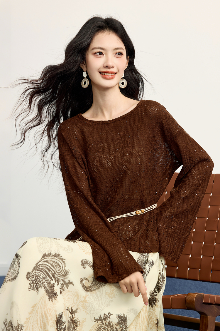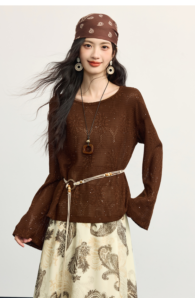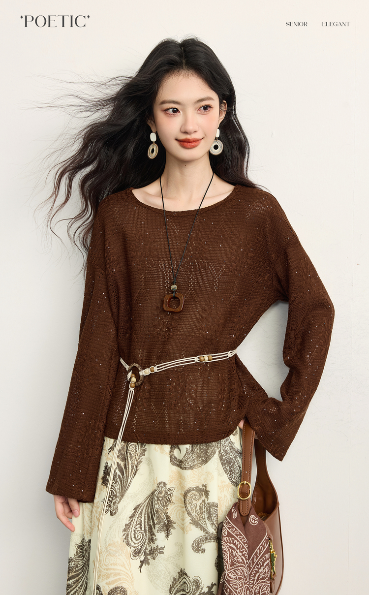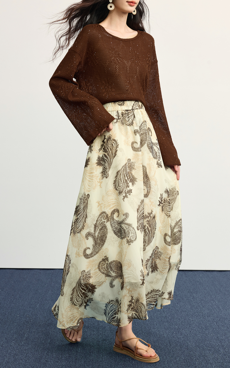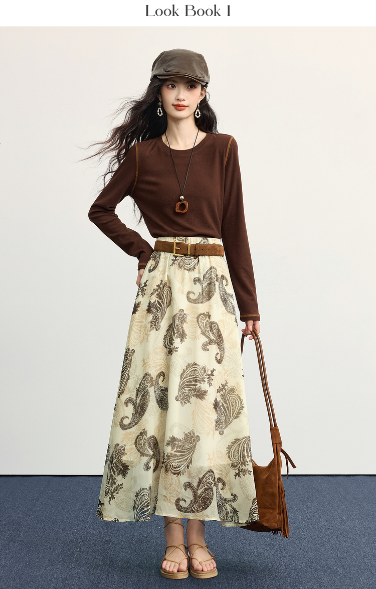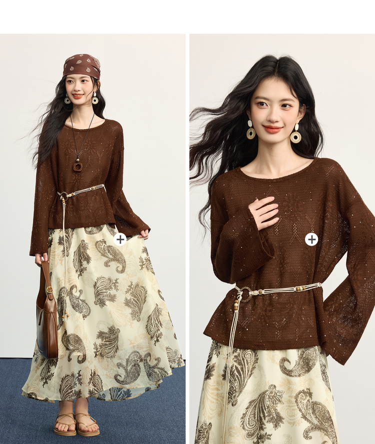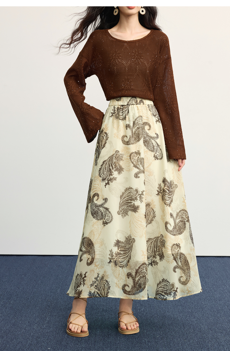 【周末秒杀】熙世界气质穿搭一整套女秋季复古亮丝针织衫腰果印花半身裙两件套