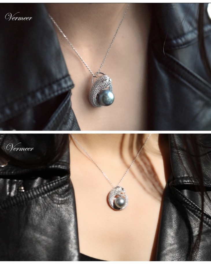vermeer大溪地海水黑灰珍珠奢华大气豹头款925银吊坠项链11-12mm 送妈妈