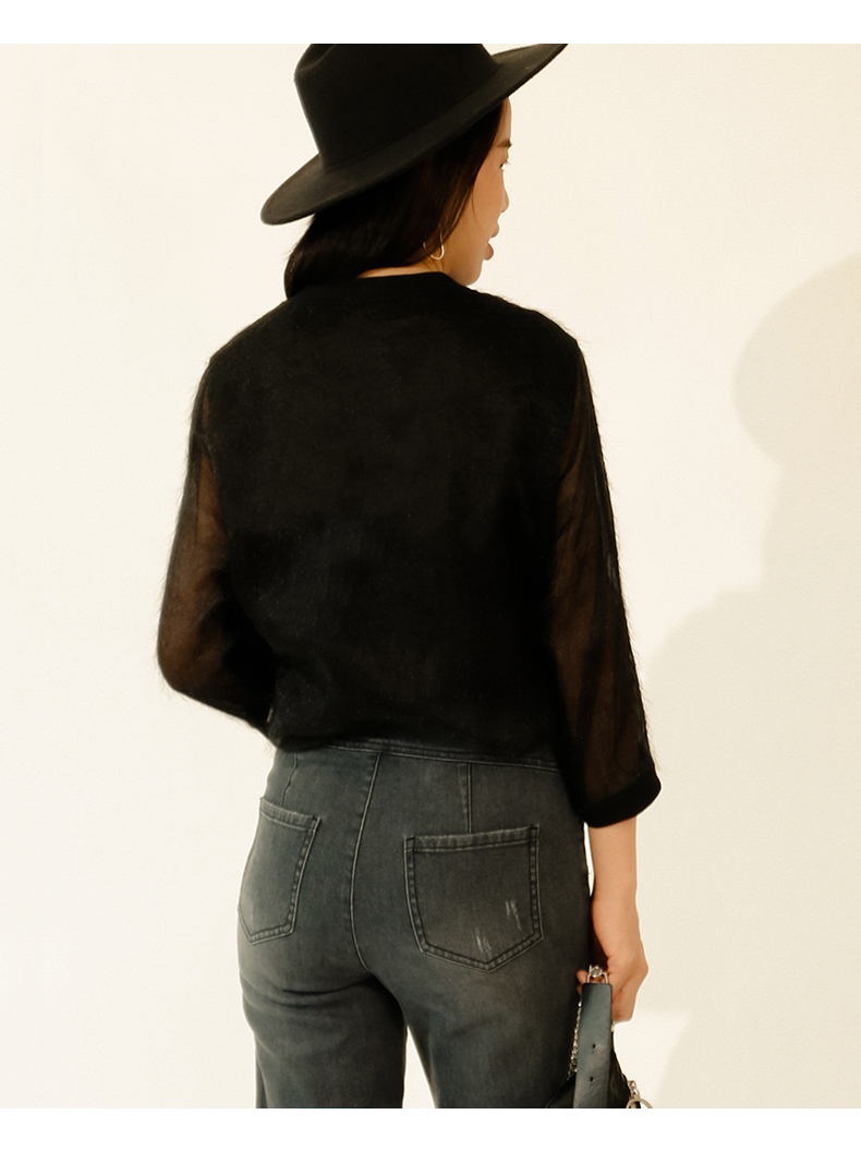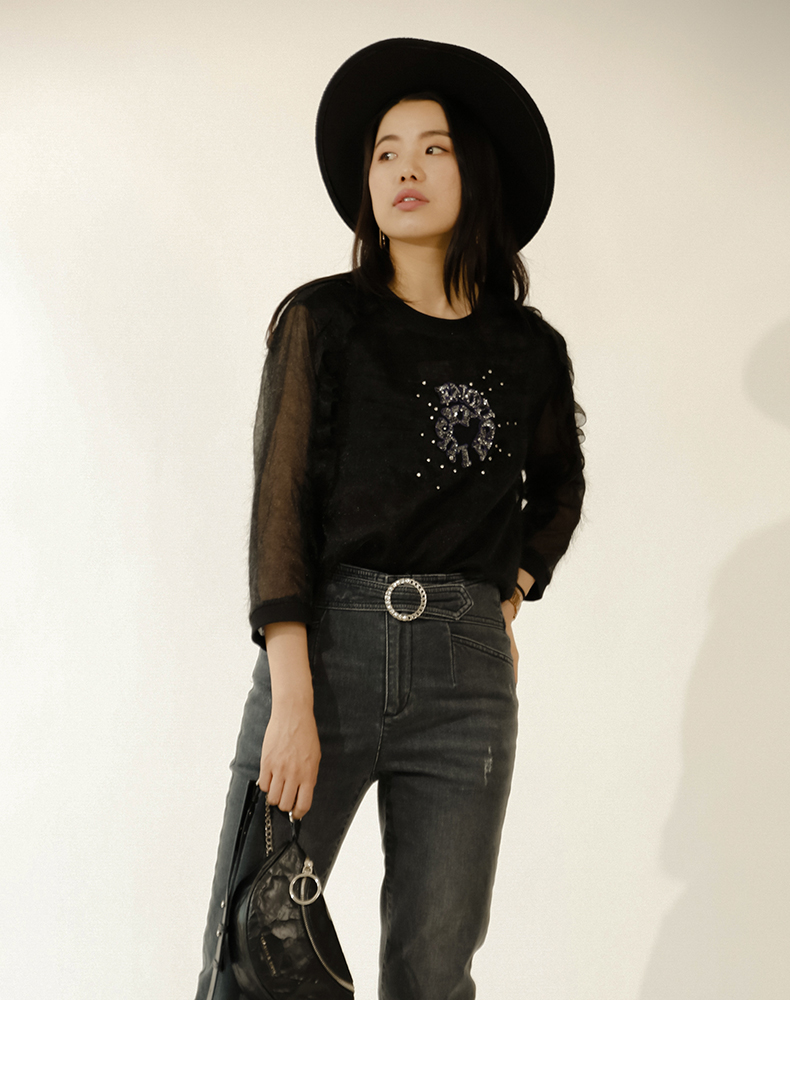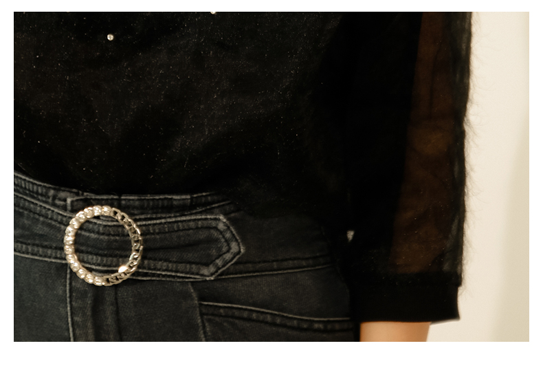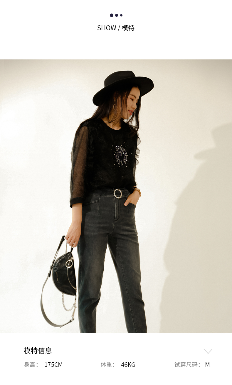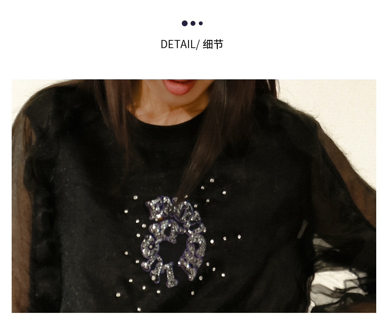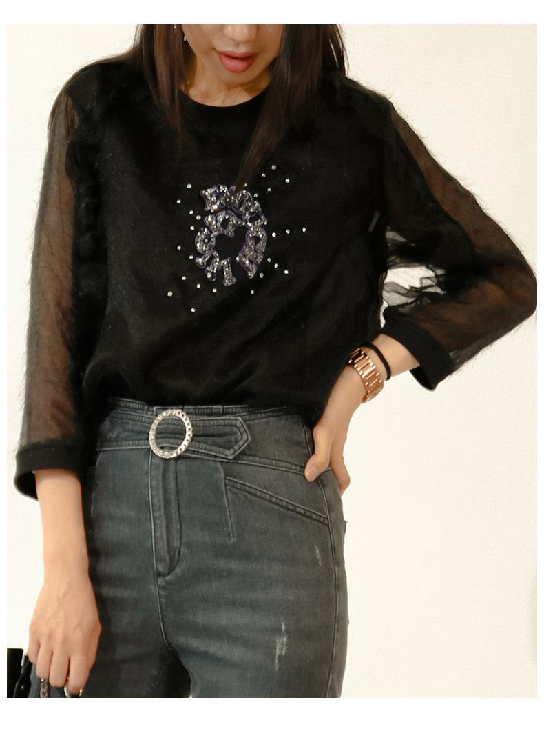 oldcolour欧珂秋网纱中袖套头衫黑色衬衫女M31012149