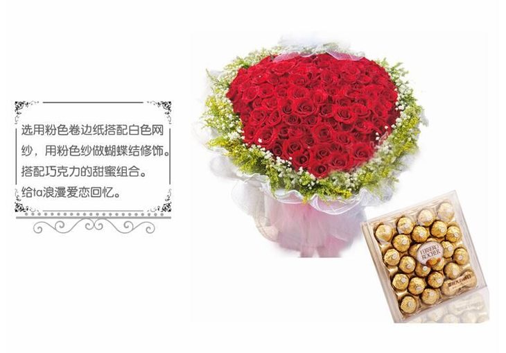 花材:99枝红玫瑰(心型),外围满天星、黄莺, 费列罗巧克力24颗装