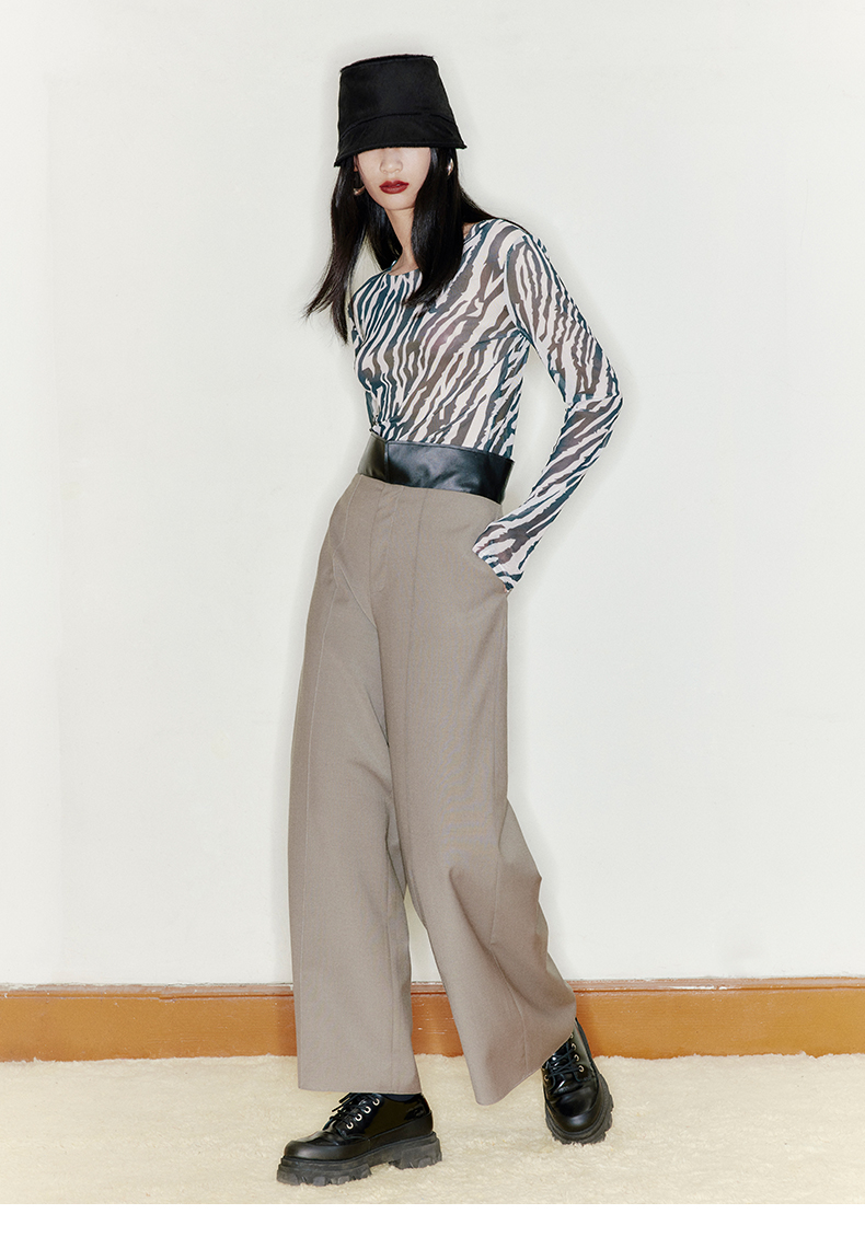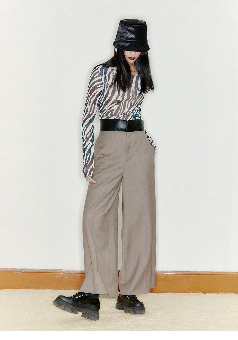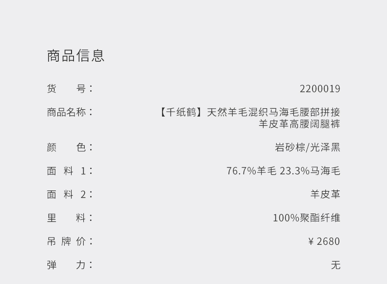 【千纸鹤】天然羊毛混织马海毛腰部拼接羊皮革高腰阔腿裤/2200019