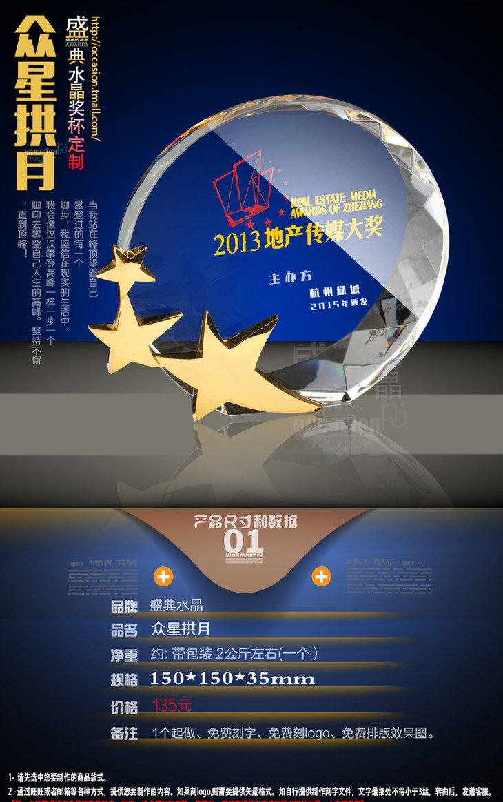 水晶奖杯创意金属五角星高档大气年会优秀员工颁奖纪念品