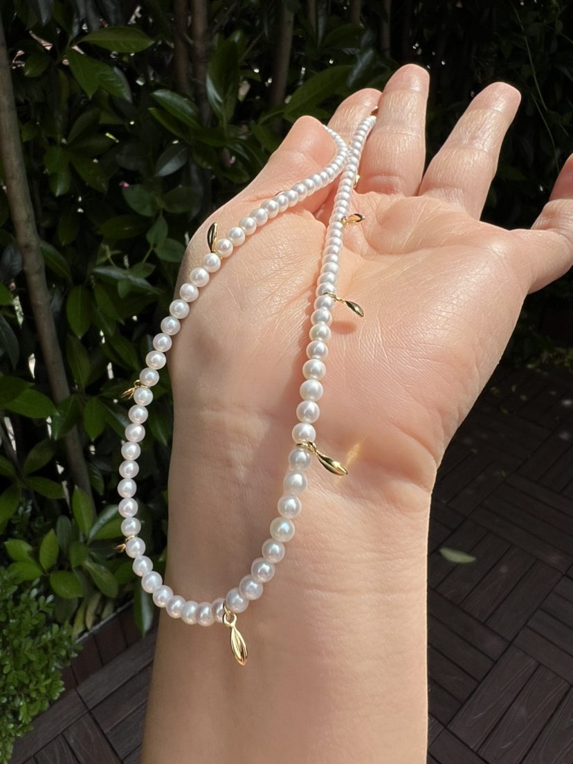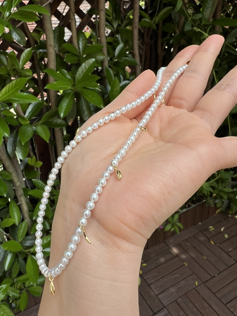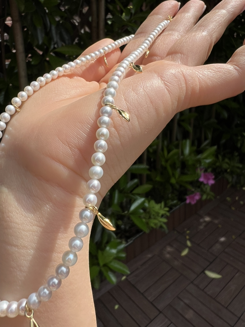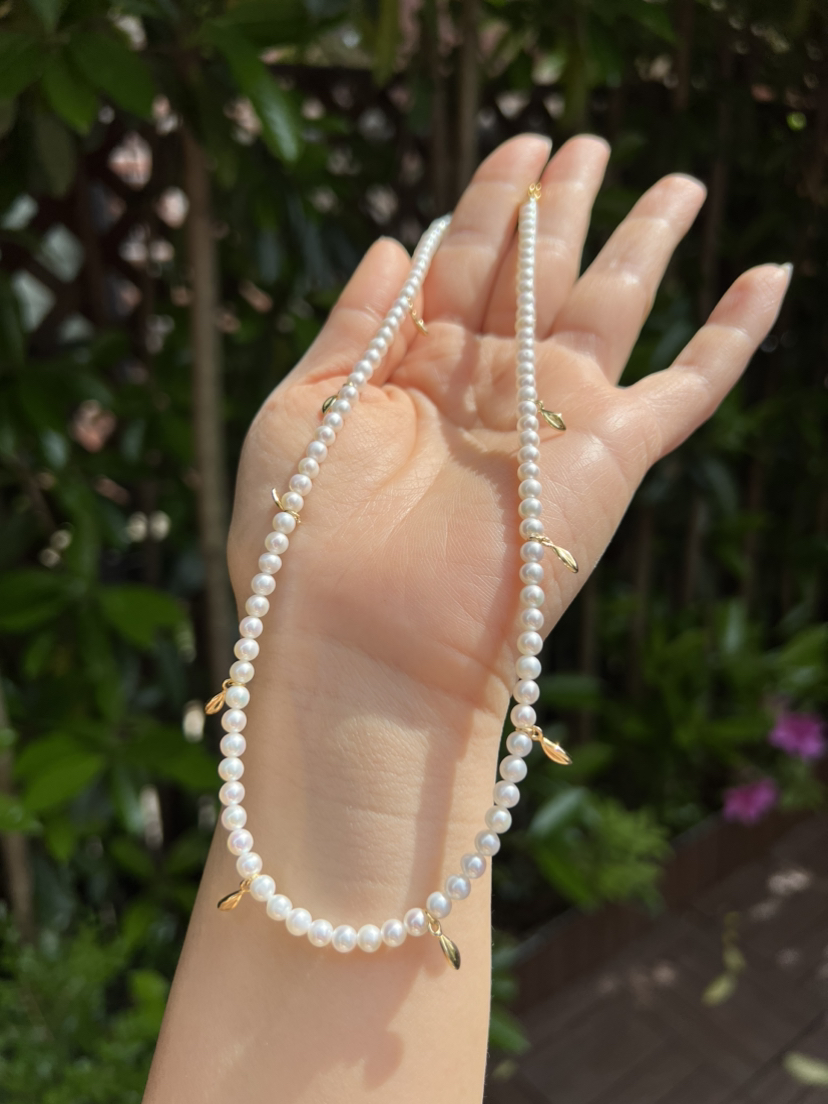 421-2 HF同款 事业有成 金叶子珍珠项链 4-4.5mmbaby珠 近正圆强光微瑕