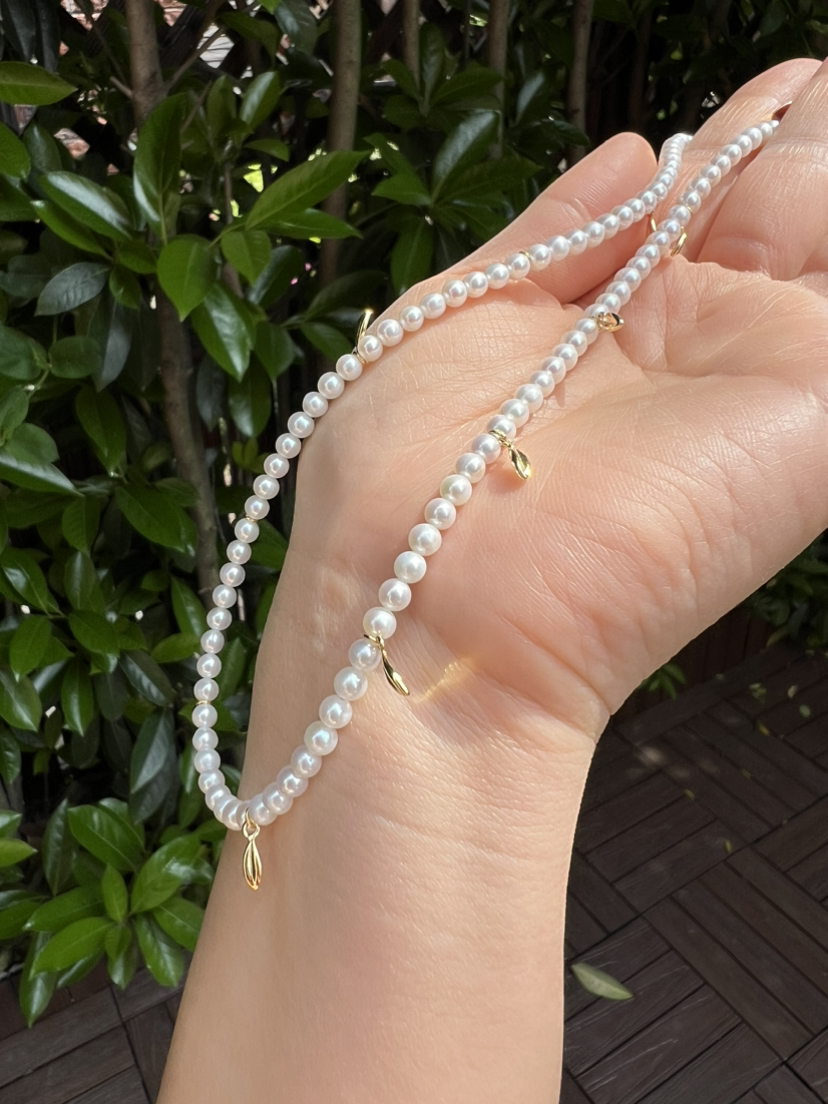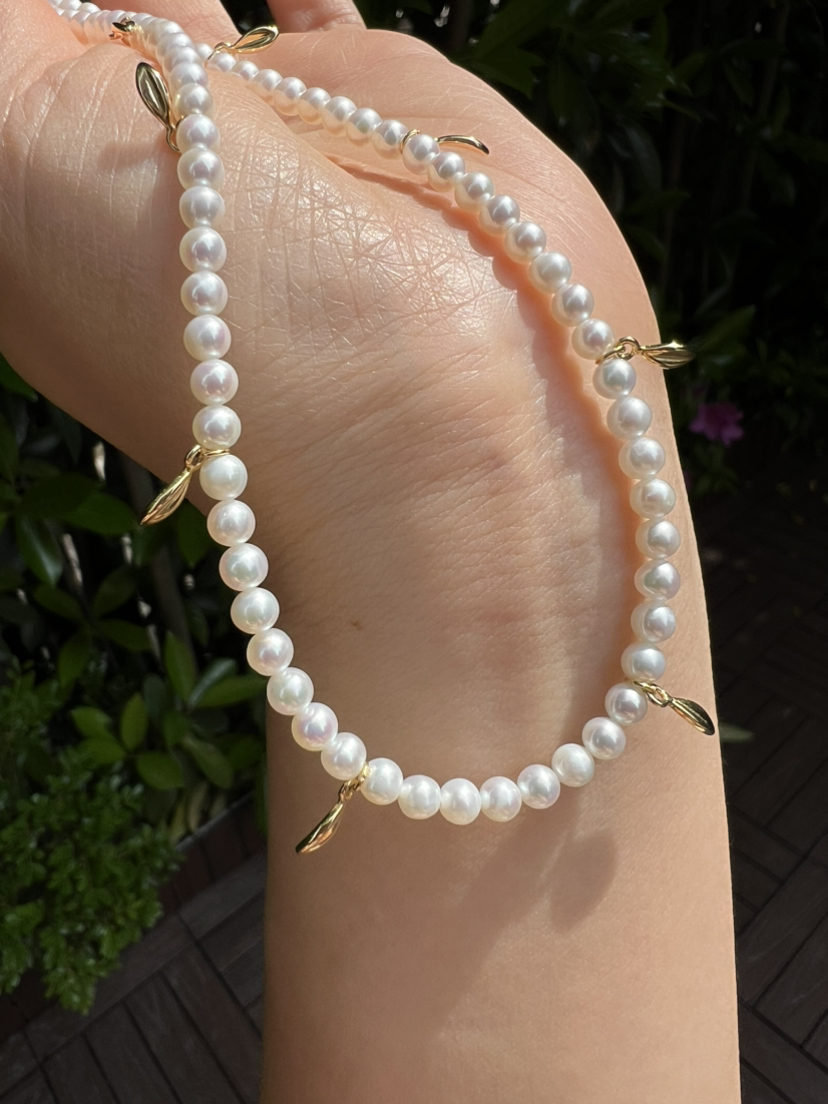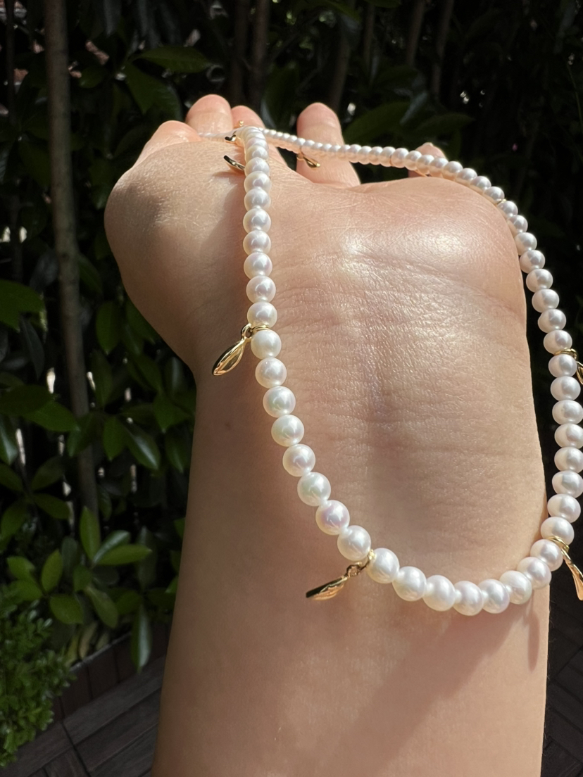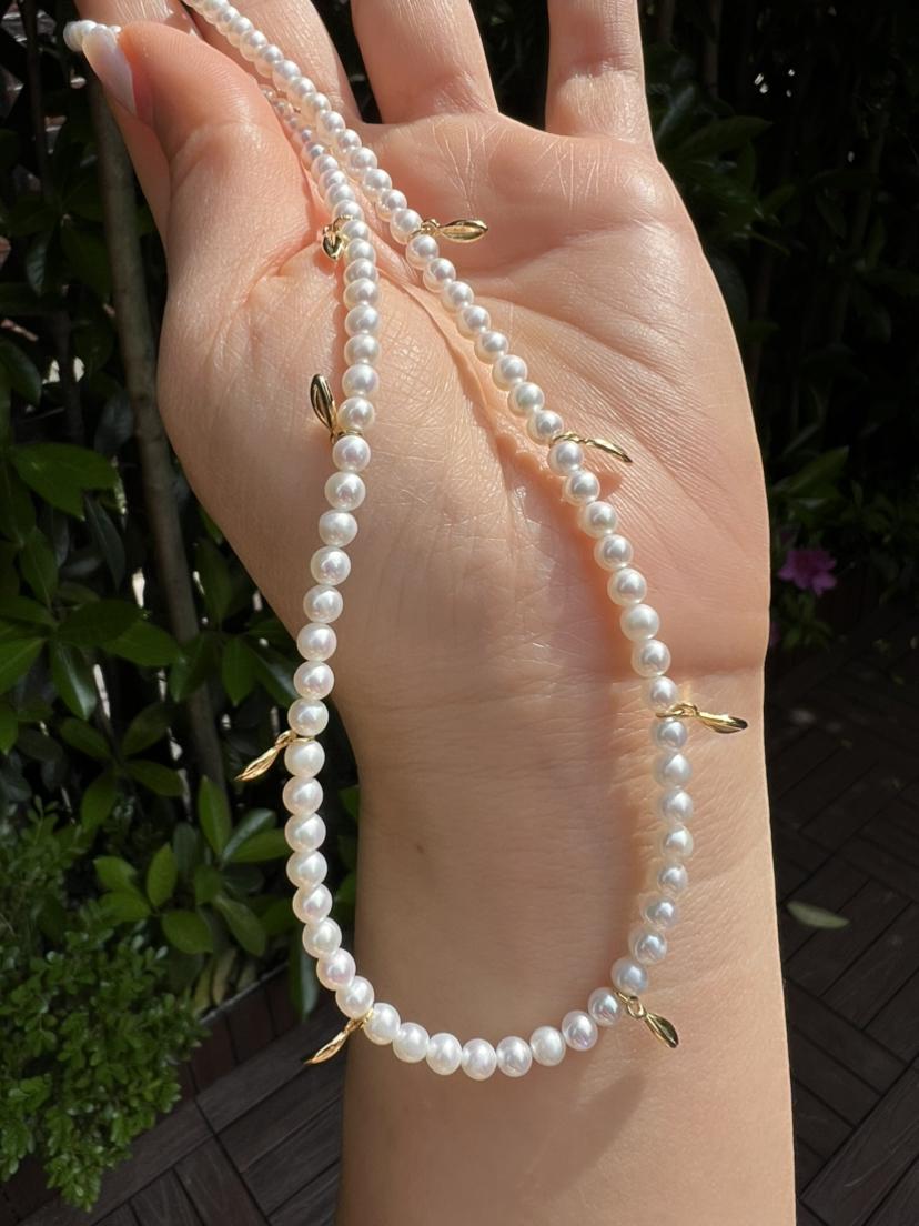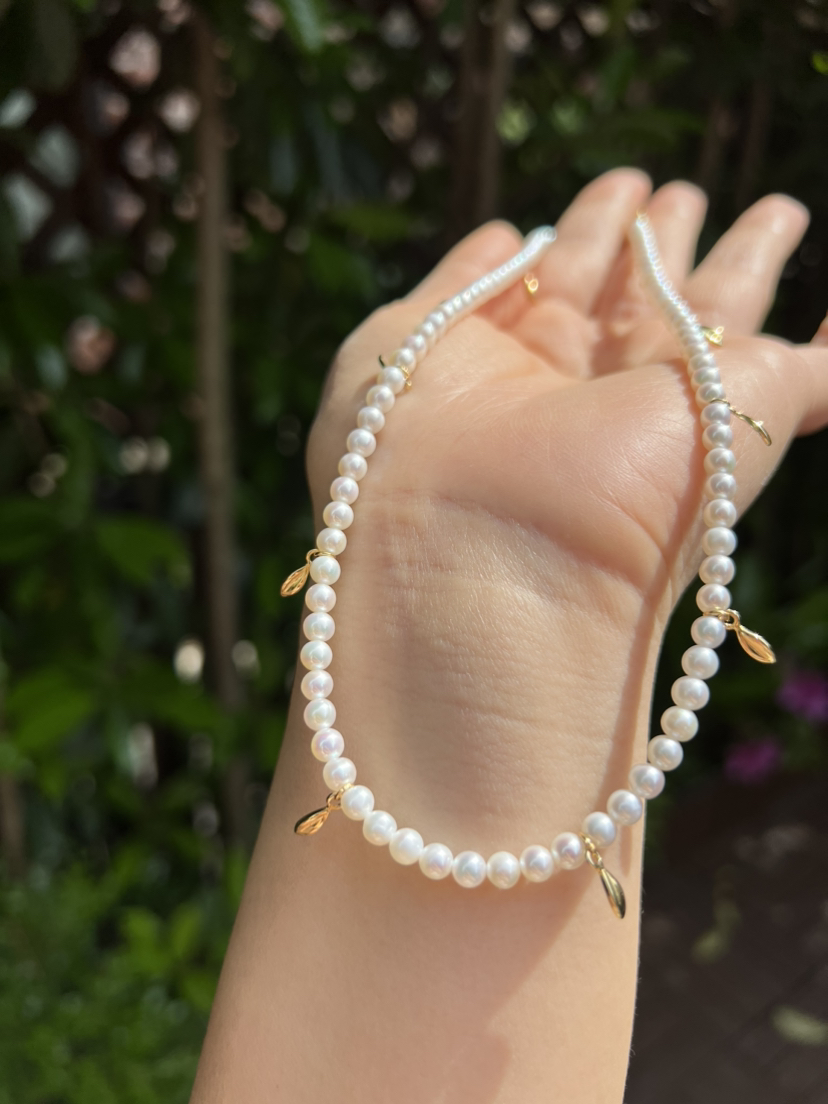 421-2 HF同款 事业有成 金叶子珍珠项链 4-4.5mmbaby珠 近正圆强光微瑕