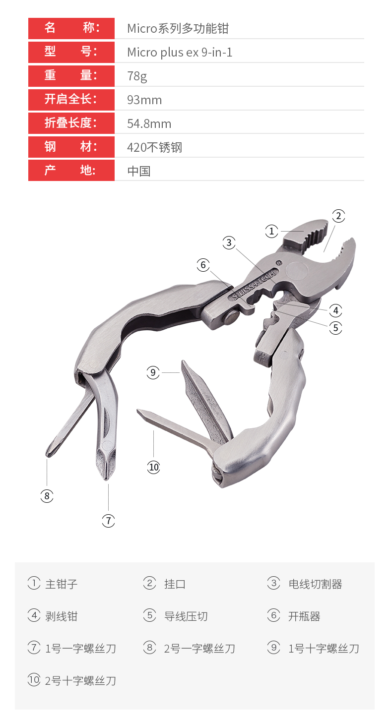 多功能工具钳子SWISS TECH瑞士科技户外9合1钥匙扣迷你折叠小装备