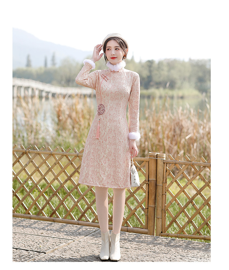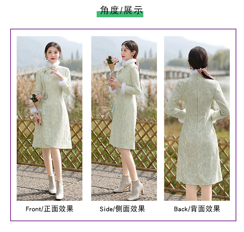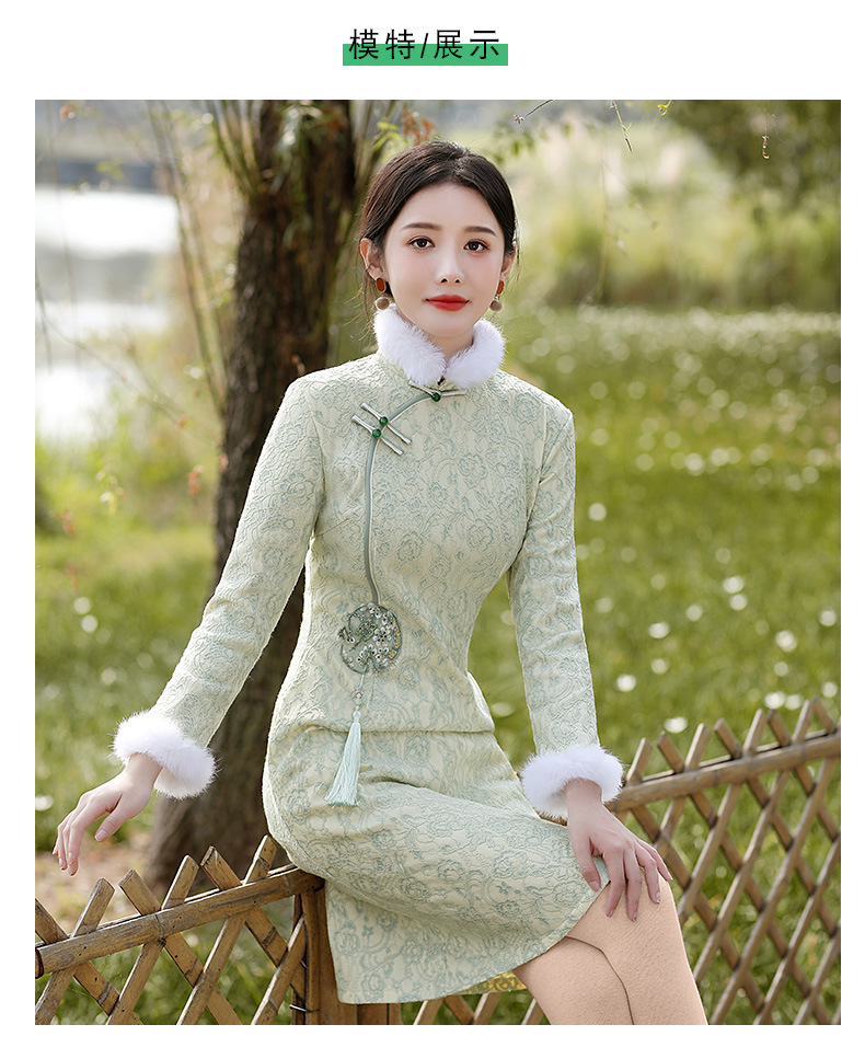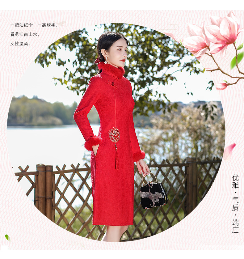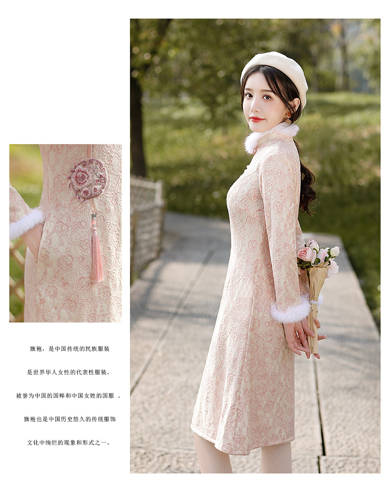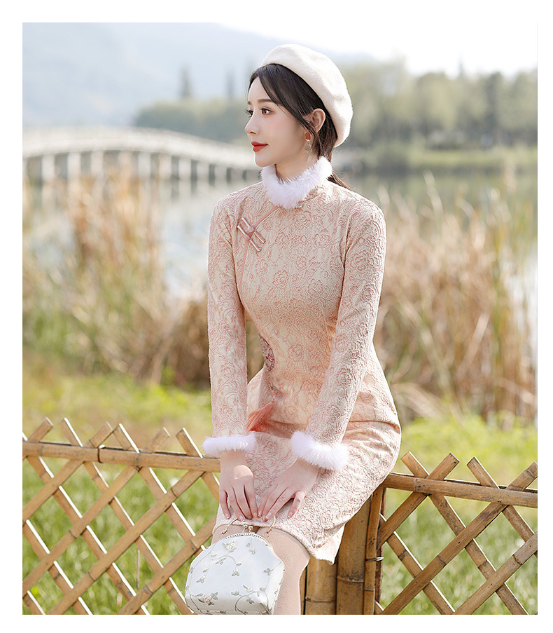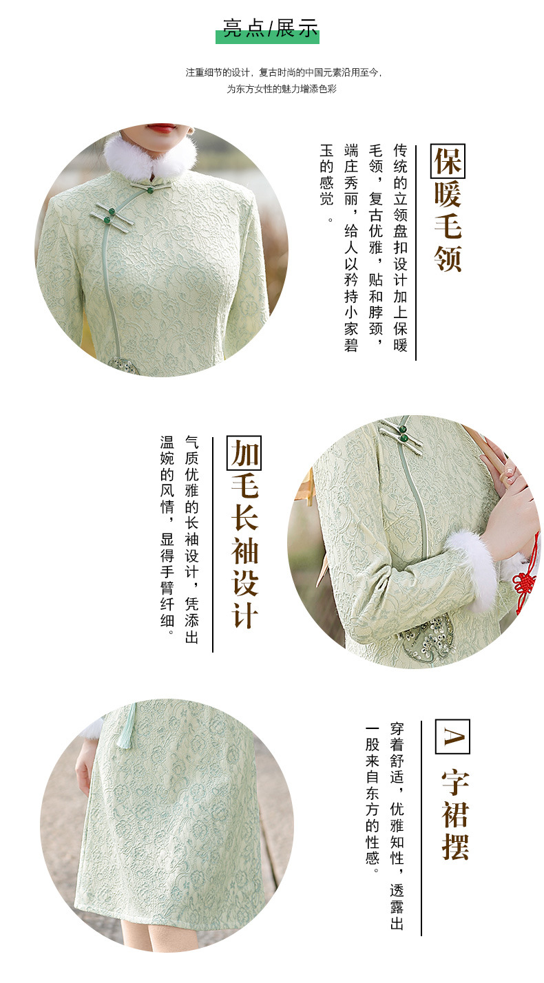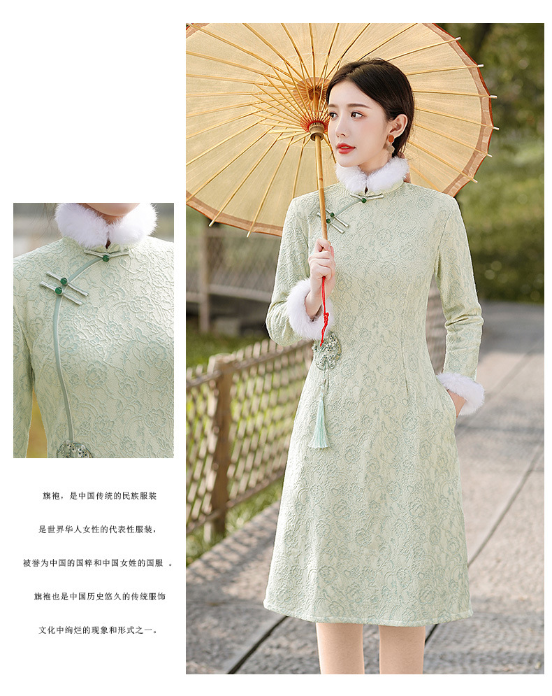 蕾丝加绒长袖保暖毛领日常旗袍 MLS6113