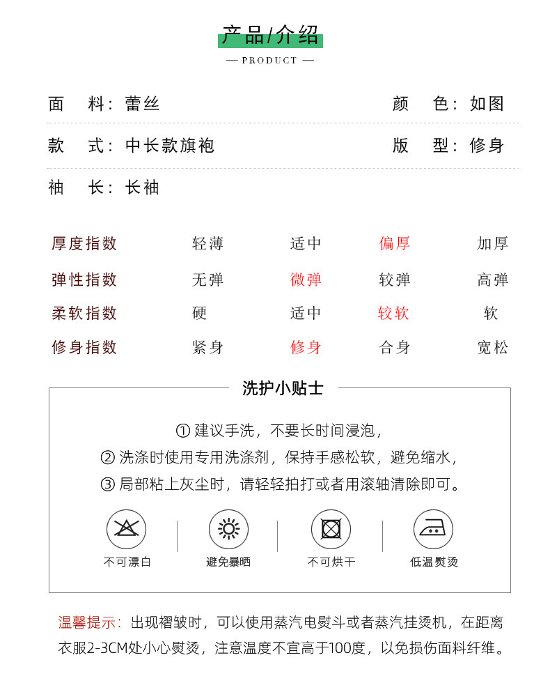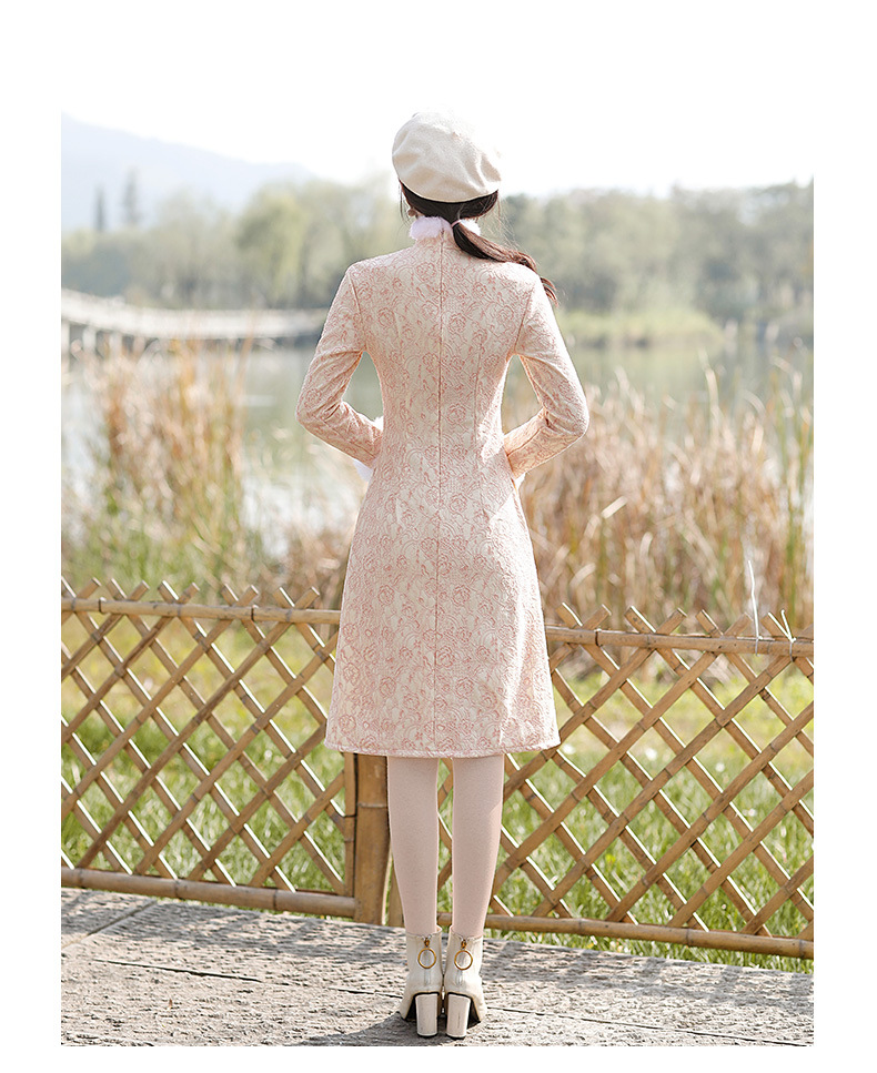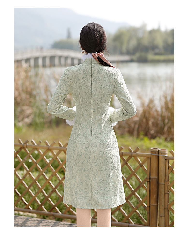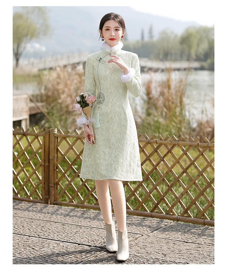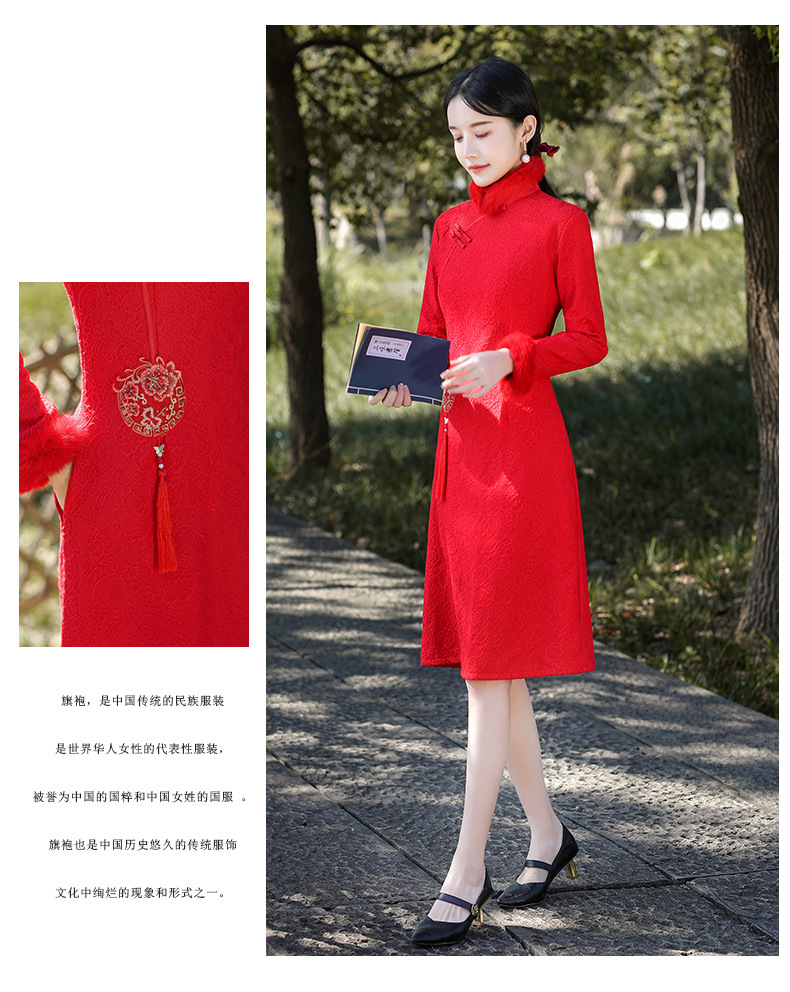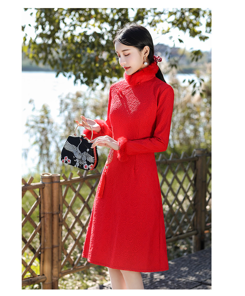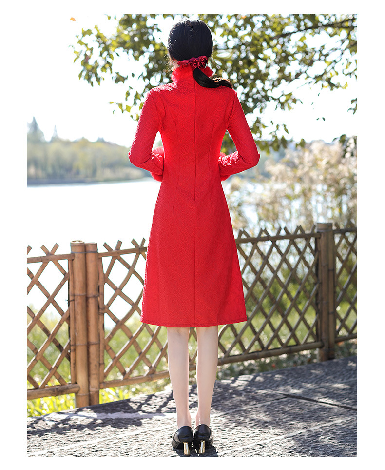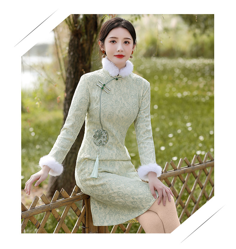 蕾丝加绒长袖保暖毛领日常旗袍 MLS6113